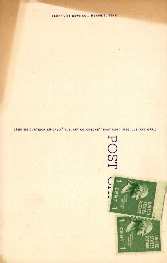 View of Confederate Park, Post Office, and Mississippi River under moonlight in Memphis, Tennessee. Genuine Curteich-Chicago postcard featuring stunning night scene.