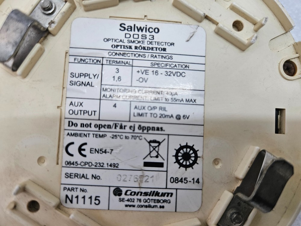 USED | CONSILIUM SALWICO DOS3 OPTICAL SMOKE DETECTOR N1115 The CONSILIUM SALWICO DOS3 Optical Smoke Detector N1115 is a smoke detector manufactured by CONSILIUM. It is designed for fire alarms and fire protection in industrial and commercial settings. This model uses optical technology to detect smoke particles in the air, providing an early warning system for potential fires.