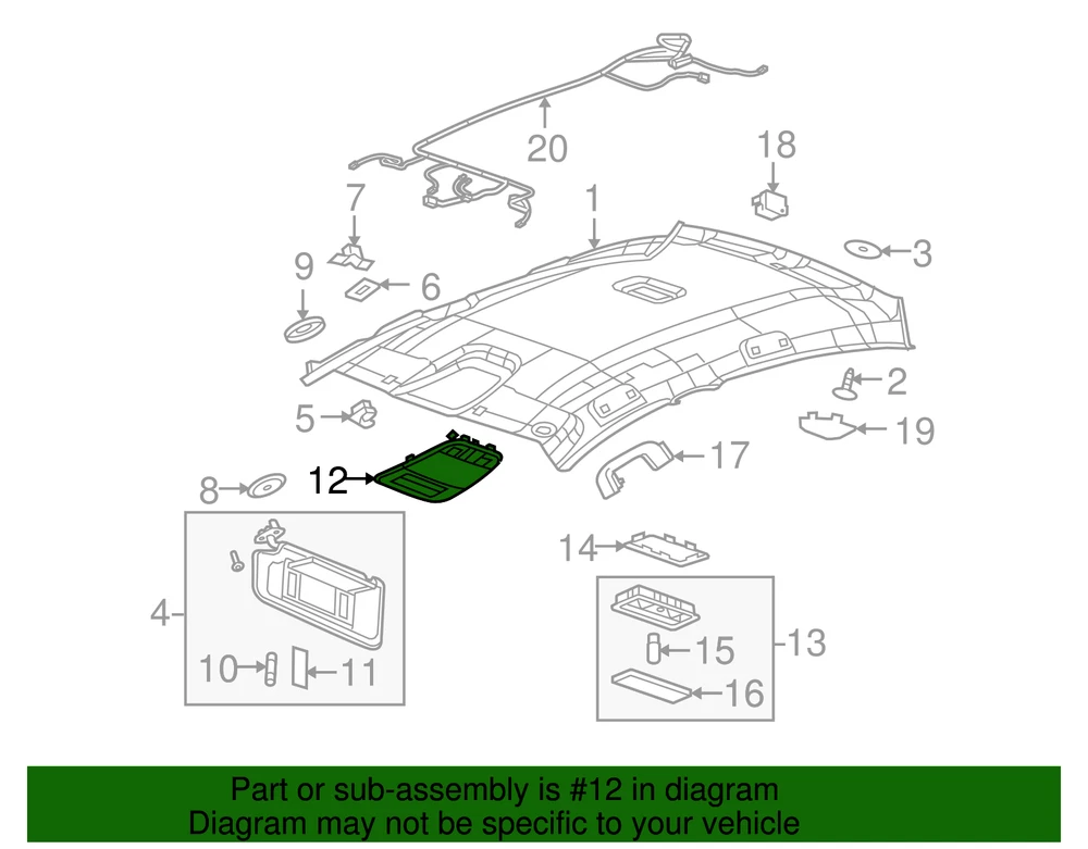 aaronchevrolet Genuine GM Light Cashmere Roof Console 09072823 Part can be found as # 12 in the diagram above Product Description Without sunroof, without garage opener cashmere. Helps make controls and stowed items easily accessible to the vehicle operator Helps enhance the interior look of the vehicle This GM Genuine Part is designed, engineered, and tested to rigorous standards and is backed by General Motors Collision parts are designed to help promote proper and safe repair Specifications Brand GM Manufacturer Part Number 09072823 SKU 09072823 Product Genuine GM Light Cashmere Roof Console 09072823 Replaces 09068956 ONLY PART REFERENCE #12 ON THE DIAGRAM IS INCLUDED WARNING : May cause cancer and reproductive harm. See www.P65Warnings.ca.gov for more info. Terms and Conditions Thank you for shopping with us. Please find our policies below. If you have any other questions, please don't hesitate to contact us. Shipping Terms If you are located in Alaska, Hawaii or Puerto Rico Please contact us via eBay email to discuss shipping cost In stock orders ship within 24 hours. Weekend orders will be processed the next business day. If a part is not in stock and must be ordered from the manufacturer, it usually takes 2-3 days to arrive to us and will be promptly shipped to you. Most of the orders are shipped complete within 2-3 business days. A few of the parts ordered from the manufacturer may take up to 5-6 business days to arrive and will shipped to you immediately. Depending upon location, ground shipments usually take 2-7 days. Your order may be shipped Overnight for an additional cost. Oversized shipments will be additional; you will be contacted prior to shipping for approval. We cannot guarantee transit times for ground and oversize orders. Shipping Carrier substitutions may be made at our determination in an attempt to reduce shipping cost to the customer. We do not ship internationally. In the unlikely event that a part has been placed on backorder or discontinued, we will do our best to try and find one for you as quickly as possible. We do not ship COD orders. Return Policy Contact us to arrange for any returns. A copy of the invoice will need to be included with the return. Parts must be resaleable and in the original packaging. We cannot take back used parts. We cannot take back installed or tried parts. Electrical parts are not returnable. We do reserve the right to refuse and return any parts we find have been installed, are used or do not meet the above criteria. Return request need to be within 30 days of receipt. Cancellation Policy An order or a portion of an order may be cancelled up until the time it is shipped and no longer in our possession. Home • Newsletter Signup • Contact Us Copyright © 2025 aaronchevrolet , All rights reserved. Solution by RevolutionParts, Inc. :: Design by OCDesignsOnline