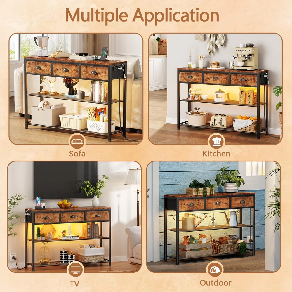 Console Table with Charging Station & 3 Fabric Drawers, 38'' Entryway Table with Storage Shelves and LED Light, Industrial Foyer Table for Entry Way, Display Shelf for Hallway, Rustic Brown Convenient Power Outlet & LED Light: The entryway table with storage drawers also equipped with 2 power outlets and 2 USB charging ports for your devices, makes it easy and convenient to charge your smartphone, gaming device or Bluetooth device. It can be installed on the left or right side as required. The LED light provides 20 changeable colors, 22 dynamic modes, 5 adjustable brightness levels, and 10 flicker frequencies. 3 Upgraded Fabric Drawers: The console table for entryway features easy-pull arch handles and 3 storage drawers, console table with drawers are made of high quality non-woven fabric that is lightweight, breathable, dustproof and provides ample storage space to keep your essentials organized and within reach. Sturdy & Stable Structure: The Long 38'' sofa table is made of high-quality particleboard and a durable metal frame for enhanced sturdiness and a load capacity, making it a reliable piece of furniture for your living room. Foyer tables for entryway is equipped with adjustable feet to help stabilize on uneven floors or carpets. Multi-functional Table: This versatile table also can be used as an accent table, couch table, foyer table, entrance table, bar table, display shelf, front door table, TV stand, plant stand, window table, coffee bar table station, hallway table for bedroom, Living room, kitchen, complementing various home décor styles. Space-saving Solution: Designed with a small footprint, this narrow console table is ideal for apartments or rooms with limited space. Its sleek and slim profile allows it to fit seamlessly into any corner, providing both style and functionality without taking up valuable floor space. 2 tiers open mesh shelves which good for heat dissipation, you can placing the DVD, TV BOX, XBOX, or other entertainment accessories.