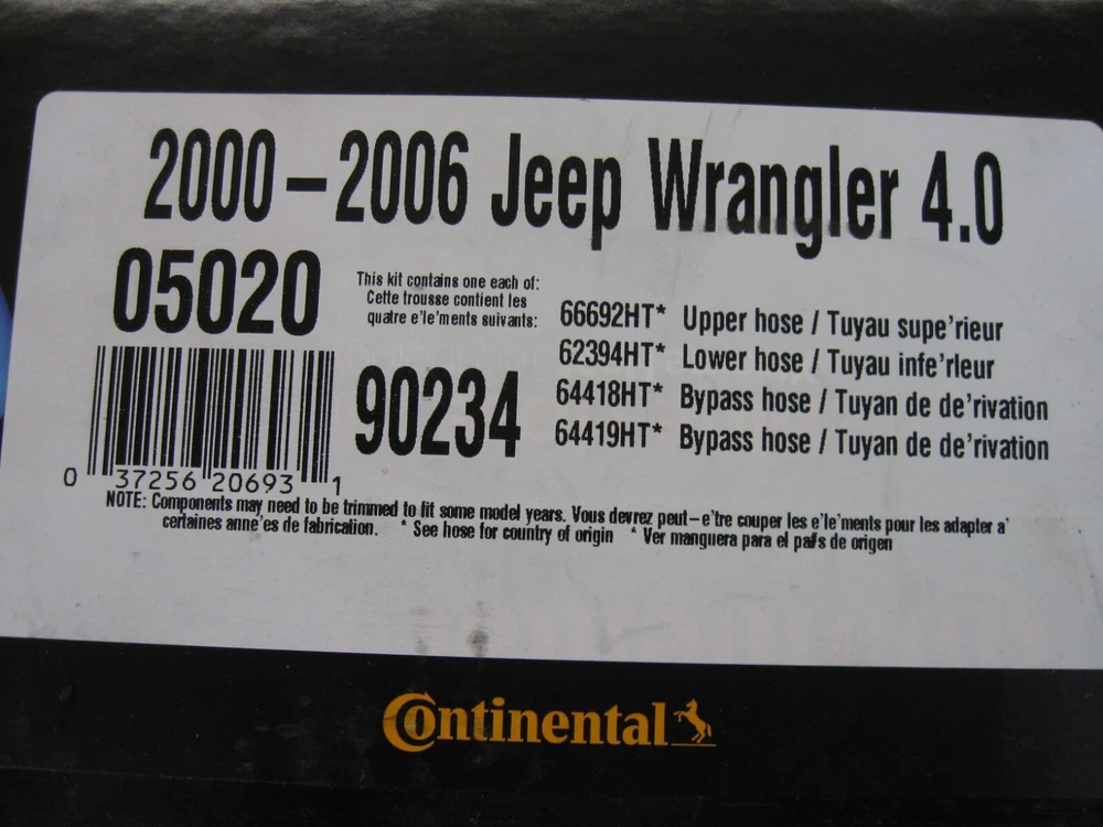 This is a listing for a Continental 5020 Blue Radiator Hose Kit fits 2000-2006 Jeep Wrangler 4.0L New Thank you for viewing our item. Please add us to your favorites list and check out all the available items we have in our store. As you can see by our feedback, we strive to make sure all of our customers are completely satisfied with their purchase. Please contact us with any questions or concerns prior to leaving negative feedback to allow us the opportunity to rectify any issues that may arise. All parts are new, and some are new old stock (including filters). Packages may have been opened for inspection and/or picture taking purposes. Floor mats and cargo trays may be rolled for shipping purposes. Additional parts aside from this item may be required to complete the applicable repair. Returns accepted within 30 days for refunds. Products returned must be in new, uninstalled condition in original packaging with the original label intact. Damaged, incomplete or installed items are not eligible to receive a full refund. No warranty is offered on any item.