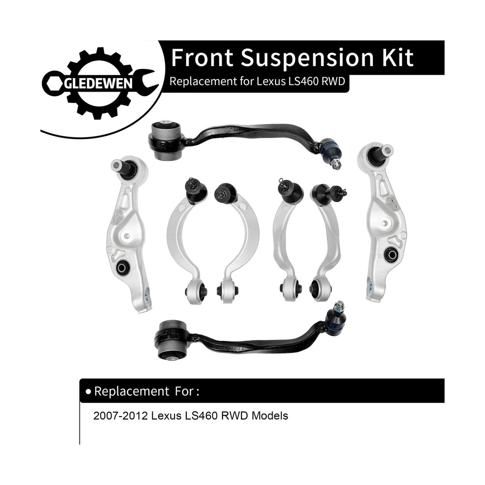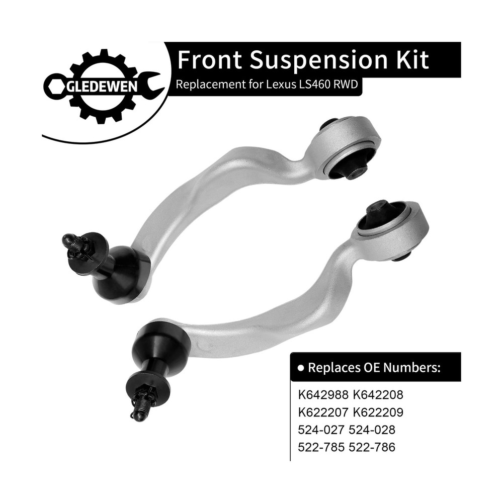 Control Arms, Suspension Kit, Compatible with 2007-2012 Lexus LS460 RWD, w/ Front & Left & Right & Lower & Upper & Rearward & Forward Control Arm w/ Ball Joint (8PCS), K642208 K642988 K622207 K622209 Description Packing List:1x K622209 Front Left Lower Forward Control Arm 1x K622207 Front Right Lower Forward Control Arm 1x K642208 Front Left Lower Rearward Control Arm 1x K642988 Front Right Lower Rearward Control Arm 1x 524-027 Front Left Upper Forward Control Arm 1x 524-028 Front Right Upper Forward Control Arm 1x 522-785 Front Left Upper Rearward Control Arm 1x 522-786 Front Right Upper Rearward Control ArmCondition: NewCompatible with:2007-2012 Lexus LS460 RWD ModelsPrecise Fit Part Numbers:K642988 K642208 K622207 K622209 524-027 524-028 522-785 522-786Installation notes: The suspension kit must be installed by professionals who need to carefully read important instructions shown in the picture. Please test in an empty area before getting back on the road.We are a factory direct sales. Customers can spend a small amount of money and get high quality brand control arm kit. This replacement kit provides excellent value at the cheapest price possible. If you are not sure this item will fit your vehicle, please email us your car photo or provide your vehicle's YEAR, MAKE, MODEL and ENGINE SIZE before you purchase this item. Features: Time for ReplacementPoor Control of Steering? Shaking Steering Wheel? Strange Abnormal Noises? Uneven Tire Wear? You are driving dangerously! Your control arm kit is time for a replacement. Our front suspension kit has undergone a rigorous testing, exactly OEM design to help you. Premium QualityOur suspension kits are manufactured from high-strength steel, with coating adds corrosion protection, have trustworthy performance, solid and durable. Under 96h salt spray tested before delivery. Fits For2007 2008 2009 2010 2011 2012 Lexus LS460 RWD Models Only front suspension assembly, to help make your vehicle steer easily, to help prevent abnormal tire wear. Works just like OEM, half the price. Replace OE NumberK642988 K642208 K622207 K622209 524-027 524-028 522-785 522-786. 8PCS Includes: 1x Front Left Lower Forward Control Arm, 1x Front Right Lower Forward Control Arm, 1x Front Left Lower Rearward Control Arm, 1x Front Right Lower Rearward Control Arm, 1x Front Left Upper Forward Control Arm, 1x Front Right Upper Forward Control Arm, 1x Front Left Upper Rearward Control Arm, 1x Front Right Upper Rearward Control Arm. Product Details: Brand: Gledewen Fit Type: Vehicle Specific Fit Auto Part Position: Front Color: Unfinished Cast Iron Material: Cast Iron Brand: Gledewen Fit Type: Vehicle Specific Fit Auto Part Position: Front Color: Unfinished Cast Iron Material: Cast Iron Orientation: Front Unit Count: 8.0 Count Automotive Fit Type: Vehicle Specific Fit Manufacturer: Gledewen Model: Lexus LS460 RWD Item Weight: 29.5 pounds Package Dimensions: 18 x 15 x 5.5 inches Item model number: Lexus LS460 RWD Exterior: Painted Manufacturer Part Number: GW-XLB15 Date First Available: August 4, 2022 Delivery We Do Not Ship Outside of the Continental US. Return Policy All items qualify for returns within 30 days of receipt. Seller is responsible for return shipping on any item that is not damaged. Feedback We take our reputation seriously, we buy and sell online, so we understand the value of trust. If you are unsatisfied with your order, please contact us and we will work with you to resolve it to your satisfaction.