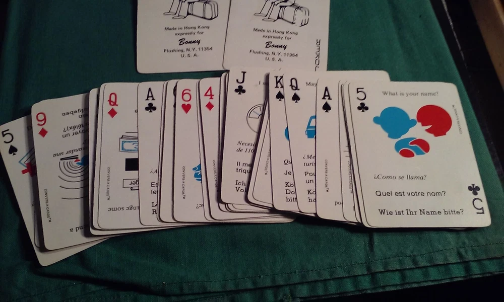Vintage Convers-A-Cards - Learn French German and Spanish while playing cards & Case, scarce. Language Translations on 52 Playing Card Deck. Full deck -- 52 cards plus Jokers -- with common phrases in German, French and Spanish. Made in Hong Kong expressly for: Bonny, Flushing N.Y.