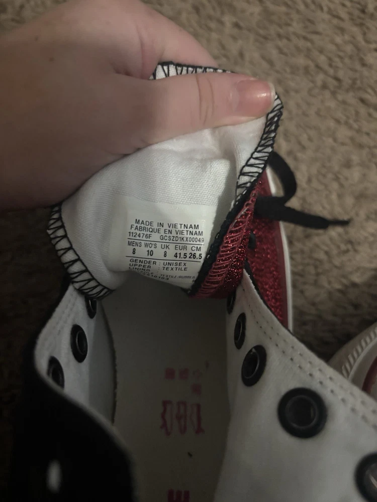 Upper Material:LeatherStyle:SneakerVintage:NoDepartment:Unisex AdultsClosure:Lace UpFeatures:ComfortCustomized:NoProduct Line:Converse Chuck Taylor All StarBrand:Chuck TaylorUS Shoe Size:8Type:CasualColor:RedCountry/Region of Manufacture:VietnamOutsole Material:Rubber