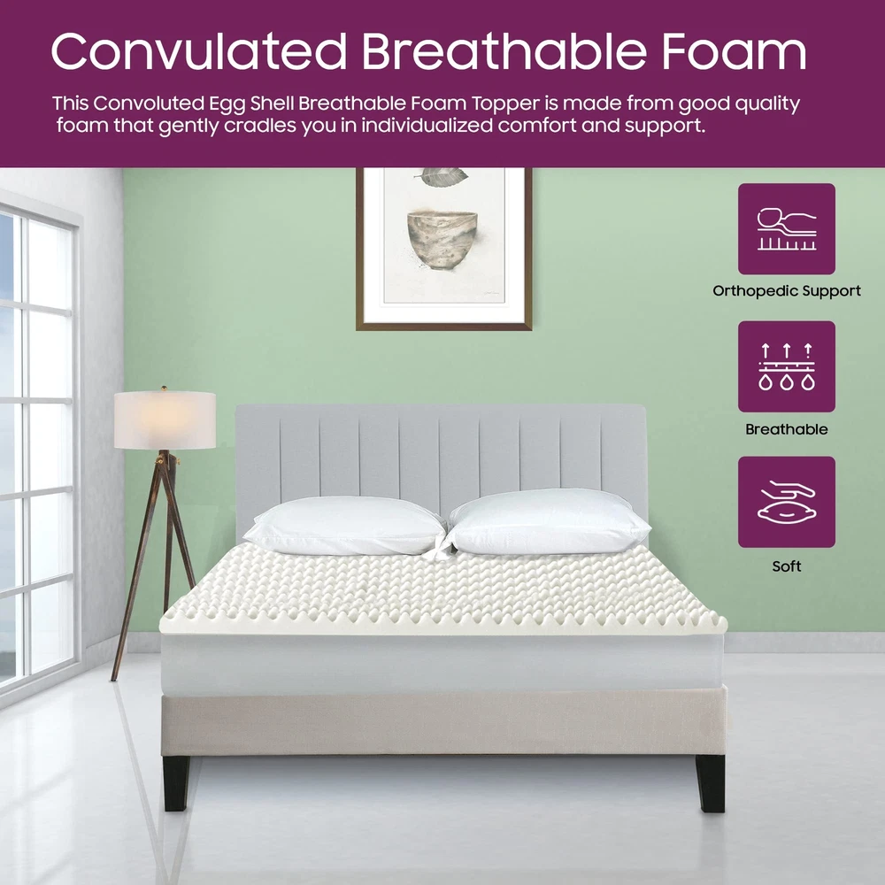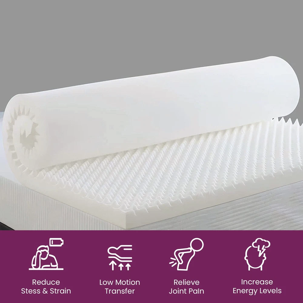 The premium foam adds luxurious softness while not taking away from the support of the mattress. These bed toppers have been effective in enhancing the comfort level of new and old mattresses alike, providing a better sleep experience for most people. This Convoluted Egg Shell Breathable Foam Topper is made from good quality foam that gently cradles you in individualized comfort and support. It also provides you with pressure-relieving cushioning in the hip and shoulder areas while still supplying enough support, so the body doesn't get imbalanced. These unique mattress toppers are to be used on top of your mattress for additional comfort. This prevents your body from sinking and curling while sleeping and promotes a better posture, which reduces and strain on your spine and increases energy levels during the day. Our premium-level mattresses are here to help you get the best possible comfort at all times when you sleep or lie down to relax. Pressure : The convoluted design of the foam helps to distribute weight evenly, which can help reduce pressure points on the body. This can be particularly helpful for people who suffer from joint pain or other conditions that make it difficult to get comfortable in bed. Increased comfort: The convoluted design can also make the mattress topper feel softer and more comfortable, which can lead to a more restful night's sleep. CertiPUR-US certified foam: Rest easy knowing that the topper's foams are CertiPUR-US certified, meeting stringent standards for durability, performance, and content. Quality you can trust. Motion isolation: The convoluted foam design can help to absorb movement, which can be helpful for people who share a bed with a partner. This can prevent motion from transferring across the bed and disturbing the other person's sleep. Versatility: Convolute foam mattress toppers are making them versatile and suitable for use with different types of mattresses. Toppers can be used on a variety of surfaces, such as futons or camping cots, to provide extra cushioning and comfort.