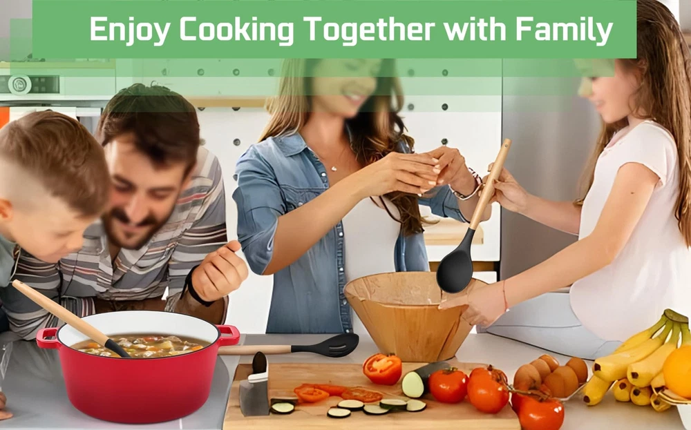 Black Silicone Cooking Kitchen Utensil with Wood Handle Set of 6 are made of food-grade silicone and wood, Without harmful substance leaching into your food, Can bear high temperature up to 446°F/230°C. All pieces utensils are friendly for your non-stick cookware and protect nonstick cookware for long serving time. The kitchen utensils with non-stick surface are easy to clean. The different options you will have with this set and meet your different cooking needs. An economical choice for your family. Specification: Material: Silicone, Wood Quantity: 6 Pcs Color: Black, Wood Tone 6-Piece kitchen utensil kit includes: 1 x Pasta server: 1 x Soup ladle 1 x Slotted turner 1 x Solid turner 1 x Solid spoon 1 x Slotted spoon Craft: Humanized handle, Hang loop, Smooth Features: Non-toxic, Heat-proof, Non-stick, Non-scratch, Easy clean and storage Why Choose Our Black Silicone Kitchen Cooking Utensil with Wood Handle Set of 6? 1. Silicone kitchen utensils’ head are made of food-grade silicone, can bear high temperature up to 446°F/230°C. 2. Smooth and soft silicone head won’t scratch the nonstick cookware. 3. The silicone cooking utensils includes 6 different utensils for many kinds of functions. 4. Ergonomic soft-grip handle with non-slip design can help you cooking better. 5. Small loop is convenient to hang on the wall, Easy to take and save space. Using Instruction: 1. Please wash the utensils before the first use. 2. Please soak them in warm water, wash by mild soap and hand dry after cleaning, store them in the dry place. 3. Please do not scratch the surface with wire balls or sharp tools. 4. Please do not expose to open flames. FOOD GRADE MATERIAL: The kitchen utensils set is made of healthy food grade silicone and wood without harmful substances, No odd smell or leave any other material taste and would not affect the taste of your foods, You can mix and stir it directly into the cookware, Safe and healthy for daily cooking use HEAT-PROOF & NON-SCRATCH: The silicone cooking utensils withstand high temperatures up to 446°F/230°C, Not easy to melt or burn when directly in the high temp, A good alternative choice sturdier than plastic and rubber utensils, Silicone head is scratch-proof and protects your non-stick pans, Extend the lifespan of your kitchen cookware THOUGHTFUL DESIGNS: The soft silicone head bond with wooden handle design makes the utensil firm and not easily breaking off or falling apart, Smooth wooden handles gives you a comfortable grip, Won’t hurt your hands, Modern black and natural wood tone combination decorates your kitchen MULTIFUNCTIONAL KITCHEN TOOLS: Silicone cooking utensil set includes 6 different kitchen utensils set meet many kinds of your cooking needs, Includes slotted and solid turner, deep soup ladle, solid serving spoon, slotted spoon, pasta server, For cooking, turning, serving, mixing, and more, Great tools for kitchen daily use EASY TO CLEAN & EASY STORAGE: The cooking utensil with non-stick surface, Easy to clean up by hand, Every end of the silicone utensil has a hanging loop helps effortless hanging on the hooks, Also ideal for storing in the utensils holder or kitchen drawer, Won’t take up a lot of space