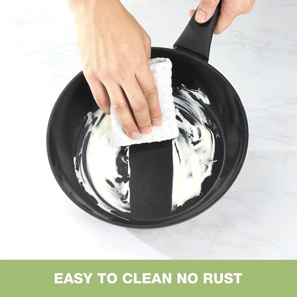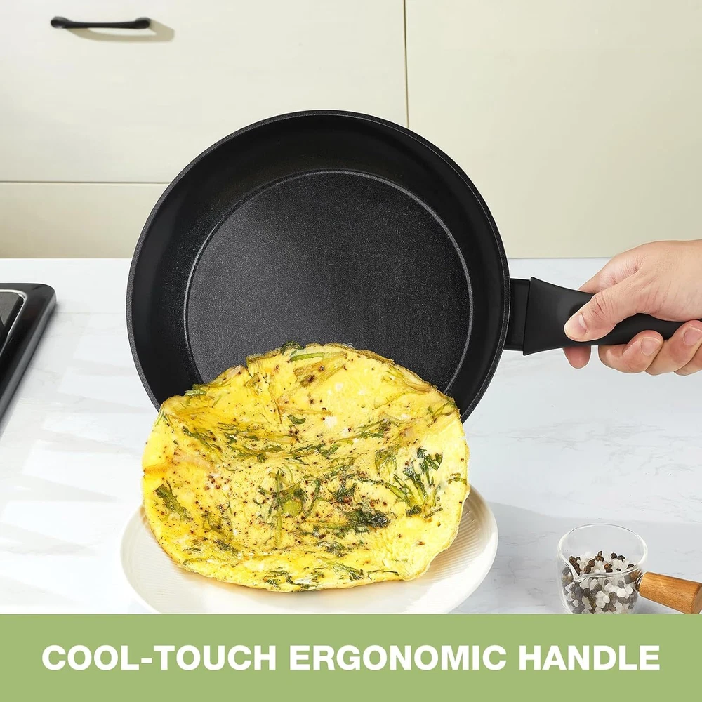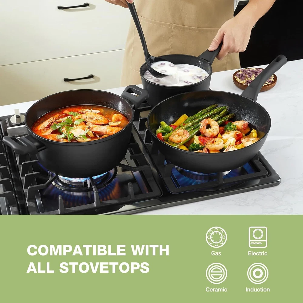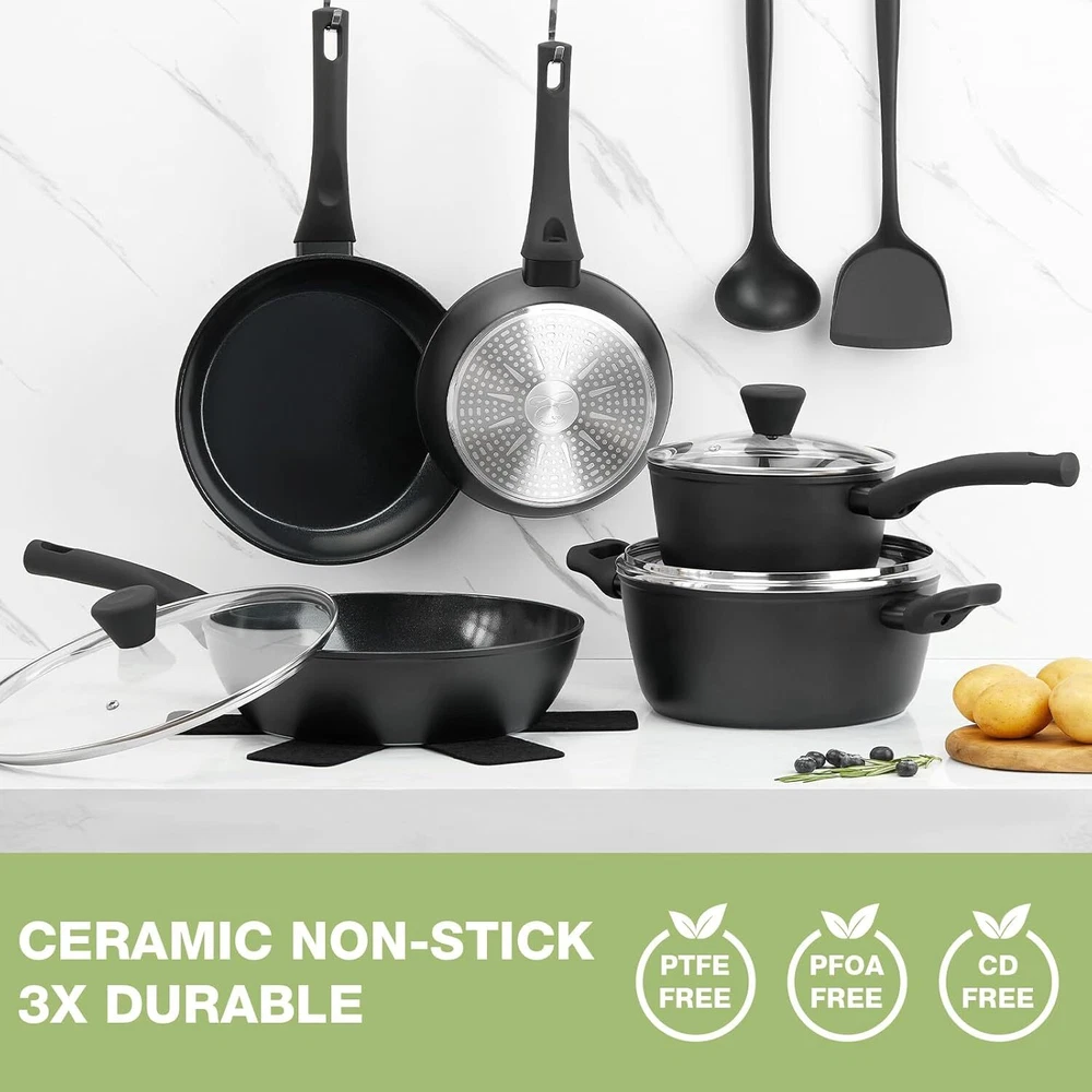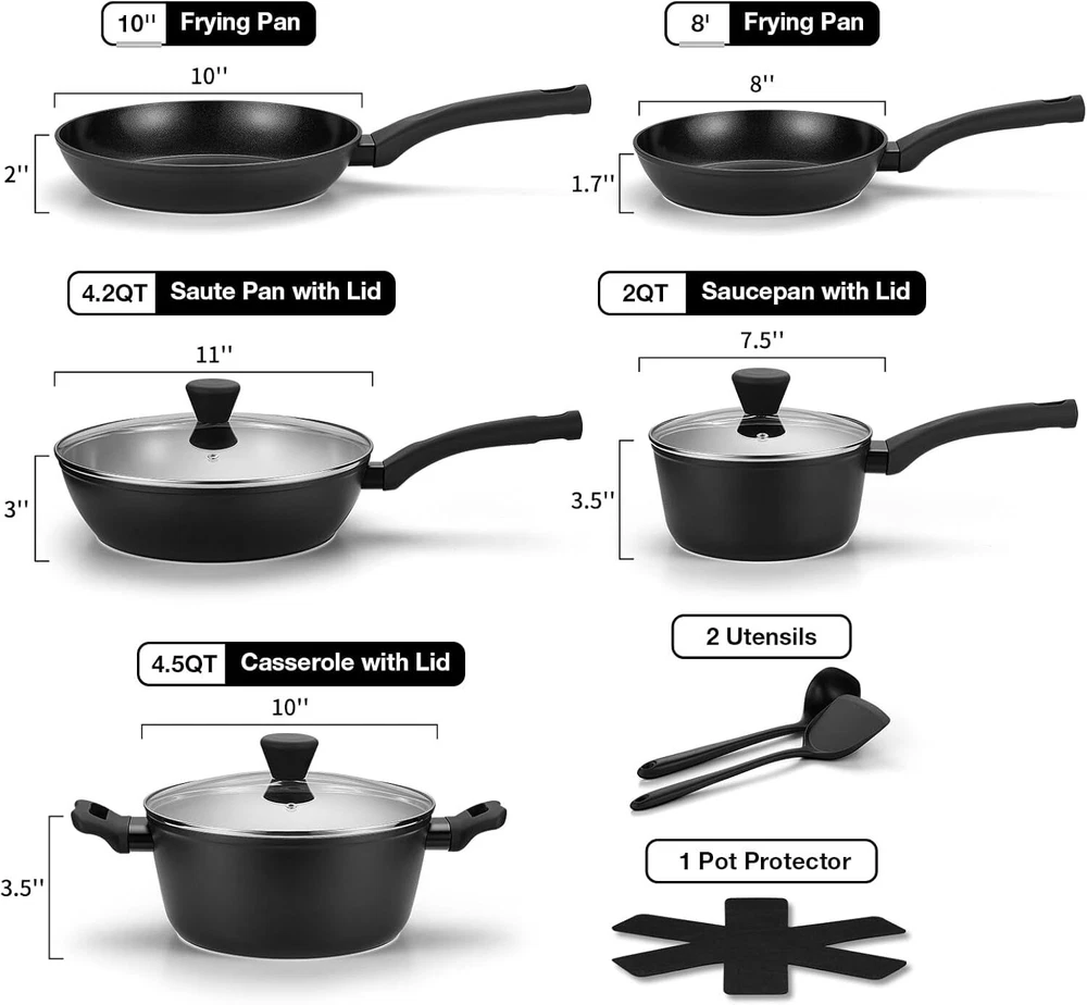 Healthy Nonstick Ceramic Cookware: Our pots and pans are crafted for a safer cooking experience, made with 100% PTFE, PFOA, and PFAS-free materials. The ceramic coating is 3X more durable, designed to resist peeling and built to last through daily use. Complete 11-Piece Set Includes: Everything you need for versatile cooking—an 8-inch frying pan, 10-inch frying pan, 2QT saucepan with lid, 4.2QT sauté pan with lid, 4.5QT casserole pot with lid, 2 multi-purpose utensils, and 1 pot protector to keep your cookware in great condition. Hassle-Free Cleaning: Our cookware is engineered with a nonstick, rivet-free surface, making clean-up incredibly simple. Just wipe it down with a paper towel or give it a quick rinse, and your pots and pans will look as good as new, even after repeated use. Cool-Touch Ergonomic Handles: The heat-resistant silicone handles are designed for comfort and safety. They stay cool while you cook, resist burning and discoloration, and offer a secure, comfortable grip. Compatible with All Stovetops: Whether you’re cooking on gas, electric, ceramic, or induction stovetops, our cookware’s high magnetic conductive stainless steel base ensures quick and even heat distribution, eliminating those frustrating hot spots. Worry-Free Guarantee: At PekGema, we’re committed to your satisfaction. If you have any issues or concerns, simply reach out to our customer service team. We’re here to make sure your experience is hassle-free.