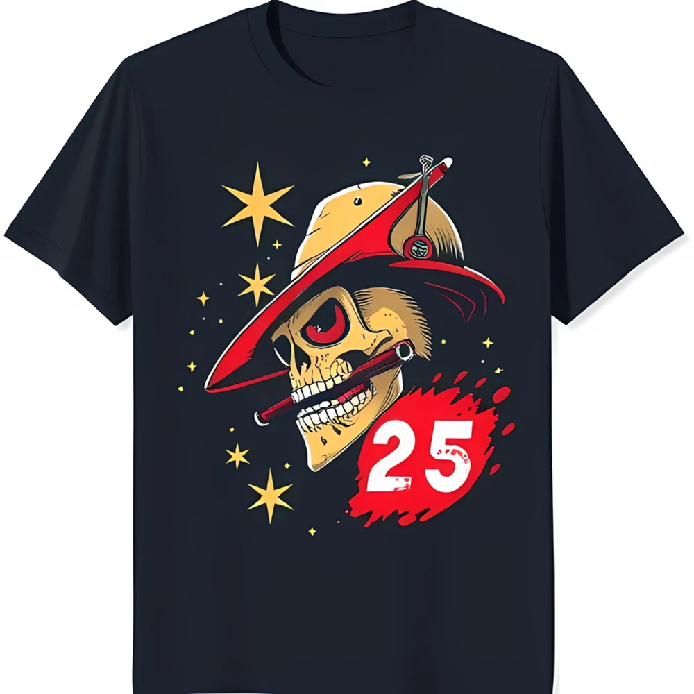 Cool Black T-Shirt with Cartoon Graphic Red Hat & 25 Stars