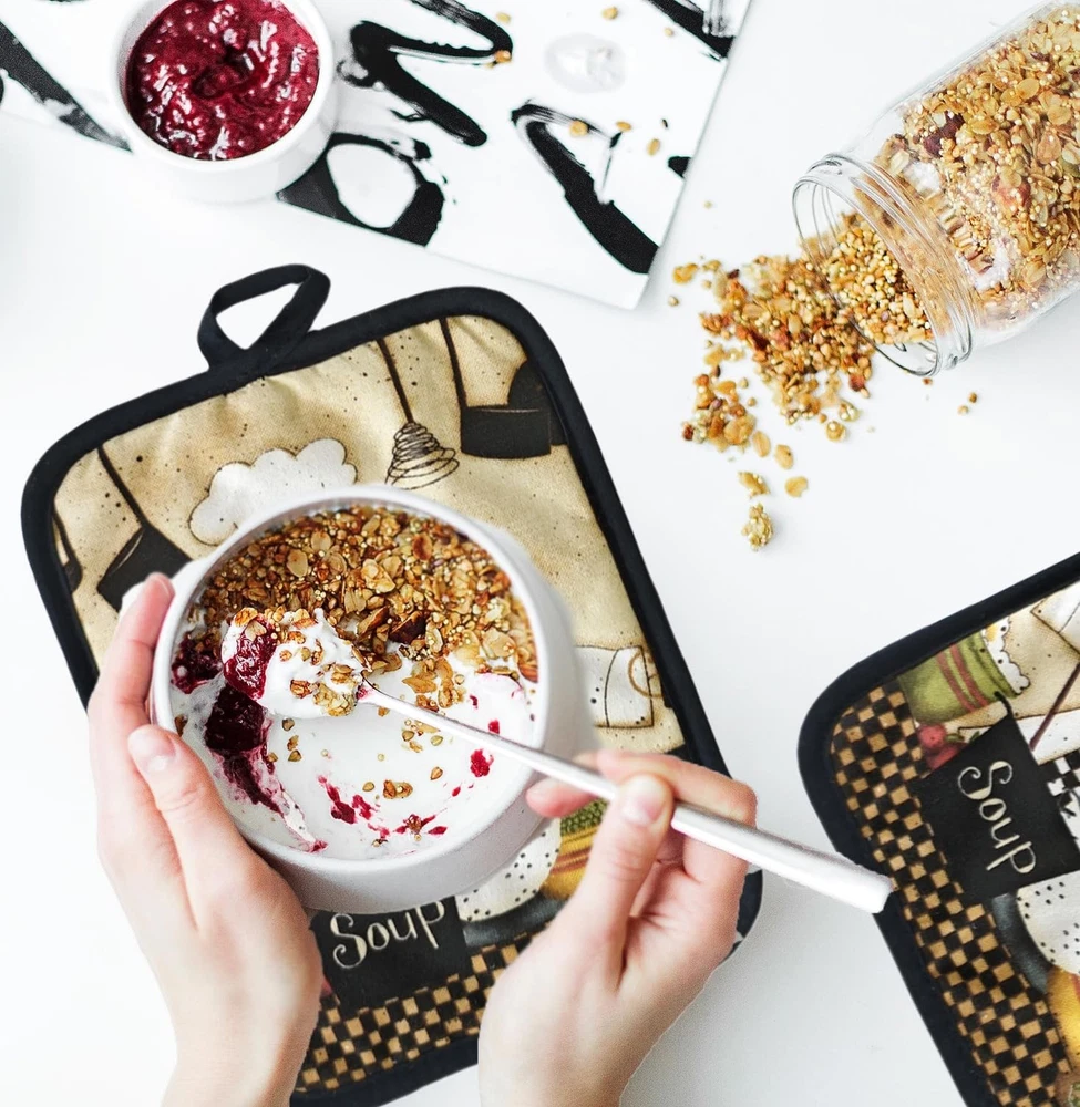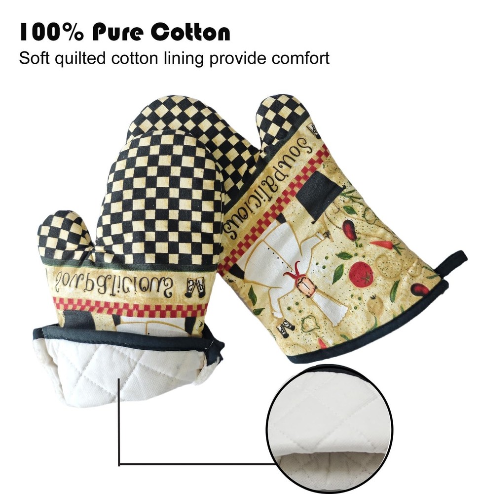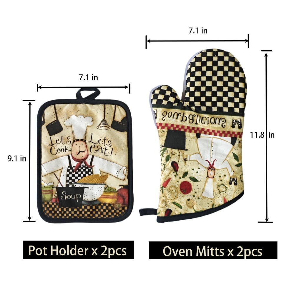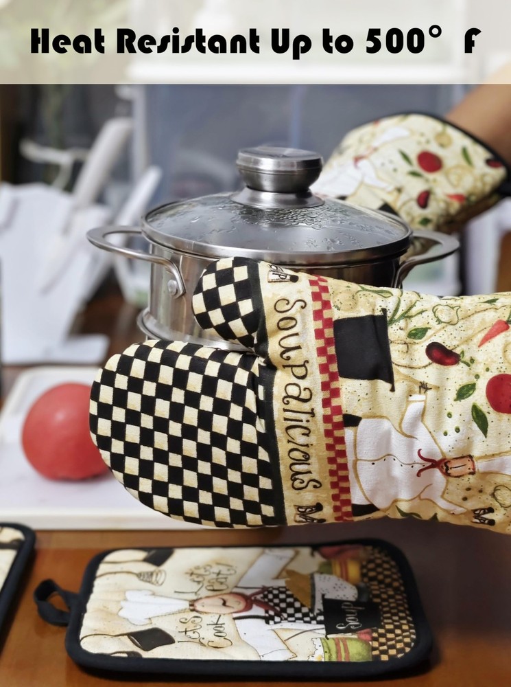 ✿ Why Not LnQukwji Funny Oven Mitts and Pot Holders Set for Your Kitchen? LnQukwji's oven mittens set is made of 100% pure cotton, not only heat resistand to 500°F and also eco-friendly washable. With cute and funny pattern design on the double oven mitts and potholders, bring funny&colors to you when doing cooking in the kitchen alone. Choose LnQukwji cute kitchen oven mitts , choose the colorful cooking time. ✿ Features: -Easy to storage with hanging loop. -Heat resistant to 500°F. -Oven mitts Flexible for both hands. -Kitchen mitts with extra long coverage. -Pot holders with multi-purpose use. -Pot holders and mits are washable. ✿ Specification: Pattern: Funny Chef Pattern Material: 100% Pure Cotton Kitchen Glove Size: 6×12in Hot Pad Size: 9×3in ✿ Package: 2pcs heat resistant oven mitts. 2pcs heat resistant hot pads. 【𝗖𝘂𝘁𝗲 Chef 𝗣𝗮𝘁𝘁𝗲𝗿𝗻 𝗗𝗲𝘀𝗶𝗴𝗻 𝘄𝗶𝘁𝗵 𝗦𝗼𝗳𝘁 𝗤𝘂𝗶𝗹𝘁𝗲𝗱 𝗖𝗼𝘁𝘁𝗼𝗻】Made of upgrade soft quilted cotton lining and designed with funny chief pattern on the double oven mitt and pot holder set, it not only bring you comfortable touch but also add some colors to your kitchen as well. 【𝗛𝗲𝗮𝘁 𝗥𝗲𝘀𝗶𝘀𝘁𝗮𝗻𝘁 𝗼𝗳 𝟱𝟬𝟬℉】With heat resistant up to 500 degrees,this kitchen mitts and potholder protect your hands from heat and make it safe to remove baking dishes from the oven and hot pots from the stove. To keep safe-Do not use pot holder or oven mitt over an open flame. 【𝟰-𝗣𝗶𝗲𝗰𝗲 𝗞𝗶𝘁𝗰𝗵𝗲𝗻 𝗢𝘃𝗲𝗻 𝗠𝗮𝘁𝘀 𝗦𝗲𝘁】2pcs extra long oven mats(6×12in) is flexiable for both hand. 2pcs pot holders (3×9in)use to move hot pot or use as hot pads for hot dished,cooking pot or coffee pot to protect counter tops from scratches. Both oven mitts set is a perfect ideal for kitchen cooking,baking,BBQ or outdoor grilling. 【𝗘𝗮𝘀𝘆 𝘁𝗼 𝗦𝘁𝗼𝗿𝗲 𝗮𝗻𝗱 𝗖𝗹𝗲𝗮𝗻】Both oven gloves and pot holder come with a hanging loop design, easy to storage after daily use and coordinate well with your home and kitchen. Hand or machine wash is available. 【𝗚𝗿𝗲𝗮𝘁 𝗕𝗮𝗸𝗶𝗻𝗴 & 𝗖𝗼𝗼𝗸𝗶𝗻𝗴 𝗚𝗶𝗳𝘁 𝗖𝗵𝗼𝗶𝗰𝗲】Pot holders and oven mitts are kitchen essentials. Cute choice for Christmas, Thanksgiving gift and housewarming gifts. Pair it with other cooking utensils is also a fun and thoughtful gift choice.