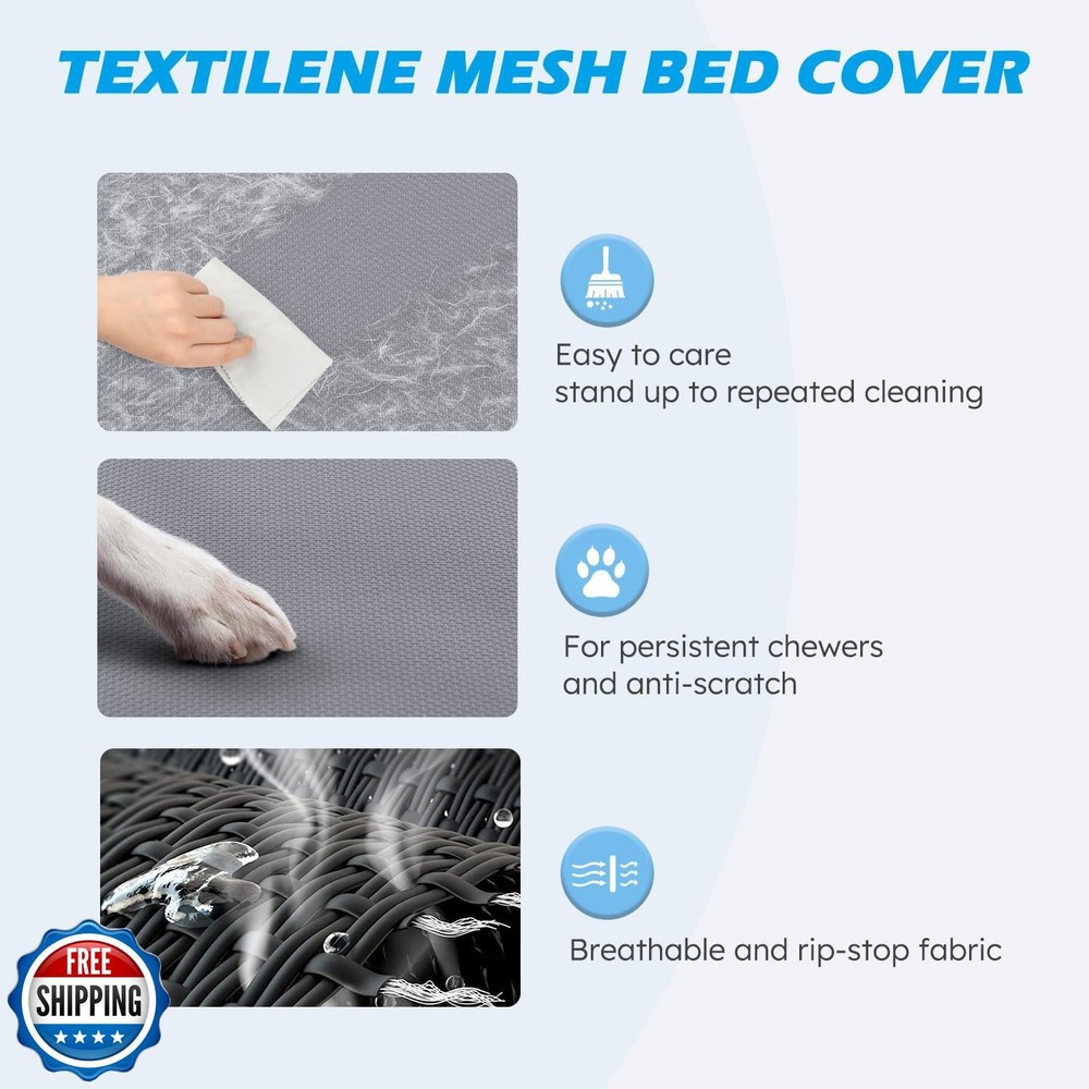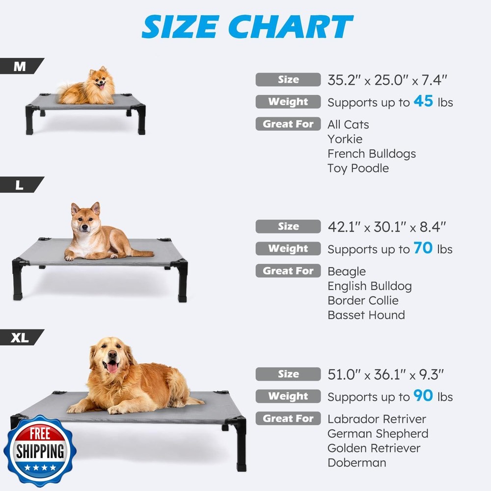Cooling Elevated Dog Bed with Mesh and Metal Frame, Portable Dog Cot for Outdoor and Indoor Use Features Stay Cool and Dry: The dog bed elevates pets more than 8.4 inches off the ground, which allows air to circulate underneath and provides a cooling environment for your pets. Raised dog cot is great for keeping your pet warm in the cooler months and cooler in the warmer months both indoors and outdoors. Premium Fabric Materials: The Textilene dog bed mat allows air to flow, is sturdy and breathable. Pet hair, dirt, grime won't stick to the tight mesh, just hose off with water and allow to dry. You can also wipe it clean with a wet towel. Sturdy Steel Construction: Powder-coated steel frame is rust-resistant and built to withstand harsh outdoor conditions, it can support the weight of your large-sized dog. Designed for quick removal and installation, make the bed portable and perfect for indoor, outdoor, picnic, camping, training. Enlarged Rubber Feet Pads: The non-slip rubber feet protect floors from scratches and keep the pet bed from sliding when your dog jumps on or off. The non-slip feet provide extra stability during movement, making this ultra-comfortable bed ideal for use on a variety of surfaces. Easy to Install: The cooling dog cot can be installed without the use of any tools, screws and can be installed directly with the plastic connector. It only takes a few minutes of your time, and presto! It's up and ready for your pet to enjoy in. Shipping Free & Fast Shipping: We offer free shipping to most of the USA with a normal delivery time of 3-7 days. However, due to the current situation, additional delivery time (up to 3 weeks) may be required for some items. Alternative Carriers: We may use alternative carriers (e.g., USPS, FedEx, UPS) to ensure your package arrives safely and on time. Due to the use of multiple carriers, we are unable to provide a tracking number automatically. Handling Time: Orders are processed and shipped within 1-2 business days of receiving cleared payment. Shipping Restrictions: Shipping to Alaska, Hawaii, Puerto Rico, Guam, and other US territories may incur shipping charges or delivery restrictions. Please contact us before ordering, or your order can be refunded/cancelled. State Restrictions: Certain items may not be shipped to California due to state regulations. Contact for Tracking Updates: If you require tracking updates or have any concerns about the delivery of your order, please feel free to contact us, and we will be happy to assist you. Return Policy 30-Day Hassle-Free Returns: If you are not completely satisfied with your purchase, you can return the item for free within 30 days of receiving it for a full refund or exchange. Easy Return Process: Contact us, and we will provide you with a prepaid return shipping label and detailed instructions. No Restocking Fee: There are no restocking fees for returns. However, the buyer is responsible for return shipping costs if the return is not due to a seller"s error. Refund Processing: Refunds will be processed within 1 business day of receiving the returned item in its original condition. Feedback Your feedback is extremely important to us. We strive to provide the best products and customer service possible. If you are satisfied with your purchase, please take a moment to leave us a positive review. If you have any concerns or issues with your order, please contact us before leaving negative feedback. We are committed to resolving any problems and ensuring your satisfaction. Contact Us If you have any questions or concerns, please feel free to reach out to our customer support team. You can contact us through the eBay messaging system. We are available Monday to Friday, 9:00 am to 5:00 pm EST, and we will do our best to respond to your inquiry within 24 hours. Thank you for supporting our small family business!