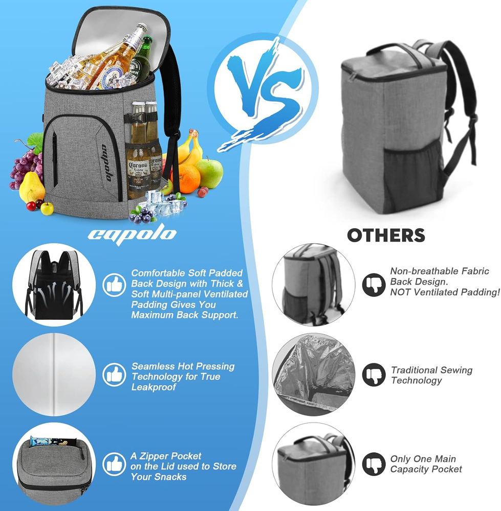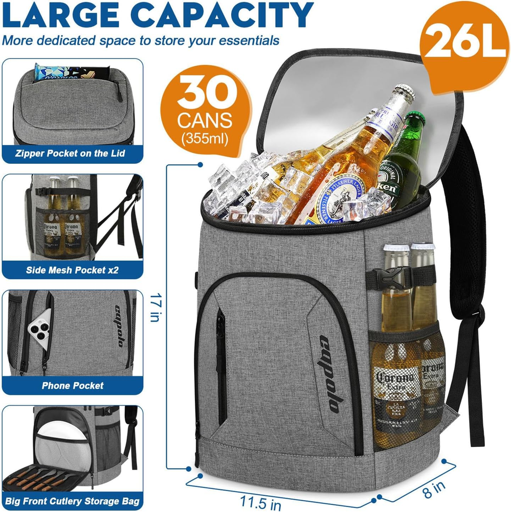 Business is our speciality NEW Cooler Backpack 30/45 Cans, Insulated Thermal Bag Beverage Soft Cooler Lunch Camping Travel Picnic Hiking for Men Women FEATURES Revolutionary Insulation: Capolo camping cooler backpack maintains the ideal temperature. Designed with a high-density insulated lining, our insulated backpack forms a reliable barrier against external heat. It effectively traps the cold within, preserving the freshness of your food and beverages. Say goodbye to lukewarm disappointments and allow you to savor every moment. Heavy-Duty Leakproof Lining: Capolo waterproof backpack cooler features a state-of-the-art hot-pressed seamless leak-proof design, combined with thickened PEVA lining ensures no leakage problem. Say goodbye to the worries of messy spills and soggy belongings. You can confidently transport your food and beverages without any fear of leakage. Multiple Compartments: Organizing your supplies is a breeze! Capolo beach cooler has a large main pocket can store drinks, two elastic mesh side pockets with adjustable buckle to hold the wine bottle perfectly, a front-facing pocket with a zip closure to organize utensils, and finally, the zippered pocket on top of the lid is a great spot for stashing snacks. You can easily organize your food and drinks and keep everything within reach. Comfortable and Efficient: Capolo beer backpack cooler is designed with adjustable shoulder straps and soft breathable mesh back panel which has ample cushion and comfortable, helping to distribute the weight of the backpack evenly across the back. Carry more weight with less effort compared to regular backpacks. Diverse Functions for Every Adventure: Whether embarking on a day trip, conquering cycling routes, a camping adventure, hiking through excellent scenic trails, or casting a line while fishing, Capolo ice chest backpack is the go-to choice for seeking convenience, comfort, and versatility indispensable lightweight gear for a wide range of outdoor activities. Product Description KEEP COOL/FRESH Perfect for keeping your foodand drinks chiled KEEP WARM Keep food warm and fresh perfect for a lunch box backpack Capolo Cooler Backpack Designed to keep your food and drinks fresh and cool Large Capacity Backpack Cooler With a large capacity of 30 cans, you can pack everything you need for a day trip. Multiple Compartments Cooler You can easily organize your food and drinks and keep everything within reach! Build to Last Cooler Made of high-quality materials, heat insulation, leak-proof, waterproof and lightweight Soft Cooler Soft padded shoulder straps & back for comfortable carrying, convenient in outdoor adventu 1 HIKING 2 CAMPING 3 FAMILY PICNIC 4 FISHING 5 CLIMBING More Travel Essential Item from Capolo Add to Cart Add to Cart Add to Cart Customer Reviews 4.4 out of 5 stars 776 4.7 out of 5 stars 1,313 4.5 out of 5 stars 296 4.6 out of 5 stars 825 4.4 out of 5 stars 4,563 4.5 out of 5 stars 296 Price $18.99 $ 18 . 99 $24.99 $ 24 . 99 — $24.99 $ 24 . 99 $9.99 $ 9 . 99 — Number of Colors Available 11 10 — 7 17 9 Capacity 30 CANS 30-40 L — 20-25 L 1.8 L 1.8 L Water-Resistant ✔ ✔ ✔ ✔ ✔ ✔ Unisex ✔ ✔ ✔ ✔ ✔ ✔ Lightweight ✔ ✔ ✔ ✔ ✔ ✔ Part Number 20000426 Item Package Dimensions L x W x H 11.85 x 7.6 x 3.86 inches Capacity 3.6E+2 ounces Item Dimensions LxWxH 11.5 x 8 x 17 inches Color Gray Pattern Solid Material Polyester Package Weight 0.62 Kilograms Insulation Material peva Model Name 8546253 Recommended Uses For Product 露营 Chamber Depth 8 Inches Package Information Bag,Cans Special Feature Insulated Product Dimensions 8"D x 11.5"W x 17"H Product Care Instructions 手洗 Size 30 Cans 7.6 inches x 11.85 inches x 3.86 inches. Weight: 0.62 kg Ask us anyhting Free shipping PAYMENT We accept all payments via Ebay using Credit Cards , PAYPAL , Apple Pay and many others SHIPPING We are always working hard to ensure your package arrives as soon as possible. Please understand that some factors like weather, high postal traffic, and the performance of shipping companies are outside of our control. DELIVERY & RETURN POLICY We offer a 30-Day Return Policy on items in which you are not completely satisfied with. You have the option of a full-refund or an exchange of the item. No returns are available on items shipped outside of the USA.