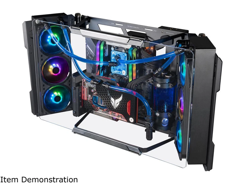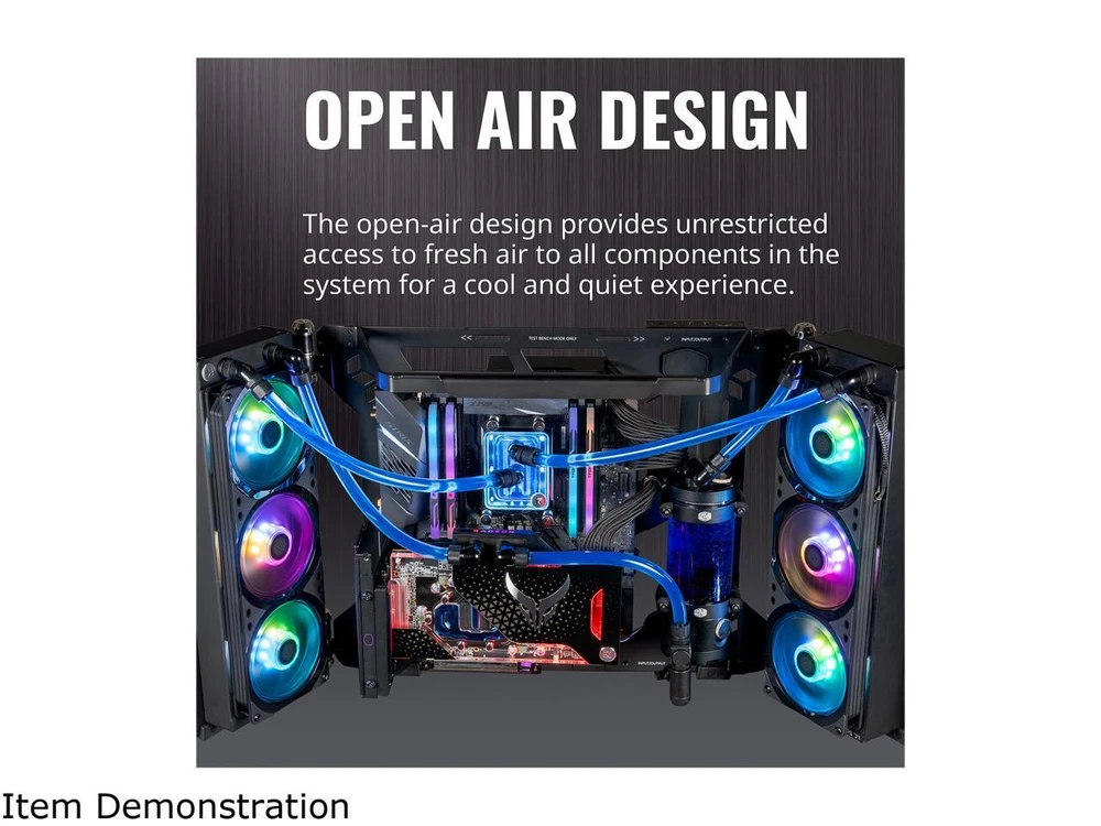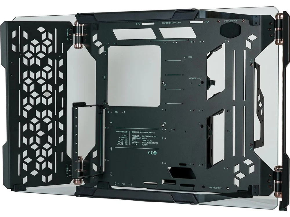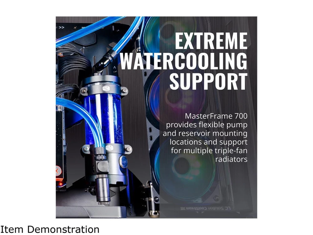 Learn more about Cooler Master MCF-MF700-KGNN-S00 Model Brand Cooler Master Series MasterFrame 700 Model MCF-MF700-KGNN-S00 Details Type Open-Air ATX Color Black Case Material Steel / Tempered Glass With Power Supply No Power Supply Mounted Bottom Motherboard Compatibility ATX / E-ATX / Micro ATX / Mini ITX / SSI EEB Side Panel Window Tempered Glass Front Panel Expansion Internal 3.5" Drive Bays Up to 4 x Combo 3.5" / 2.5" Internal 2.5" Drive Bays Up to 7 Expansion Slots 8 Front Panel Ports Front Ports 2 x USB3.2 Gen1 Type A1 x USB3.2 Gen2 Type C 1 x 3.5mm Headset Jack (Audio+Mic) Cooling System Fan Options Right Side: 3 x 120mm / 2 x 140mmLeft Side: 3 x 120mm / 2 x 140mm Radiator Options Top: Up to 360/420mmRight Side: Up to 280/360mmLeft Side: Up to 280/360mm Dimensions & Weight Max GPU Length Up to 450mm/17.71 inch310mm / 12.20 inch recommended for maximum compatibility Max CPU Cooler Height 158 mm Max PSU Length 210 mm Dimensions (H x W x D) 16.14" x 12.05" x 27.64" Weight 26.23 lbs. Additional Info Features Premium Variable Friction Hinges: Heavy duty hinges hold the side wings to the mid-frame and allow for smooth repositioning at any angle depending on the user’s needs. Allen keys are included to adjust the tension of the hinges to make it easier to move or allow the side wings to hold heavier parts. This level of flexibility is a key factor for users creating extremely unique water-cooling loops and setups.Open Air Design: The open-air nature of the design provides unrestricted access to fresh air to all components in the system. The optional fan mounts allow to further guide the airflow path to a specific intake/exhaust direction, thus preventing performance-robbing heat recirculation.Un-matched Hardware Support: For its size, MasterFrame 700 sports an unmatched level of hardware compatibility. It is designed to fit any component available, even oversized ones. Users can mount up to SSI-EEB motherboards, multiple power supplies and multiple radiators at the same time and still have room for triple slots GPUs and storage.Extreme Water-Cooling Support: Designed with water-cooling in mind, MasterFrame 700 provides a flexible pump and reservoir mounting location and support for multiple triple-fan radiators.Test Bench Mode: Thanks to its modular design, MasterFrame 700 can lay down horizontally and transform into an ultra-featured premium Test Bench. Cooling and power components are installed out of the way of the motherboard area for interference-free installation of components.Panoramic Tempered Glass: The oversized panoramic tempered glass offers a greater viewing angle on the components of the system and, together with hardware-centric design of MasterFrame 700, it is the perfect way to showcase high-end components and custom cooling solutions.Built-In VESA Mount: The MasterFrame 700 can be wall mounted thanks to the inclusion of a 100mm x 100mm VESA mount. Perfect to showcase custom loops and high-end components. It is highly recommended Package Content MasterFrame 700 Install Tool Kits Manual Shipping Enjoy fast and reliable shipping when you buy your products from Newegg. Our ordering and shipping services are among the best in the industry due to short processing times and a variety of shipping methods. Your orders are packaged at one of the many local warehouses across the country, minimizing delivery times and ensuring you get your purchases as soon as possible. Payments Newegg has partnered with PayPal to offer you the very best in payment services. PayPal allows you to buy with confidence, knowing your payments are processed quickly and securely with state-of-the-art encryption technology. Return Returns are subject to restocking fees of 15% - 30% of the purchase price and return shipping fees. For products that are eligible for return for replacement, the return shipping labels are free for returns for replacement of the same item within the applicable return policy period. Newegg does NOT charge for restocking fees or return shipping labels for returns of defective products, or if you received the wrong product, the product did not match what was shown on the Site, or we made some other shipping error, provided the item is returned within its return policy period, and in accordance with the Return Policy. For international buyers, items shipped internationally do not qualify for manufacturer warranties.