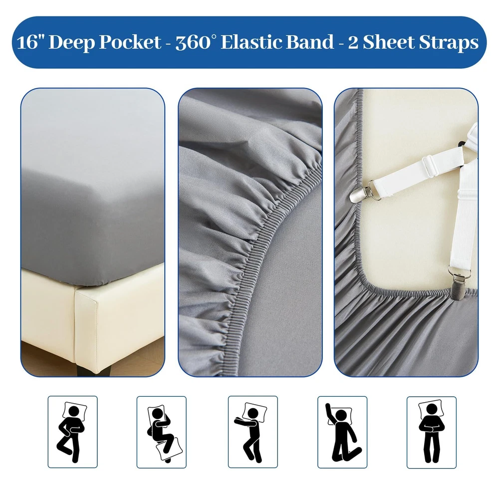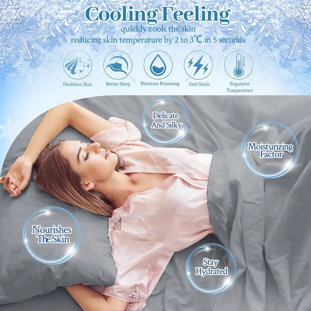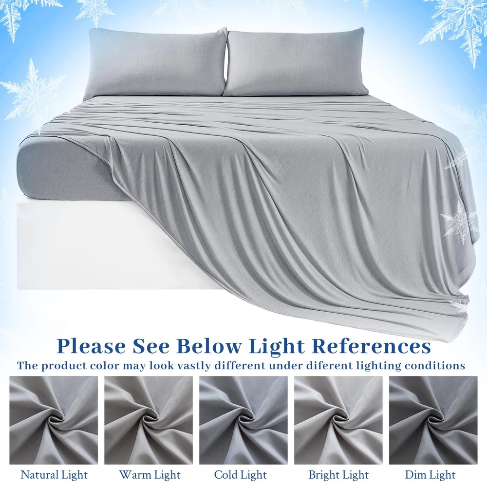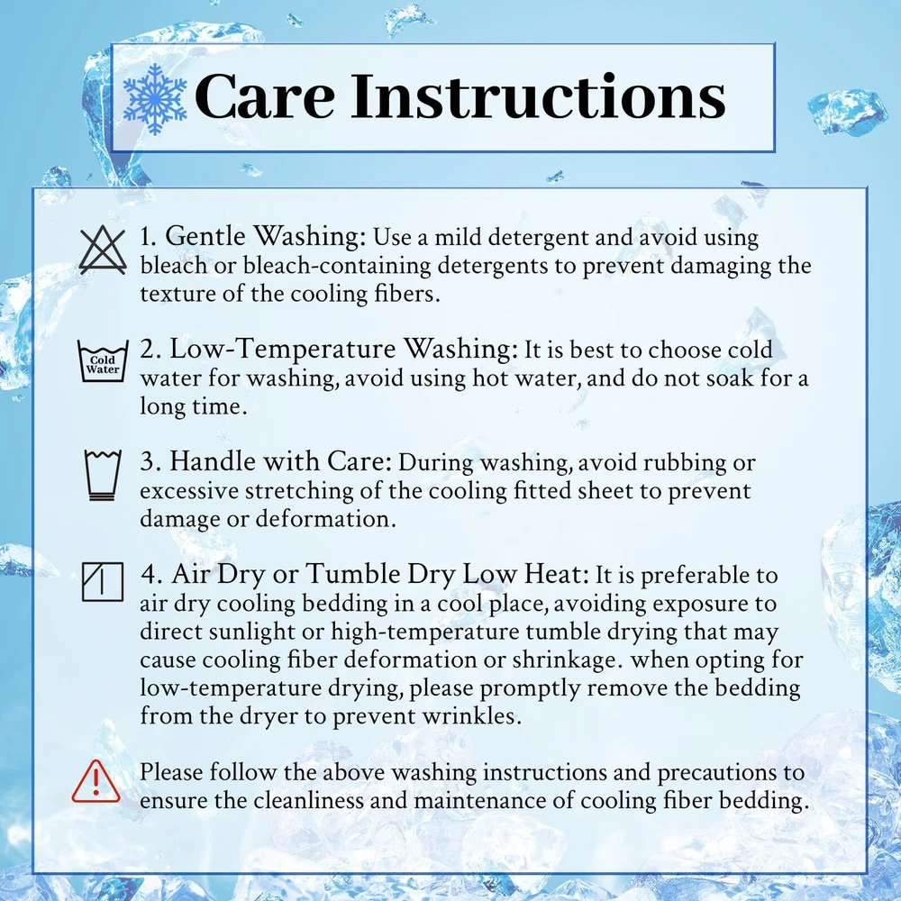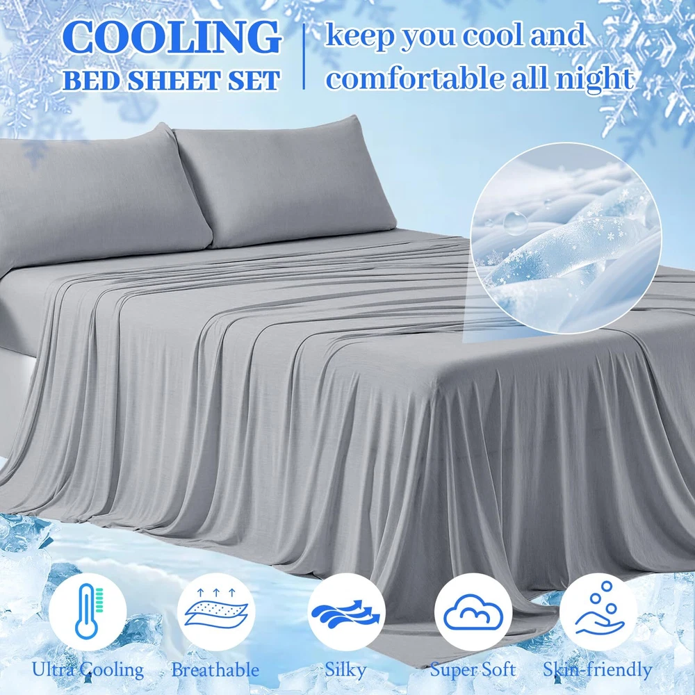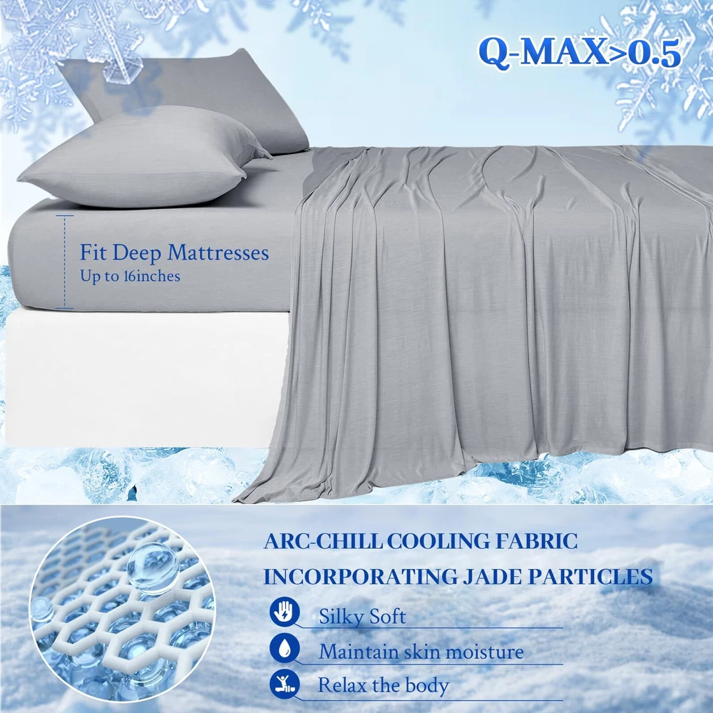 4PC Cooling Bed Sheets Material: Q-MAX>0.5 Japanese Icy-jade Fiber Our Cooling Sheet Set is made from high-quality Japanese Icy-jade Fibe which is soft, breathable, moisture-wicking, and cooling. FEATURES: Cooling Thin Deep pocket to fit 16” mattresses Hypoallergenic Durable Wrinkle-resistant Cooling Sheet Set Package Includes: 2 Pillowcases 1 Flat Sheet 1 Fitted Sheet 2 Sheet Hold Straps At , our mission is to provide you with the ultimate sleep experience. We hold ourselves to the highest standards when it comes to our bedding, ensuring that our customers are consistently delighted and well-rested. Indulge in the luxurious comfort of our cooling sheets and awaken feeling refreshed and rejuvenated. 🧊Enjoy the Latest Arc-Chill Cooling Fiber Tech: Stay cool and comfortable all night with our cooling sheets that feature the latest Arc-Chill Extreme fabric(Q-Max>0.5) and infused with cool particles of Icy-jade that quickly absorb sweat and heat, lowering body surface temperature over 5℃ the moment your skin touches the cooling bed sheets. Bring you a refreshing and beautiful sleep, and say goodbye to the night sweats and hot sleepers. 🧊Silky Soft & Skin-friendly: cooling bed sheets are crafted from the silky soft OEKO-TEX certified cooling fabric, providing exceptional smoothness and softness; Arc-chill cooling icy jade fiber can quickly absorb body heat and transfer it away while you sleep, thus maintaining a long-lasting cooling sensation, and helps you sleep more peacefully by effectively regulating body temperature, perfect for a hot summer. 🧊Airy & Lightweight: Crafted with just the right amount of weight, these cooling sheets gently drape over your body, offering a restorative sleep experience like being embraced by clouds. 🧊Perfect Fit & Stay in Place: The cooling fitted sheet is designed with an all-around elastic strap and comes with two fitted sheet holder straps that wrap securely around the mattress to keep sheets taut all night and won't slip off the bed, giving you a perfectly restful night’s sleep. 🧊Easy to Care & Cleaning: Compared to other costly and flimsy mulberry silk sheets, cooling sheets can also bring you a silky and smooth tactile impression. On top of this, it is easier to care for and clean. Machine wash separately in cold water on a gentle cycle and tumble dry low for a like-new restoration.