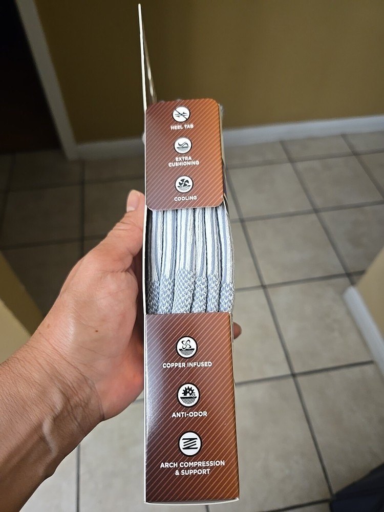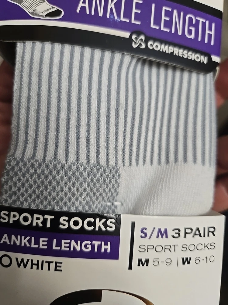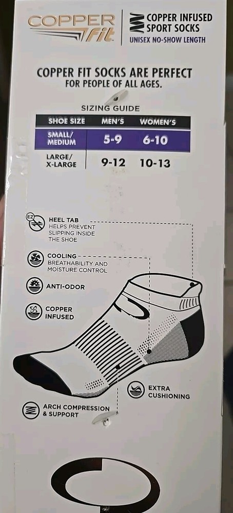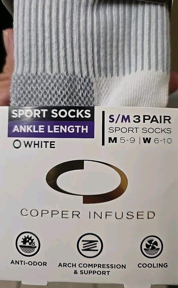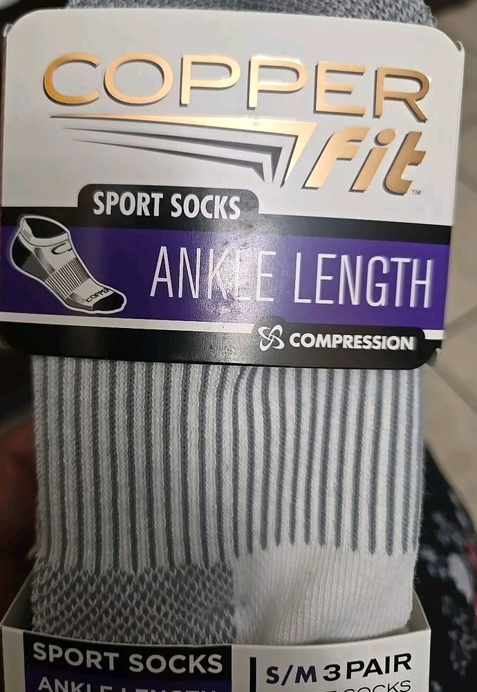 Number in Pack:3 PairsUPC:754502029761Theme:SportsSock Length:No-ShowType:SocksBrand:Copper FitSize:S/MColor:White/GreyStyle:CompressionFeatures:Arch Support, Cushioned, Moisture WickingDepartment:Mengtin13:754502029761