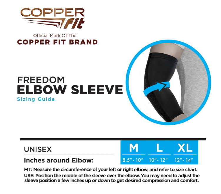 Copper infused compression sleeve for muscle and circulatory support. All day comfort with 4-way stretch and contour design. Odor reducing and moisure wicking. 1 SLEEVE PER BOX. NEW/NEVER USED.