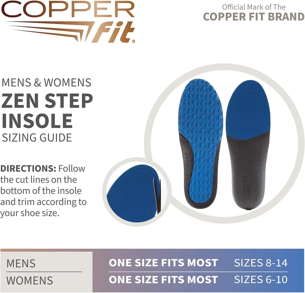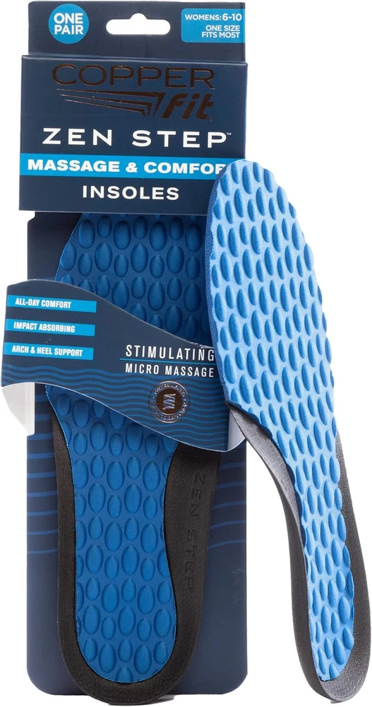 Feel better and more energized with Zen Step Insoles. These specially designed, full-length insoles feature impact absorbing foam with stimulating massage nodes to gently relieve pressure and deliver a soothing massage sensation to help relax and comfort sore soles. Trim to fit Women's shoe sizes 8-14.
