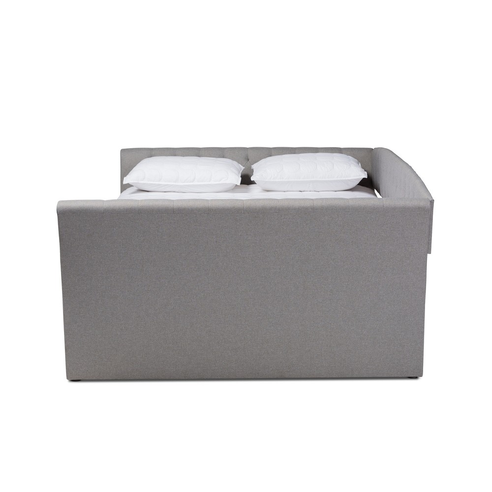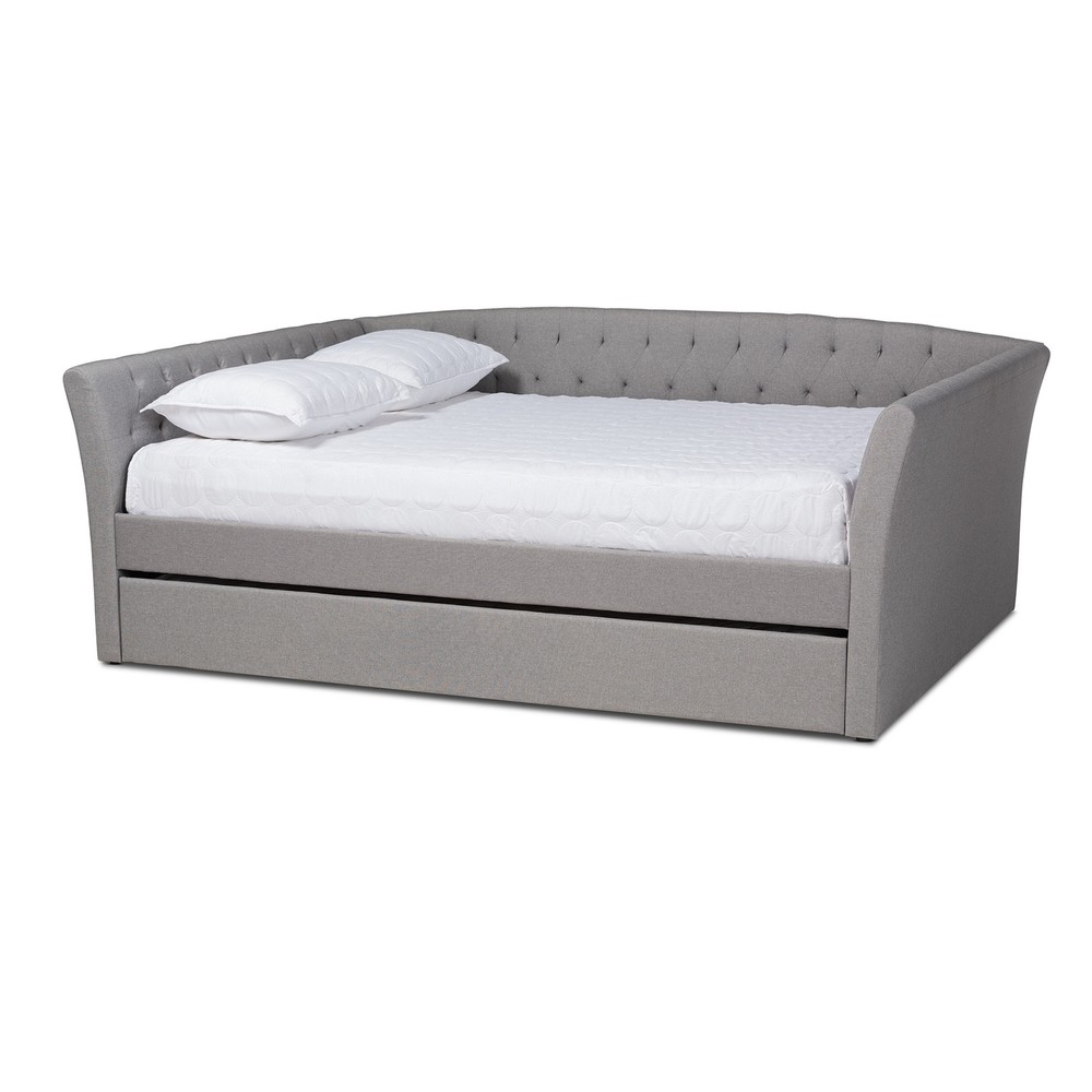 Experience the perfect blend of style and comfort with the Copper Grove Costesti Modern Upholstered Daybed with Trundle. Upholstered in 100% polyester fabric and padded with foam, this modern and contemporary daybed features flared arms and elaborate button tufting for a classic, sophisticated look. The roll-out twin size trundle bed provides convenient accommodation for overnight guests, making it a functional addition to your home.Features: Modern and contemporary style 100% polyester fabric and foam padding for comfort Roll-out twin size trundle bed Button tufted design Available in beige, dark grey, and light grey colors Constructed from MDF wood and engineered wood Assembly required Wipe clean care instructionDimensions: Overall: 32.8" H x 41.9" W x 103.5" D Full size Free Shipping Over $49.99* Details Copper Grove Costesti Modern Upholstered Daybed with Trundle Product Description: Experience the perfect blend of style and comfort with the Copper Grove Costesti Modern Upholstered Daybed with Trundle. Upholstered in 100% polyester fabric and padded with foam, this modern and contemporary daybed features flared arms and elaborate button tufting for a classic, sophisticated look. The roll-out twin size trundle bed provides convenient accommodation for overnight guests, making it a functional addition to your home. Features: Modern and contemporary style 100% polyester fabric and foam padding for comfort Roll-out twin size trundle bed Button tufted design Available in beige, dark grey, and light grey colors Constructed from MDF wood and engineered wood Assembly required Wipe clean care instruction Dimensions: Overall32.8" H x 41.9" W x 103.5" D Full size daybedArms - 32.8" W x 57.1" L x 3.1" thick; Back rest panel - 6.1" W x 76.8" L x 0.8" thick; Front side rail - 12.4" W x 86.2" L x 1.6" thick Trundle55.7" W x 76" D x 9.3" H x bottom front trundle panel - 9.3" W x 76" L x 0.8" thick; Trundle slats - 1.8" W x 55" L x 0.7" thick Inside dimensions (mattress size)54" W x 74" D Product weight68.35 lbs.