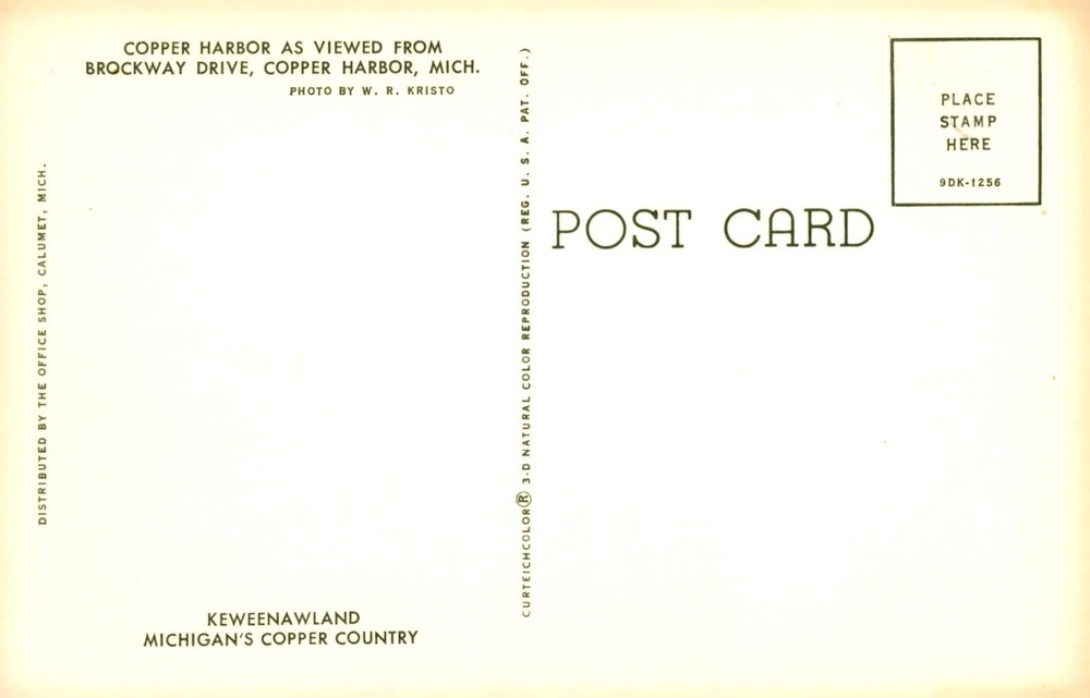 Scenic view of Copper Harbor captured from Brockway Drive in Michigan's Copper Country. This postcard features vibrant natural color reproduction by W. R. Kristo.