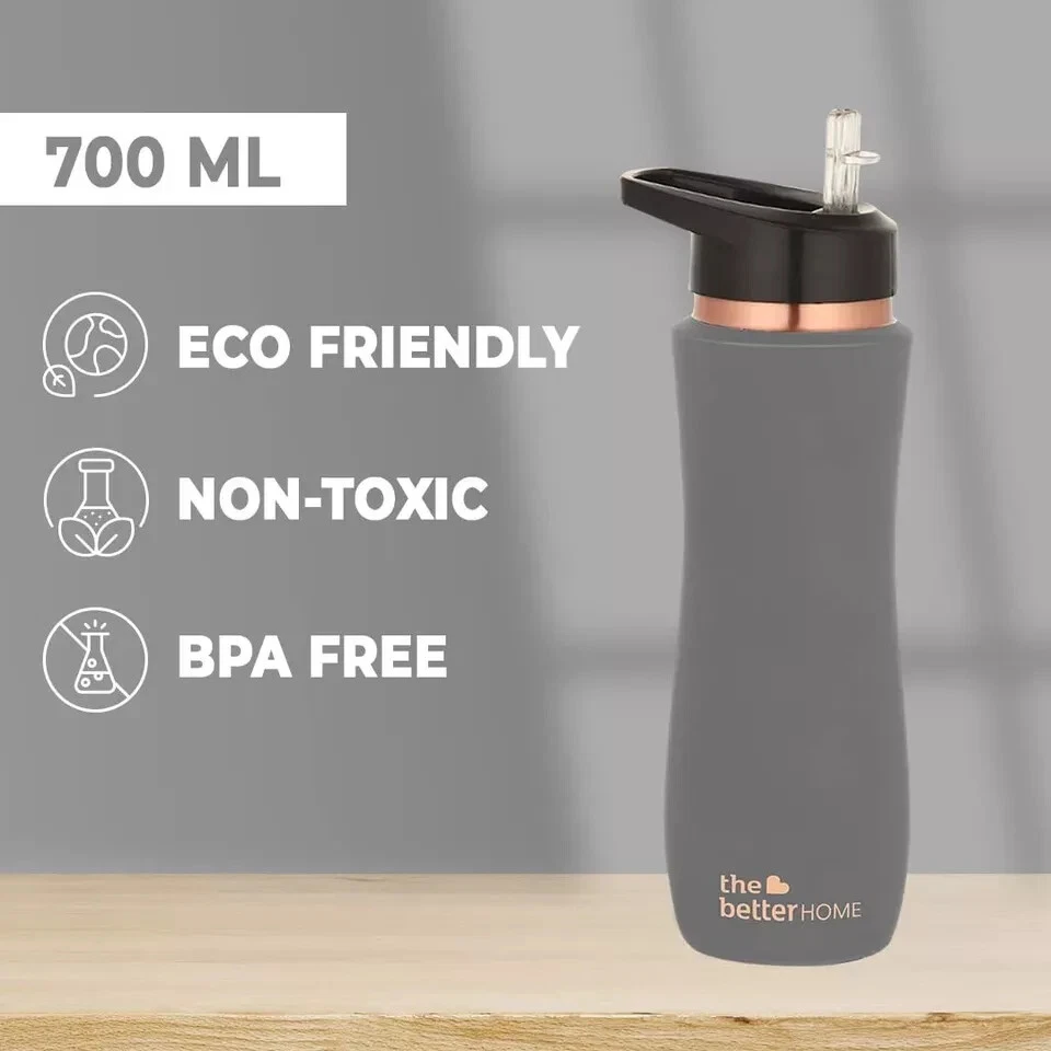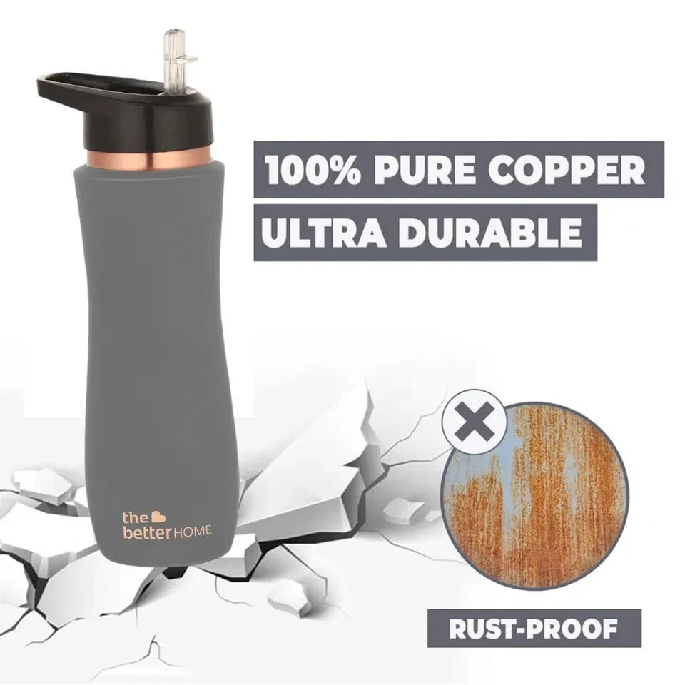 Product Description REAP THE BENEFITS OF COPPER : The Better Home Pure Copper Water Bottle with sipper is BPA free and helps keep you and your family hydrated without worrying about any bacteria development or toxic substances leaking into your water with the added benefits of copper water’s antimicrobial, anti-inflammatory, and antioxidant properties. Copper water also aids digestion and detoxes certain organs! ERGONOMIC SIZE AND DESIGN : Our pure copper bottle is made to be carried or stored comfortably, making it easy to pick up and put back while you sip water through the day. LIGHTWEIGHT AND LEAK-PROOF : This copper water bottle has an ergonomic design, lightweight and leak-proof features that make it the perfect companion that will keep you hydrated, at home, or on the go. ECO-FRIENDLY AND BIODEGRADABLE : Rust-free and super durable, our copper bottle is the ultimate sustainable choice for your family and can be reused every day without any waste EASY TO CLEAN: Unlike plastic bottles that can develop a yellow tint with long-term usage, our copper water bottles are very easy to keep hygienic and can be cleaned with vinegar, salt, and water for fresh results.