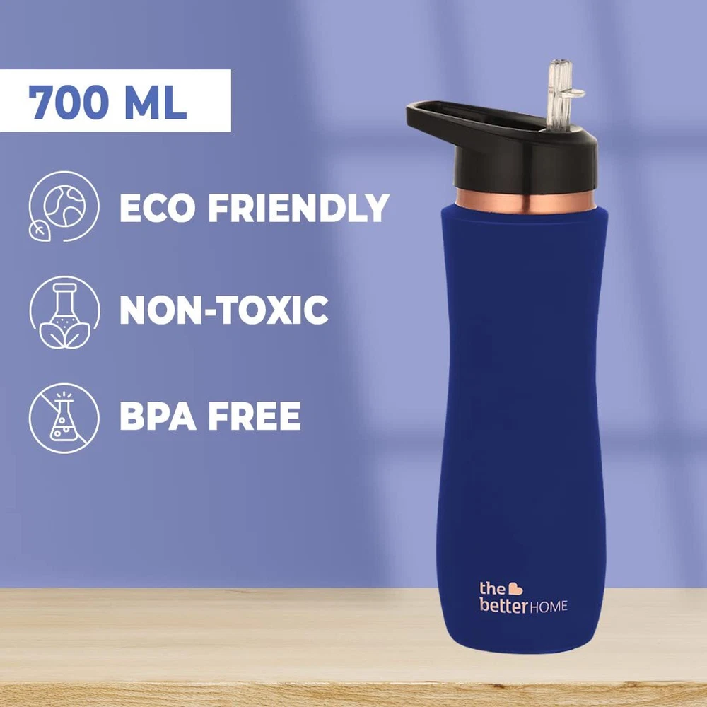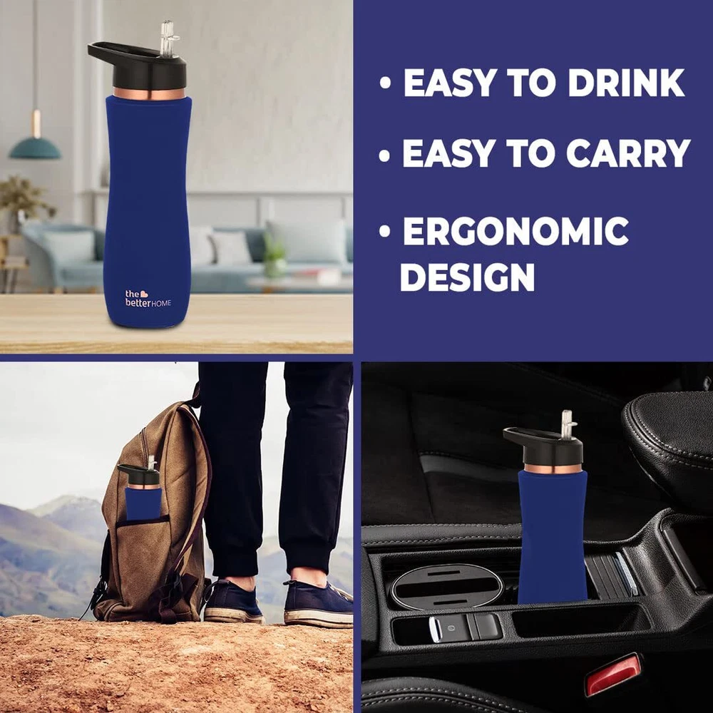 Product Description REAP THE BENEFITS OF COPPER : The Better Home Pure Copper Water Bottle with sipper is BPA free and helps keep you and your family hydrated without worrying about any bacteria development or toxic substances leaking into your water with the added benefits of copper water’s antimicrobial, anti-inflammatory, and antioxidant properties. Copper water also aids digestion and detoxes certain organs! ERGONOMIC SIZE AND DESIGN : Our pure copper bottle is made to be carried or stored comfortably, making it easy to pick up and put back while you sip water through the day. LIGHTWEIGHT AND LEAK-PROOF : This copper water bottle has an ergonomic design, lightweight and leak-proof features that make it the perfect companion that will keep you hydrated, at home, or on the go. ECO-FRIENDLY AND BIODEGRADABLE : Rust-free and super durable, our copper bottle is the ultimate sustainable choice for your family and can be reused every day without any waste EASY TO CLEAN: Unlike plastic bottles that can develop a yellow tint with long-term usage, our copper water bottles are very easy to keep hygienic and can be cleaned with vinegar, salt, and water for fresh results.