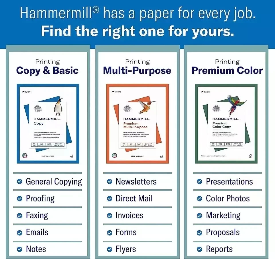 About this item HAMMERMILL’S BEST SELLING PRINTER PAPER: You will receive one carton of copy paper, which includes 3 individual reams of paper inside. Each ream of paper has 500 sheets of 20 pounds, 92 bright, 8.5" x 11" white copy paper 99.99% JAM-FREE PRINTER PAPER: Everyone hates paper jams. You can trust Hammermill paper quality to keep your printer running smoothly. Scroll down to view the product description for details COLORLOK TECHNOLOGY INCLUDED: Colors on Hammermill copy paper are 30% brighter; Blacks are up to 60% bolder and inks dry 3 times faster for less smearing. Acid-free Hammermill paper ensures long-lasting archival quality MADE IN USA: Hammermill copying and printing papers are 100% made in the USA, helping to support 2.4 million sustainable forestry jobs in America, including family tree farmers. Hammermill is more than just paper MAKE SURE IT’S ORIGINAL HAMMERMILL QUALITY: Look for “Ships from and sold by” at the top of the page, under the product title OTHER PAPER OPTIONS: Scroll down to compare Hammermill print and copy paper for every purpose, including premium presentation-quality color copy paper, cover-weight paper stock, and glossy paper for photo printing