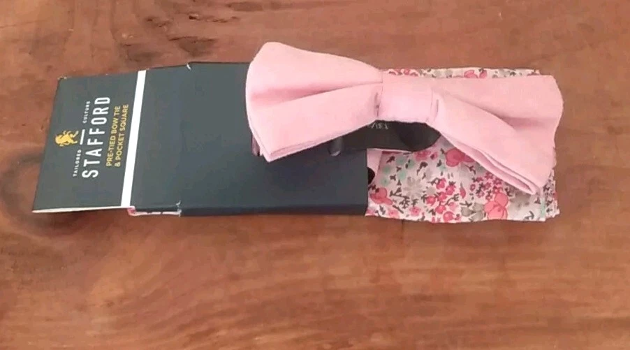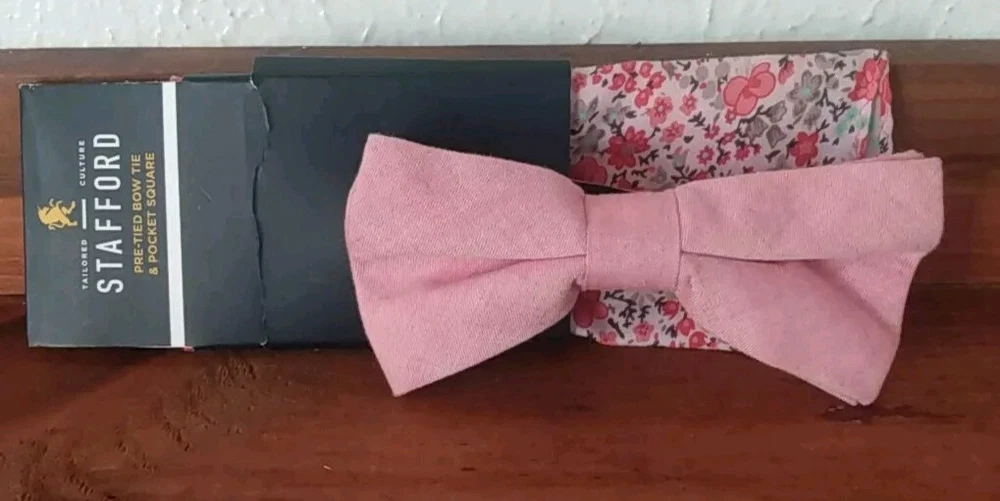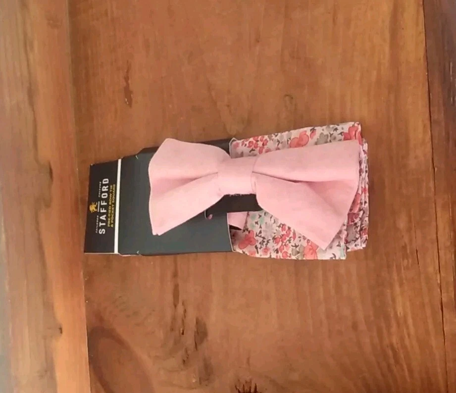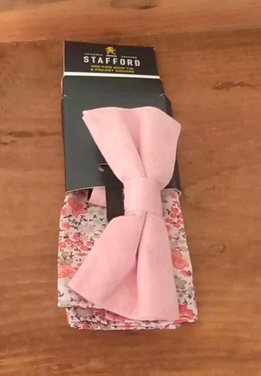 Add a touch of sophistication to your wardrobe with this Stafford brand bow tie and floral pocket square set. The adjustable neck band allows for a comfortable fit, while the coral pink color adds a pop of color to any outfit. Made of high-quality polyester material, this set is perfect for any occasion, whether it be a formal event or a day at the office. The tied attachment type ensures a secure fit, while the features of the set include a bow tie and necktie. This set is perfect for any fashion-forward man looking to elevate their style.