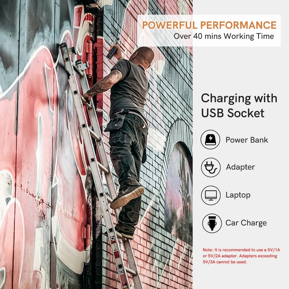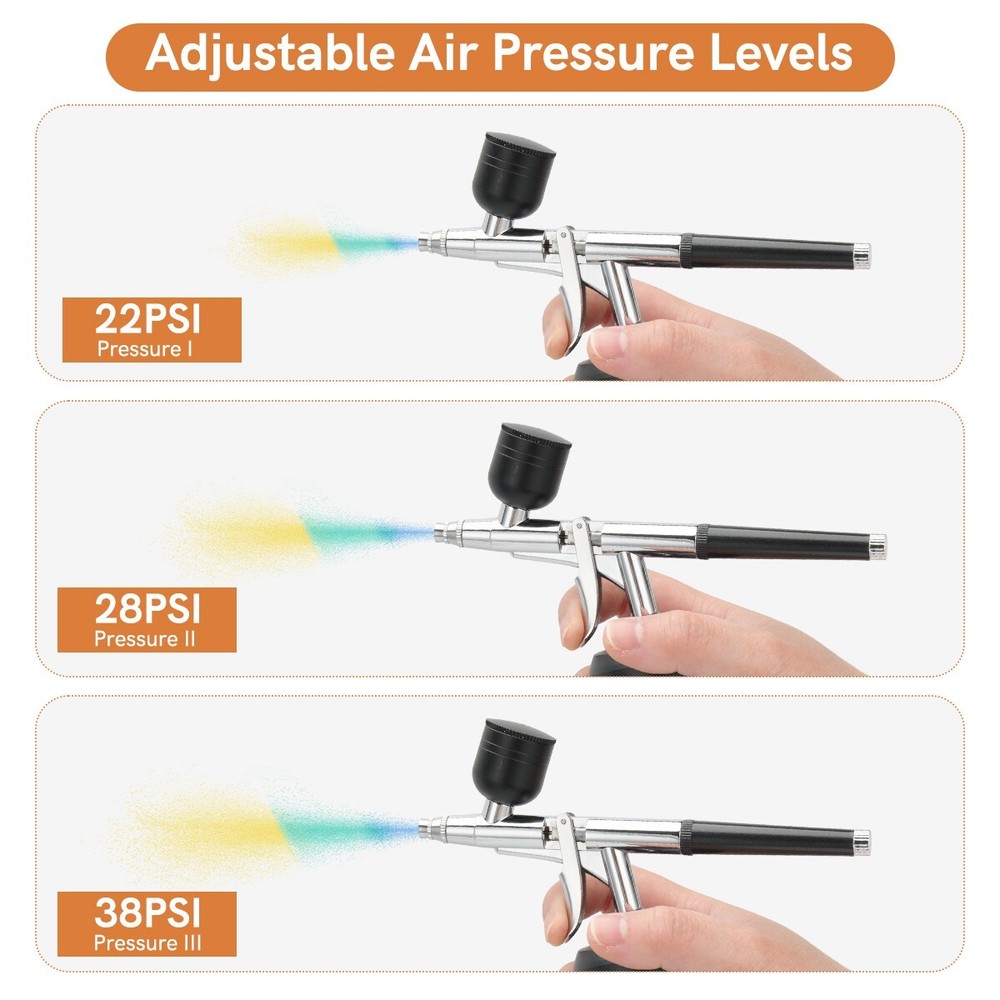 Cordless Rechargeable Airbrush Kit,Handheld Air Brush Sprayer Gun with Compressor 38 PSI Adjustable, LCD Screen, Air Hose Extension - Perfect for Barber,Nail Art,Cake Decor,Makeup,Model Painting F eatures : Unique Spray Gun Design: Unlike the conventional airbrush pen, which need to push down and pull back, this air sprayer has an exceptional ergonomic trigger design that allows for comfortable and precise control of the airbrush. With this uniqueness, it reduces hand fatigue and enables for extended use without any discomfort Adjustable Air Pressure: The airbrush machine is equipped with a 3-level air pressure control feature, ranging from 22PSI to a maximum of 38PSI. By controlling the air pressure, it's easier to manage the flow of paint or other materials, from fine lines and details to broader strokes and full coverage LCD Display: The cordless barber airbrush set comes with a built-in LCD screen, which allows you to easily track the remaining battery life and the pressure levels you are operating at. This feature eliminates the worry of running out of power unexpectedly Wide Range of Use: This airbrush compressor is highly adaptable and making it ideal for a variety of applications such as airbrush makeup, face moisturizing, nail arts, T-shirt and shoes painting, cake decor, miniature painting, temporary tattoos, building touch-ups, and car refinishing. It is perfect for individuals who enjoy customizing artwork both indoors and outdoors Portable & Convenient: This airbrush set is compact and lightweight, making it easy to carry around or store in a bag or backpack. The entire set is also easy to set up and take down, making it ideal for use at home or on the go. The package includes a 6.56ft air hose extension, it is particularly useful when working on larger projects or when you need to move around while using the airbrush Super User Friendly: The air brush kit has been designed with user-friendliness in mind, featuring simple controls that enable you to adjust both the airflow and paint flow to achieve your desired result. With a rechargeable battery, the fully charged airbrush can run continuously for more than 40 minutes and can be charged using various USB sockets, including power banks, adapters, laptops, and power boards Product Description Transform your artistic vision into reality with our high-quality airbrush kit, perfect for professionals and beginners alike. 0.3mm Needle & Nozzle Combination The 0.3 mm nozzle and needle is considered the most common and versatile option. Suitable for various mediums, including acrylics, watercolors, and liquid nail paints, making it a flexible tool for hobbyists. Unique Trigger Design With a simple press of the trigger, the airbrush activates and starts spraying. Releasing the trigger stops the spray, offering convenience and efficiency workflow for DIY enthusiasts. 2 Connection Modes One mode allows for direct connection to the airbrush, while the other mode involves using a 6.56ft air hose extension for greater flexibility and reach during use. LCD Display with 3 Adjustable Air Pressures Built-in LCD screen that allows you to monitor the remaining battery life and adjust the air pressure. 22 PSI: Suits for detailed painting such as make-up or manicure. 28 PSI: Suits for normal gradual painting such as cake decorating. 38 PSI: Suits for large scale painting such as street graffiti coloring. Everything you Need is In the Box: 1 x Airbrush Sprayer with Compressor 1 x 6.56ft Air Hose Extension 1 x 10CC Capacity Cup 1 x 20CC Capacity Cup 1 x 40CC Capacity Cup 1 x Nozzle & Needle Cap Set (extra) 2 x Cleaning Tools (O-Ring) 1 x Charging Cable 1 x Dropper 1 x Instruction Manual Cordless Airbrush Kit Parameter · Nozzle & Needle Size: 0.3mm · Interchangeable Cup Capacity: 10 / 20 / 40 CC · Air Pressure: 22 PSI / 28 PSI / 38 PSI (Adjustable) · Battery Capacity: 8V 950mAh rechargeable · Charging: 5V1A / 5V2A Type-C USB · Fully Charged Working Time: 50+ mins of continuous usage (may vary depending on different working conditions) Kindly note: It is recommended to use a 5V/1A or 5V/2A adapter, computer, or power bank to charge. The fast charger is NOT compatible with the product. Warm Tips: Before Use: Fully charge the airbrush upon receiving the product. Test the airbrush with clean water to make sure the nozzle is not clogged. It is necessary to dilute it with water or thinner. The recommended ratio for the paint to water or thinner is approximately 1:2 or 1:2.5. Use makeup foundations specifically designed for airbrushes, opt for water-based ones instead of oil-based ones. During Use: Do not use the airbrush while charging. If the air brushes for painting models can't spray liquid, it may be because the fluid control knob is too tight or the nozzle is blocked. Please try to adjust the fluid control knob or clean the nozzle with alcohol or paint cleaner. To prevent overheating, it is recommended to allow the machine to cool down periodically. We suggest cooling it down for a few minutes after 30 minutes of continuous use. After Use: Clean the airbrush thoroughly after each use or if stopped for more than 10 minutes. Otherwise the liquid will solidify and block the nozzle. DO NOT soak the airbrush, as it may cause damage to the delicate components of the tool. Cleaning and Maintenance Techniques: For Simple Cleaning: Begin by emptying any remaining liquids from the cup of the airbrush. Fill the cup with water, alcohol, or cleaning fluid, depending on the type of residue you want to remove. Spray the fluid out of the airbrush, allowing it to clean the internal parts. To clean the narrow chamber around the needle, try back flushing. Cover the nozzle with your finger or a paper towel and gently pull back the trigger. Release the trigger after a few seconds. Repeat this process multiple times. For Deep Cleaning: Rotate the pen tube counterclockwise to detach it from the airbrush. Unscrew the needle chucking nut in a counterclockwise direction
