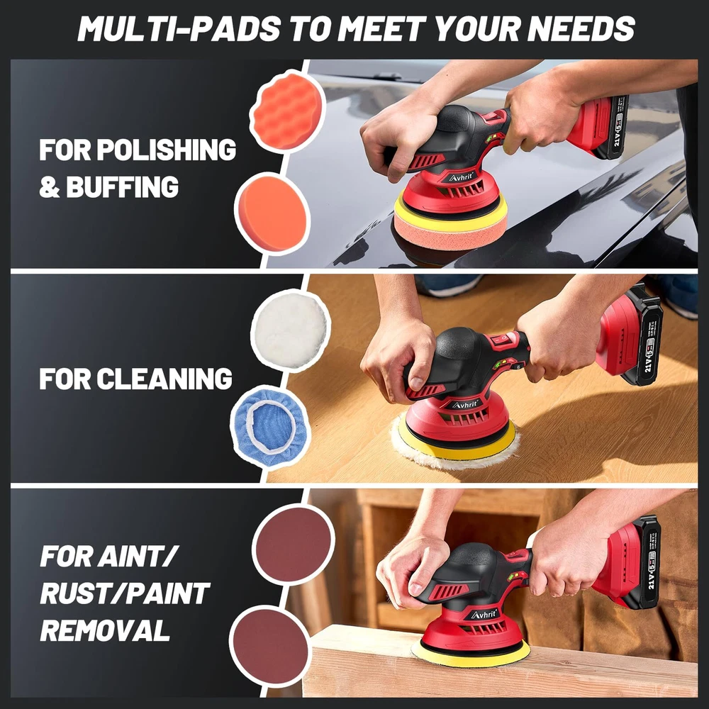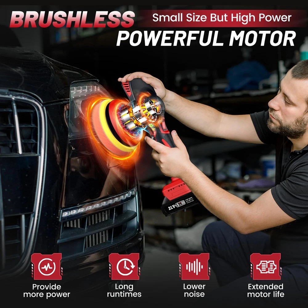 Time and Money Saver: Compared with the traditional corded polishers, this upgraded car cordless buffer is more portable to use, letting you get the rid of the trouble to drag, yank and position a cord. If your looking for fast results to remove swirls with cost effective tools and Dual action machine polishers/buffers, it comes to the right . This way, you’ll be able to remove any scratches and swirl marks and make your paint glossy again High-Performance Rotary Polisher: The powerful motor of cordless buffer produces up to 4500 RPM with low noise– powerful enough for a professional or beginner. The high-performance car polisher helps to increase your efficiency Lightweight and Cordless Design: Only 3 pounds light weight, compact and portable design make it easy for carrying and storage. A cordless polisher that is not limited by cables. You just plug in the battery, and you can use it anywhere Powerful Brushless Motor: This polisher has a built-in high-efficiency brushless motor, which can provide a maximum speed of 4500 rpm. The motor is made of copper with an anti-interference function and has lower noise,comfortable for daily use. Professional and safe, very suitable for beginners Large Capacity Battery: This polishing machine is equipped with 21 V 2.0 Ah batteries. And equipped with a fast charger. Use batteries alternately, no need to worry about running out of battery power, say no to battery anxiety Efficient Cleaning: 8 mm random orbit for a swirl-free finish, which enables more efficient cleaning than traditional polishers. And, it has 6 adjustable gears, you can choose 1600-2500 RPM, you can choose the appropriate gear according to different usage scenarios. This car buffers and polishers kit is an ideal polishing tool Wide Application: This dual action polisher is equipped with a variety of pads, you can replace different pads according to different scenarios. And with Velcro design, you can easily install it. Suitable for cleaning cars, furniture, wood, leather, tiles Updated design handle: More ergonomic handle design, wider than other car polishers and buffer handles, more suitable for long-term use. Beginners on the hand fast, and will not hurt the car paint 6 Inch Backing Plate: This car polisher is well made and features a hook and loop surface, you can easily change the various pads that come with the unit. Coming with a backing plate of approximately 6" diameter, the car polishers and buffers covers a good amount of space, works for larger areas faster, enables more efficient cleaning than traditional polishers What You Will Get: 1 * Cordless Buffer Polisher, 2 * Battery, 1 * Charger, 1* Loop Backing Plate, 2* Foam Pads, 2* Waffle Foam Pads, 1* Knitted Wool Pad, 2* Polishing Bonnet , 2* Sandpapers, and you get the LSA (Service Agreement), available at . offers a three-year