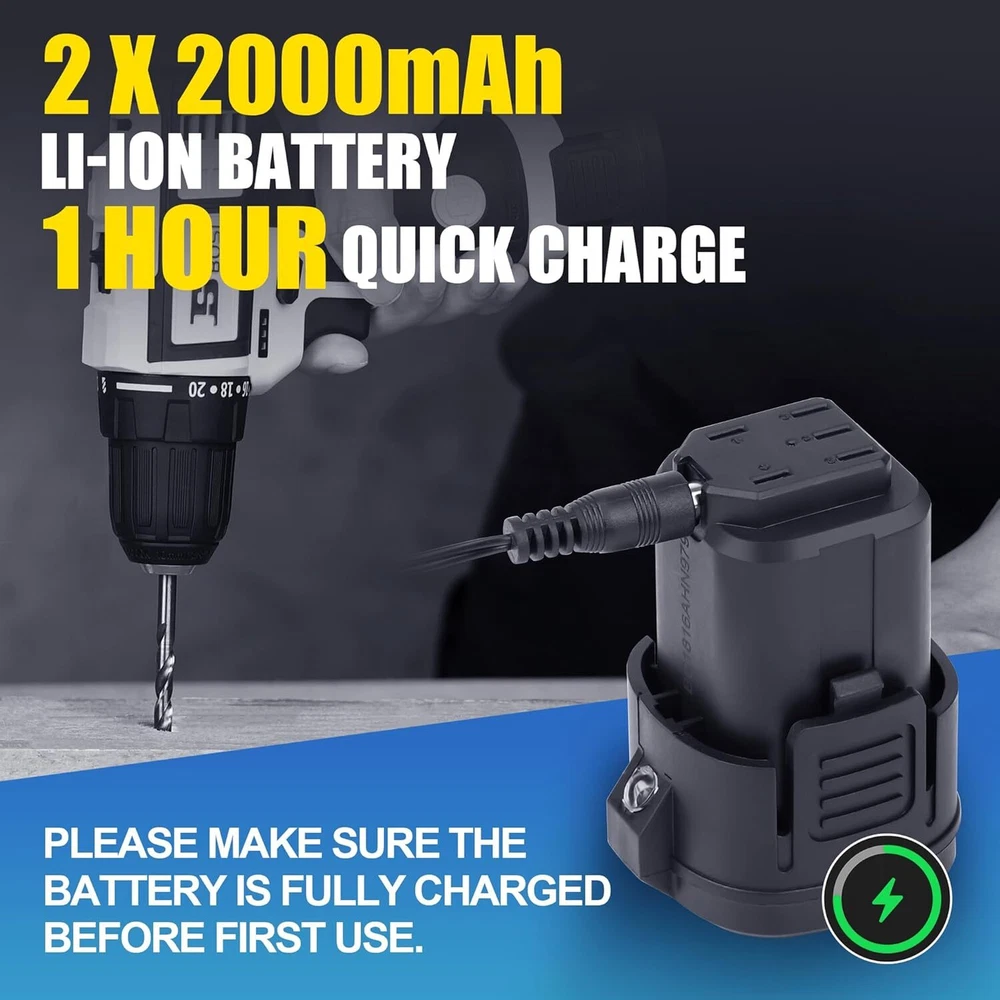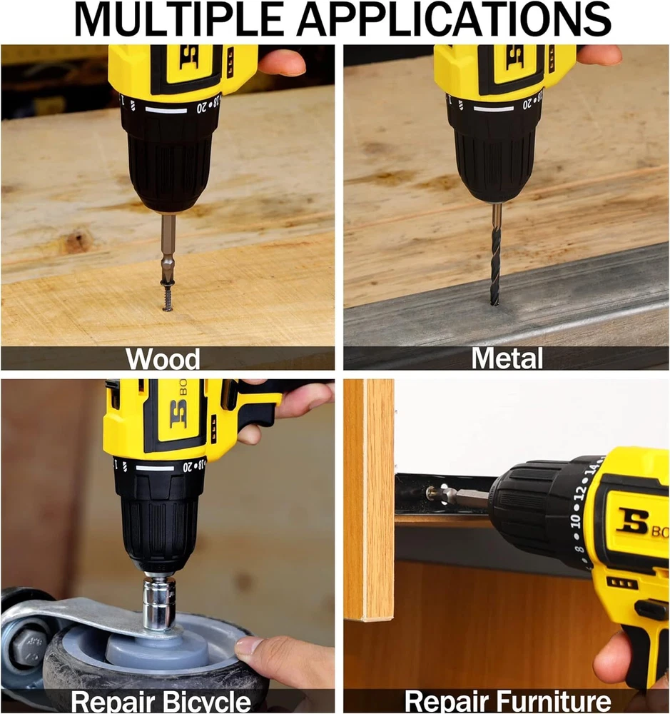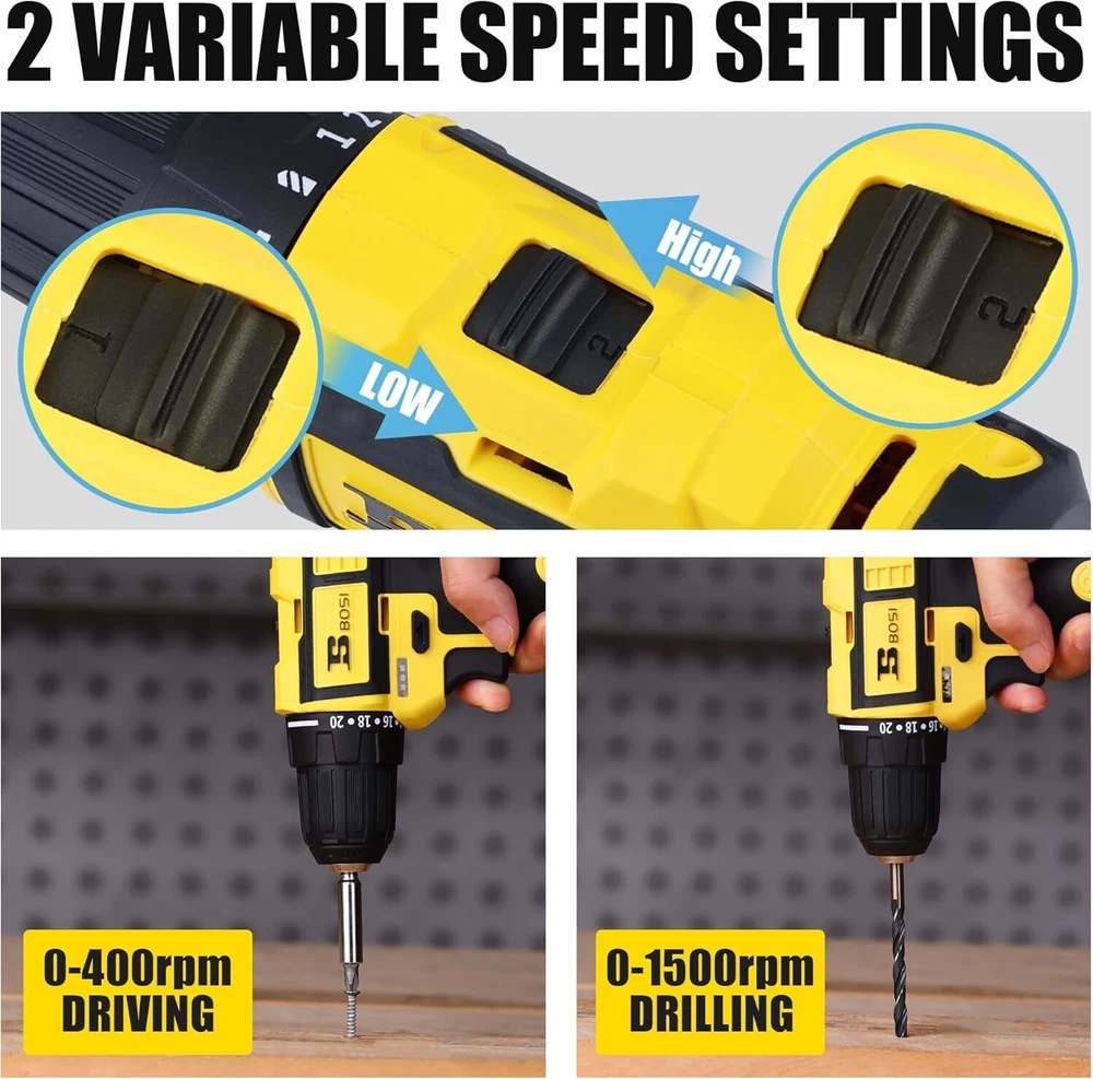Product Description Bosi Tools Cordless Drill Set 16.8V Power Drill Driver Kit With 2 2000Mah Batteries And Charger Brushless 3/8-Inch Keyless Chuck 2 Speed 20+1 Position Torque Setting 27Pcs Drill Screwdriver Bits Brushless Motor:This Power Drill Tool With 16.8V Brushless Motor Is More Powerful & Efficient, Longer Working Life, Less Noise, No Sparks When Use. 2Pcs Batteries & 1H Fast Charger: This Electric Drill Cordless Has 2Pcs 2000Mah Rechargeable Lithium-Ion Batteries With Power Capacity Indicator On The Handle And 1Pc 1-Hour Fast Charger. Extra Battery And Quick Charge Make The Drill Screwdriver Cordless Working Continuously. 20+1 Position & 2 Variable Speed: 20+1 Torque Setting And 2-Speed( 0-400Rpm & 0-1500 Rpm ) Provide Precise Adjustment And Control For Driving Screws Or Drilling Different Materials, Max Torque 354 In-Lbs (40Nm) "3/8"" Keyless Chuck & 27Pcs Accessories:3/8"" Keyless Metal Chuck With Automatic Spindle Lock Accepts A Wide Range Of Bits, And Very Easy & Quick To Change Bit. The Forward/Reverse Switch Allows You To Tighten Or Remove Screws. This Electric Screwdriver Set Comes With 27Pcs Various Drill And Screwdrive Bits For Daily Tasks. " Lightweight & Led Light:Compact And Lightweight Designed Drill Cordless Reduces Fatigue, Rubber-Covered Handle Provides A Comfortable Grip.This Cordless Power Drill Comes With Led Light Increasing Visibility And Safety In Enclosed Workspaces And Dark Environment. About Us We are a reputable seller with many years of experience selling on eBay. Our goal is to provide high-quality products and excellent customer service. Shipping Items will be shipped within 1-3 business days when we received payment. (Orders are not processed on weekends & holidays) Tracking information will be sent once item is shipped. Delivery time depends on destination and other factors Item is shipped to ebay address. Leaving correct address can minimize delay. For international shipping and shipping to Guam, Hawaii and Alaska, Please contact us before placing the order. International buyers please note: Import duties, taxes and charges are not included in the item price or shipping charges. These charges are buyer’s responsibility. We will try our best to reduce the risk of the custom duties. Local pick-up is unavailable at the moment. Contact Us We reply any email messages within 1 business / working days(off-duty at weekend). If you do not get a response from us, then please check your junk or spam mailbox. Our Business hours: Mon-Fri 9:00-18:00, UTC/GMT +8 hours. Please contact us either by clicking "contact seller" in the "purchase history" section or simply click "ask a question" at the bottom of this page. If you are unsatisfied with our item or service, please contact us before leaving any feedback. We are committed to resolve all issues in a friendly and satisfactory manner.
