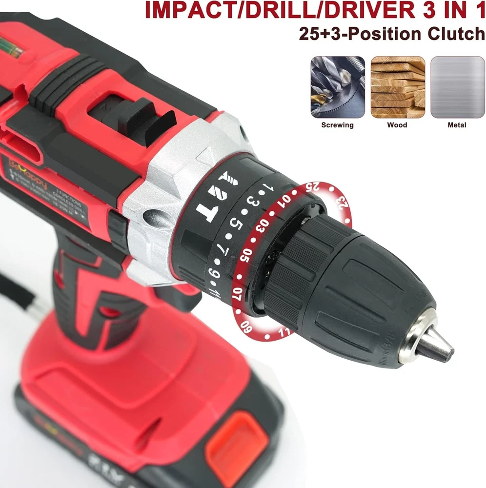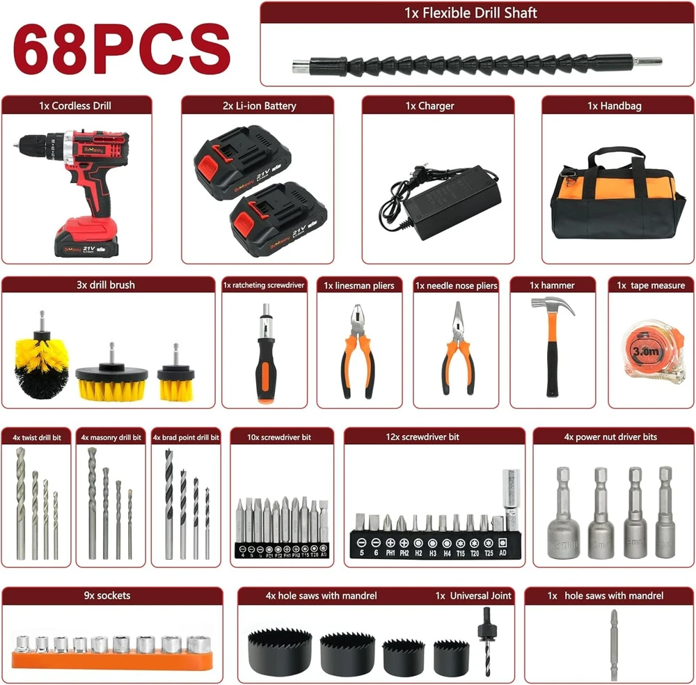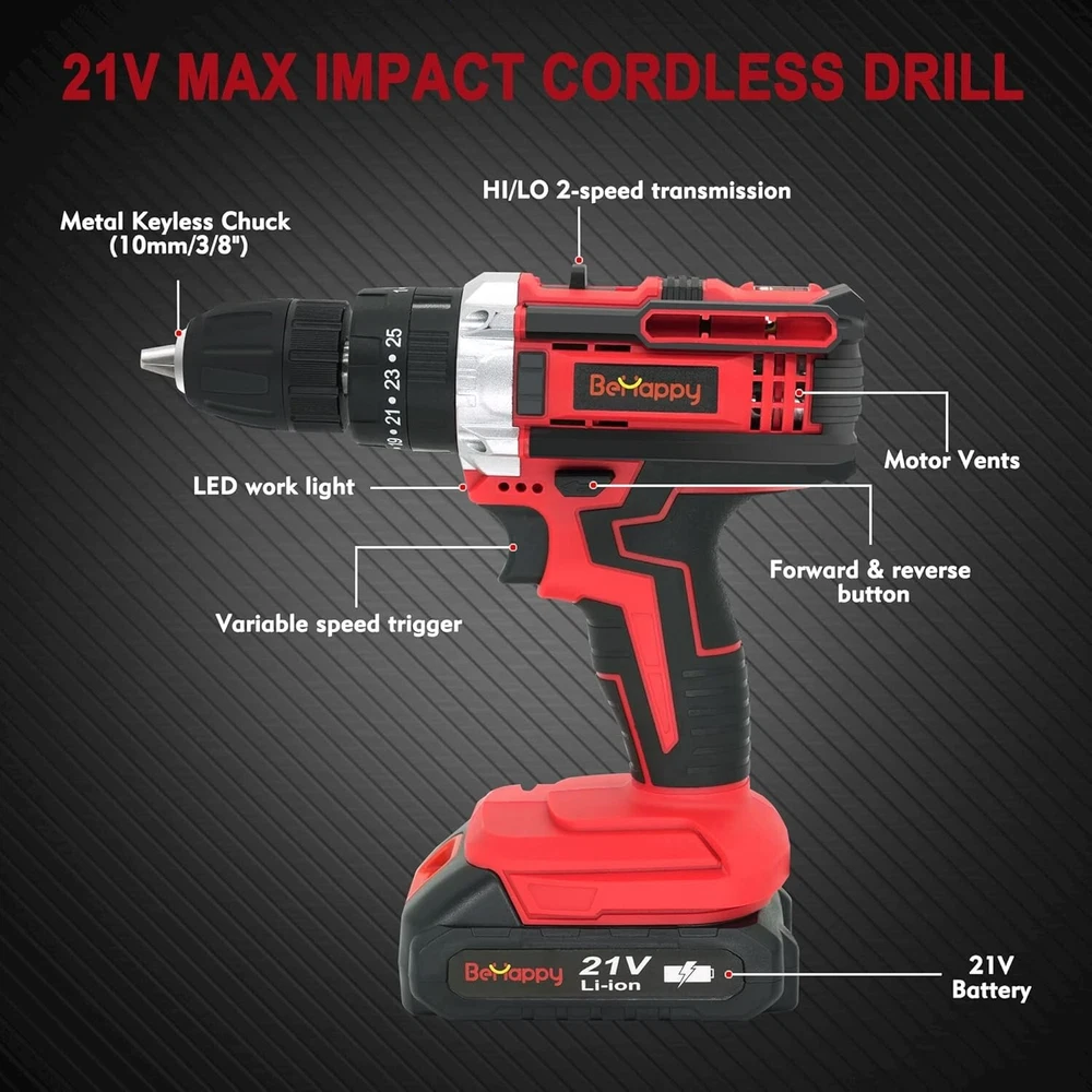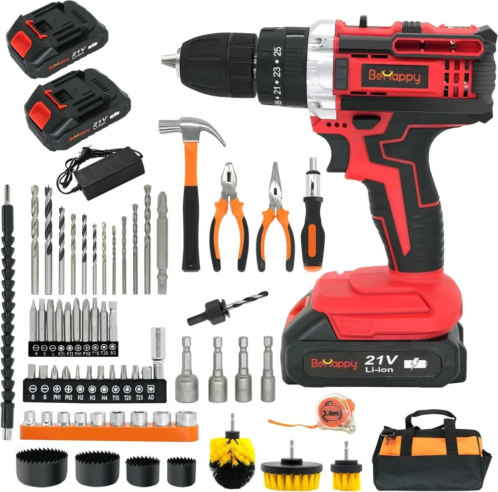 BEHAPPY Cordless Drill Set, 21V Power Drill Kit, Electric Power Drill Set with 2 Batteries and Charger, 25+3 Torque Setting, 2 Speed, 315 In-lb, LED, 63pcs Drill Bit, Impact Drill Set for Home, DIY 3/8 Inch Drill Driver: The drill driver with a max 21V can provide 315in-lb (35Nm) torque, and the 25+3-position clutch has three modes for you to choose from (impact, drive, drilling) has two modes for you to choose from. At the same time, it has 2-speed transmissions (0-600RPM/0-1850RPM), thus avoiding overdriving screws. The cordless drill set can handle most drilling and driving tasks Various Drill Bits and Accessories: In addition to the drill bit driver, the cordless drill bit set also provides you with some commonly used basic drill set and other accessories, so that you can complete some routines when you receive this set drilling, etc 2x 2000mAh Lithium-Ion & 1x Quick Charger: The cordless drill bit set comes with two 21V batteries and 1 quick charger, which can help the drill run continuously and ensure the durability of your entire working process efficient Ergonomic Design and LED Lights: The non-slip handle of the power tool combo kits is made of soft rubber, which is ergonomically designed and very comfortable to hold. At the same time, the cordless drill combo kit is equipped with LED searchlights, which can ensure your work is smooth and unobstructed even in a dark working environment Package Included: 21V cordless drill; 2pcs 21V Li-ion batteries; charger, storage bag, tape measure, 3pcs drill brush; needle nose pliers; linesman pliers; hammer; ratcheting screwdriver; 4pcs brad point drill bit; 4pcs twist drill bit; 4pcs masonry drill bit; 9pcs sockets; 10pcs screwdriver bit; 12pcs screw driving bits; 4pcs power nut driver bits; 4pcs hole saws with mandrel; 1pcs screwdriver; 1pcs Universal Joint