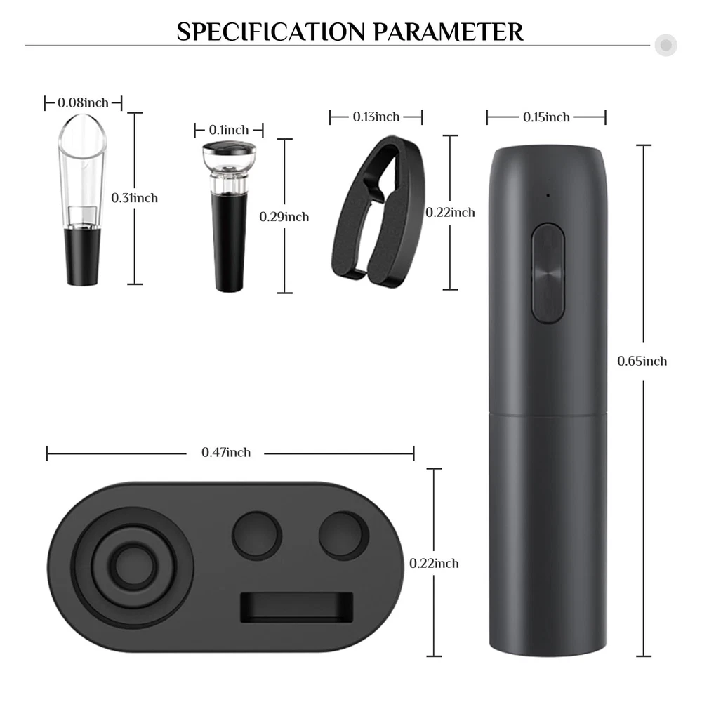 【RADIO CHARGING BASE】 Say goodbye to batteries! The rechargeable feature and included charging base ensure that your electric wine opener is always ready to go. No more searching for batteries. 【CONVENIENT AND SAFE】 The Electric Wine Corkscrew removes cork and releases in 6-8 seconds. Enjoy fast and smooth cork removal without leaving any marks. 【COMPATIBLE WITH MOST WINE BOTTLES】 The most efficient and convenient way to open a bottle without damaging the cork or creating cork fragments, no pulling, twisting or breaking of cork fragments. 【VACUUM STOPPER】 Vacuum stopper is made of food-safe material, stable pouring speed reduces spills and mess. The freshness preserving vacuum pump prevents wine waste and slows down the oxidization process. 【THIS IS A THOUGHTFUL PRODUCT FOR WINE LOVERS】 Electric rechargeable wine bottle opener is a must-have for every wine lover, whether it's a holiday, a birthday or a special occasion, you can give it to your beloved ones so they can enjoy more wine.