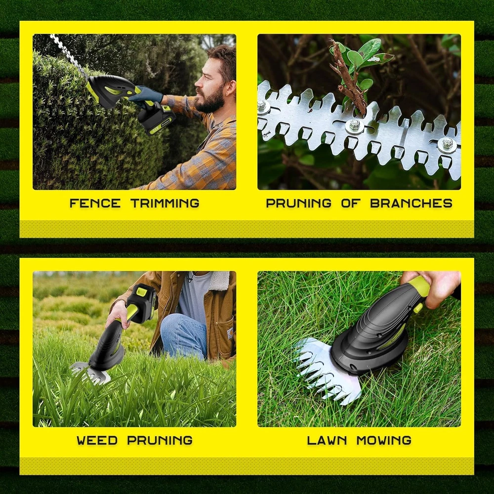 Cordless Hedge Trimmer with Battery and Charger Included, 2 Black + 1 Description Features: Perfect Gardening Tool - 21V Cordless Hedge Trimmer: Clever design combining long blades and short blades, not only cutting thin shoots on hedges, bushes, small trees, and ornamental easily, but also cutting grass, weeds and small sections of lawns effortlessly. It’s a perfect tool to maintenance flowers and trees pruning of lawn, garden, park... It's also a nice present of birthdays, housewarming parties, Father's Day, Mother's Day, Thanksgiving Day, Valentine's Day and Christmas, etc. Safety Lock Features: The electric hedge trimmer come with safety switch to prevent accidental injury during use. The upper trigger safety lock-out prevents accidental starting, push the trigger lock and press the trigger at the same time to start the shrubbery trimmer. Portable, Cordless & Durable: Hedge trimmers cordless with battery have compact size and easy use. 1 batteries extend the tool's time of use, give you plenty of time to finish the gardening job. 1 Pack Rechargeable Battery With Charger : Elecshion hedge trimmer is powered by rechargeable & detachable lithium battery (21V 1500mAh), which makes it hassle-free to use. Fully charged in 2 hours for about 60 minutes working time totally. The cordless grass shear & shrubbery trimmer has enough power to complete your gardening/pruning task. ATTENTION: 1) Please take off the batteries after finishing work! And then charge the battery fully before storage. 2) Clean and dry the shrub shears and cutting blades. Product Details: Brand: Elecshion Power Source: Battery Powered Color: Black + 1 Battery Product Dimensions: 11"L x 4"W x 6"H Item Weight: 1 Pounds Blade Length: 7.33 Inches Blade Material: Alloy Steel Item Weight: 1 pounds Manufacturer: Elecshion Country of Origin: China Item model number: E-J147-1B Batteries: 1 12V batteries required. (included) Handling We will ship all orders within 1 business day of payment. Delivery We Do Not Ship Outside of the Continental US. Return Policy All items qualify for returns within 30 days of receipt. Buyer is responsible for return shipping on any item that is not damaged. Feedback We take our reputation seriously, we buy and sell online, so we understand the value of trust. If you are unsatisfied with your order, please contact us and we will work with you to resolve it to your satisfaction.