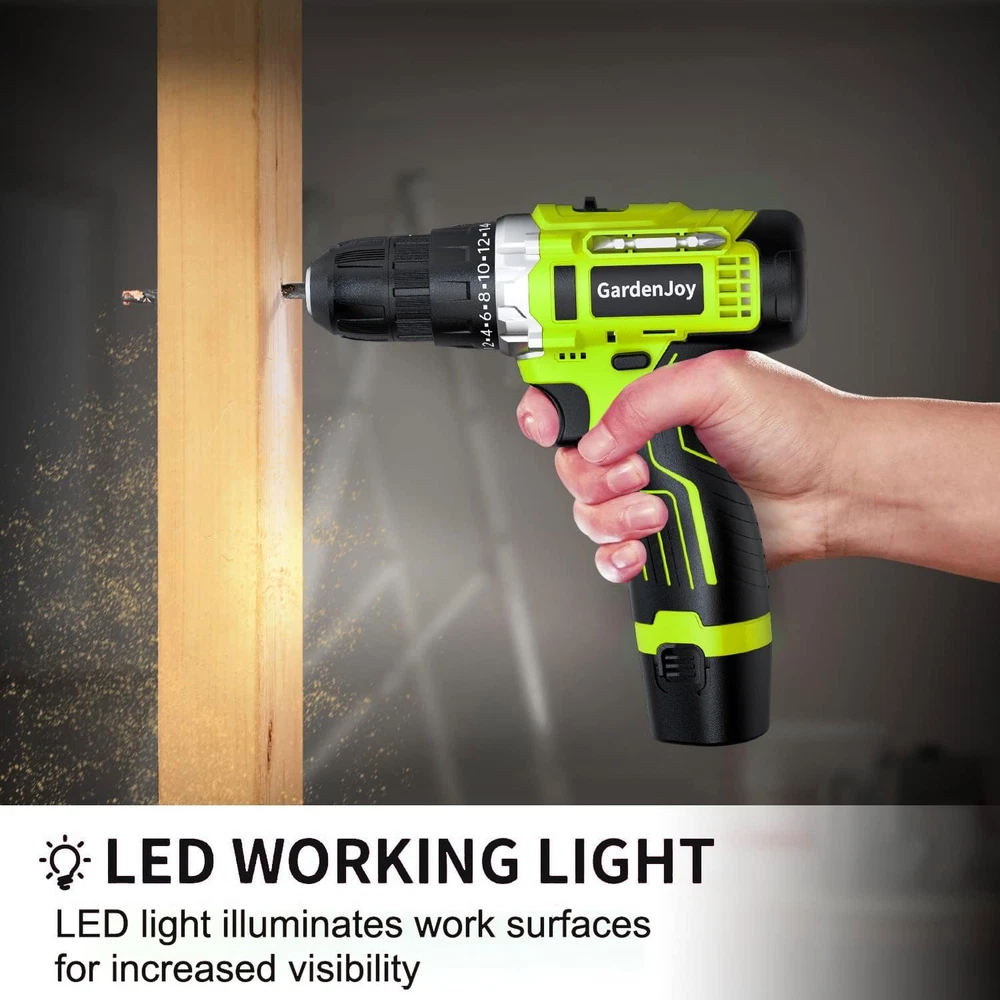 [MULTI-FUNCTION CORDLESS DRILL SET] GardenJoy power drill with superior motor, max torque 180 in-lbs(20N.m), It's perfect for drilling wood, metal, plastics, and all screw driving tasks at home, and many other DIY and craft projects. [24+1 POSITION CLUTCH AND 2 SPEED] Electric drill has 24 position clutch and drilling modes, it can provide more precise torque adjustment as required. Cordless power drill also has 2 variable speed setting (0-450 RPM or 0-1500 RPM). .[RECHARGEABLE BATTERY POWERED DRILL] This 12-volt electric drill is equipped with 1500mAh lithium-ion battery that can provide super use life, so you don't have to worry about running out of power in the middle of use. [LIGHTWEIGHT AND COMPACT DESIGN] Drill weighs only 2lbs, making it very easy to carry. Women can also easily use this power drill for drilling or screwing work. It's equipped soft rubber handle that is both non-slip and gentle to touch. [HIGH-PERFORMANCE WORKING] Built-in LED light for safety and reliability when working in dark or confined areas; Flexible shaft helps you to drill the places that are difficult to reach; Torpedo level helps you adjustments and calibration. [OUR DRILL/DRIVER KIT INCLUDE] Drill x 1, battery x 1, charger x 1, drill bit x 5, screwdriver bits x 9, socket adapter x 1, extension rod x 1, sockets x 9, flexible shaft x 1, screw kits x 37, torpedo level x 1, double screwdriver bit x 1, manual x 1. [FINEST BRAND CUSTOMER SERIVCE] Our machine has 12 month support, if you encounter any problems during using our cordless power drill, please contact us first time, we will reply within 24 hours. Product Description Enjoy Your New GardenJoy Power Drill Set Electric Drill with 65Pcs Acessories - Get DIY and Drilling Projects Finished! GardenJoy 12V battery powered drill Kit is perfect for tasks around the home. Whether you're decorating your home, assembling furniture, tending your garage and workshop, or performing daily office, home maintenance or drilling holes in wood, plastic and metal as well as driving in/out screw, this drill set has got you covered. EFFICIENT DRILLING This drill driver is powered by a powerful motor, providing a maximum torque of 180 in-lb which helps you set the right power to drill into wood, ceramics, plastics, and even metal with ease. The high speed setting is for drilling. QUICKLY SCREWDRIVING The battery powered drill has a 24+1 torque position clutch and 2-speed control setting which provides more precise control for driving in/out screws to prevent tripping. The low speed setting is for driving screws. 1 24+1 TORQUE SETTINGS 2 2 VARIABLE SPEED 3 FLEXIBLE SHAFT 4 SMART BATTERY PACK 5 PACKING LIST You can control the speed you need at any time. Screw direction will not deviate due to too fast starting speed. The forward/reverse switch allows screws driving or unscrewing with convenience. An LED work-light enabling you to safely drill in hard to see areas, LED light illuminates any dark work space. Improved ergonomics and rubber grip can effectively enhance the feel of your work to relieve fatigue.