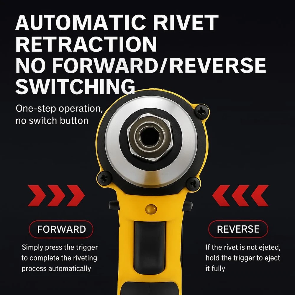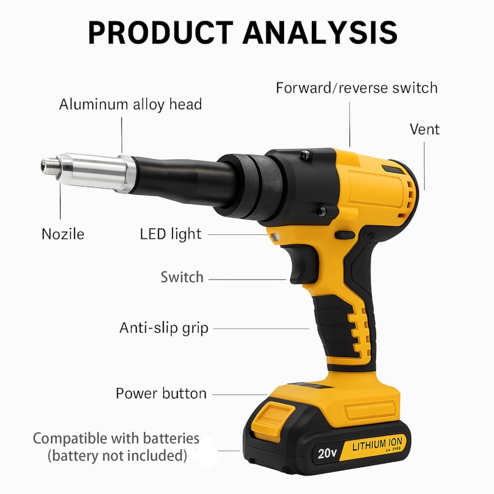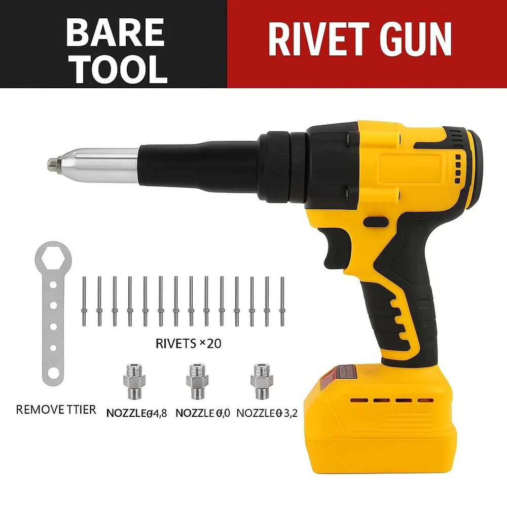 20v Cordless Rivet GunKit:Professional-Grade Power Meets Unmatched Portability Key Selling Points & Features: 1.Heavy-Duty Versatility: Effortlessly pull3/32"", 1/8"", 5/32"", and 3/16"" steel orstainless steel rivets across metals ofvarying thicknesses-ideal for auto repair,steel fabrication, or marine projects. 2.Unrivaled Cordless Performance: The firstwireless rivet tool to deliver 2,000 lbsof pulling force, completing up to 450+1/8"" steel rivets per charge. Eliminatecompressors, hoses, and 60%+ manualeffort. 3.Ultra-Compact Design: At just 6.5"" long,tackle tight spaces (door panels, kayakhatches, RV interiors) with precision. 4. Pro-Grade Durability: Engineered forjobsite toughness-2x longer lifespan thancompetitors, built to withstand drops, dustand daily abuse. 5.Universal Compatibility: Works seamlessly with for 20V batteries (soldseparately), making it a go-to upgrade forexisting tool ecosystems. Category Keywords: rivet gun ,rivet gun,cordless rivet gun,rivet nut tool,electric rivet gun,rivet gun 20v Why Choose 20v Rivet Gun? Whether you're reinforcing aluminumboat hulls at the beach,repairing garageequipment,or securing campervan windows,this tool redefines efficiency. lts 0.8”stroke length ensures rapid, consistentpulls-no jams, no fatigue. For mechanics,metalworkers, or DlYers, it's the ultimateblend of muscle and mobility For Marine Use: Fix corroded rivets ondockside kayaks in minutes. Auto Shops: Replace door panel rivetswithout wrestling with air hoses. RV/Camper Maintenance:Secure loosefixtures in cramped interiors effortlessly Value-Driven Design: Ditch bulky pneumatic kits.With weather resistance and a lightweight frame,the Cerycose thrives in humid, dusty,or greasy environments.Includes a 60-piecequick-set accessory kit (mandrels, nozzles)for instant adaptability Specs: Max Pull Force: 2,000 lbs Stroke Length: 0.8"" Weight: 4.2 lbs (tool only) Upgrade Your Toolkit-Experience cordlessfreedom without sacrificing industrialstrength.Perfect for pros who demandMilwaukee-tier performance at a smarterprice. " Cordless Freedom: Get the job done right without the hassle of cords! Our cordless pop rivet gun runs on a De--Walt 20V battery (battery not included), giving you the power to work anywhere, anytime. No more tripping over cords or being limited by outlets - just pure, unrestricted movement for all your auto repair, metalwork, and DIY projects. It's professional-grade performance, but with the convenience of cordless. Brushless High-Torque Motor: Handles Tough Jobs with Ease!This electric pop rivet gun is equipped with a brushless high-torque motor, specially designed to tackle even the most stubborn rivets! Its powerful pulling force ensures rock-solid, precise riveting every time. Whether it's high-intensity work in auto repair shops or precision tasks in metalworking, its reliable and durable performance makes it your ultimate workhorse. Get More Done, Faster: The ApMiexYo cordless rivet tool makes switching rivet sizes a breeze—no tools needed! Just pop off the nose piece and swap in the size you need. It comes with three sizes (1/8", 5/32", 3/16") and 20 aluminum rivets (20 of each size). Need speed? Hit the mode switch for pneumatic rivet gun power. Need precision? Flip to electric nail gun accuracy. Perfect for HVAC installations and trim work—it’s your all-in-one solution for tough jobs! One Gun, Endless Possibilities: Whether you're dealing with 1/8" or 3/16" rivets, this bad boy handles them all—no extra tools needed! It's your go-to partner for everything from auto repairs to weekend DIY projects. Need to secure threaded drive nuts or blind rivets in tight spots? This electric beauty delivers pinpoint accuracy with zero hassle. Just point, pull, and done—your all-in-one solution for tough jobs! Automatic & Reverse Switch, Easy Work! This cordless beauty has a built-in brain: release the trigger, and it automatically spits out rivets like a pro. Need to adjust a rivet? Hit the reverse switch and tweak it on the spot—no more second-guessing. It’s the ultimate precision tool for auto techs and metalworkers who demand accuracy and flexibility. One pull, perfect placement every time.