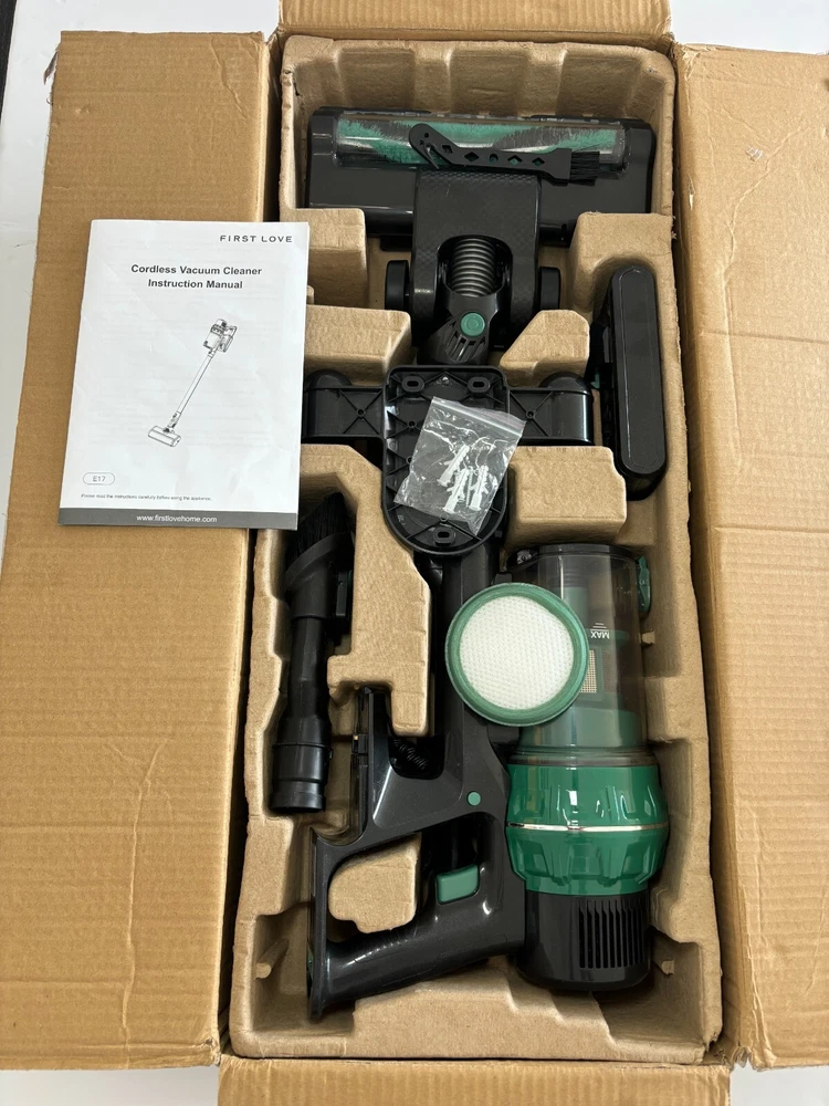 Seller Notes: “Articulo prácticamente nuevo, solo caja abierta , por favor ver los detalles en las fotos” Color: Green Voltage: 220 V Included Accessories: Charger, Crevice Tool, Filter, Nozzle Capacity: 1.2 L Brand: First Love Item Weight: Less Than 10 lb Type: Stick Runtime: 20-35 minutes Charge Time: 4 hrs Model: FirstLove Cordless Stick Vacuum Cleaner E17 Smart Home Protocol: Powerline/UPB Filters: Washable Cord Type: Cordless Features: Battery Operated, Carpet Cleaning, Compact, Handle Controls, Portable, Rotating Brushes, Telescopic Handle, Wall Mounted Protection Plan: No Coverage Bagged/Bagless: Bagless