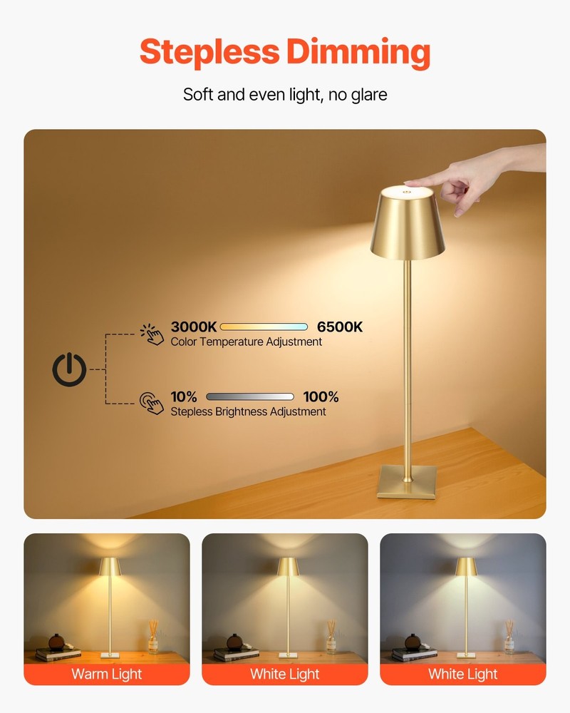 ●【Product Information】Stable StructureTouch ControlSpray Coating ProcessLarge Capacity BatteryVersatile Use3000-6500K Color TemperatureTotal Battery Capacity: 5200mAhSize: 4.3 x 4.3 x 15 inch / 110 x 110 x 370 mmItem Model Number: T7Color Temperature Adjustment: 3-color Stepless Dimming (Long press for stepless brightening long press again for stepless dimming)Product Weight (Including All Accessories): 2.69 lbs / 1.22 kgNumber of Battery Cells: 2 cells ✅ 【Features】● Multi-purpose Design: The detachable lamp head easily fits into a bottle neck, transforming into a creative bottle lamp. Ideal for both everyday lighting and special occasion decor, the cordless lamp creates a romantic and unique atmosphere● Customize Your Light: Long p... VEVOR Cordless Table Lamp,2-Pack,5200mAh Built-in Rechargeable Battery Desk Lamp,Stepless Dimming Up,3 Adjustable Heights,Detachable Lampshade for Bottle,Restaurant,Bedroom,Outdoor,Gold ●【Product Information】 Stable Structure Touch Control Spray Coating Process Large Capacity Battery Versatile Use 3000-6500K Color Temperature Total Battery Capacity: 5200mAh Size: 4.3 x 4.3 x 15 inch / 110 x 110 x 370 mm Item Model Number: T7 Color Temperature Adjustment: 3-color Stepless Dimming (Long press for stepless brightening long press again for stepless dimming) Product Weight (Including All Accessories): 2.69 lbs / 1.22 kg Number of Battery Cells: 2 cells ✅ 【Features】 ● Multi-purpose Design: The detachable lamp head easily fits into a bottle neck, transforming into a creative bottle lamp. Ideal for both everyday lighting and special occasion decor, the cordless lamp creates a romantic and unique atmosphere ● Customize Your Light: Long press to adjust brightness (10%-100%) for the ideal lighting in any space. Choose from 3 color temperature options: Warm Light (3000-3500K), Warm White (4000-4500K), and White Light (6000-6500K) ● 3 Height Adjustments: The rechargeable lamp supports 9.45-19.69 inches height adjustment, allowing you to find the ideal lighting angle and reduce neck and eye strain. It fits on desks, nightstands, or coffee tables, adapting to various space layouts ● Built-in Large Battery: The cordless table lamp comes with two 2600mAh rechargeable batteries, providing up to 8 hours of use on the bright setting and up to 100 hours on the low. Fully charges in 6 hours via the included Type-C cable ● Elegant & Durable: The rechargeable table lamp's pole and base are made from high-quality aluminum, ensuring it's lightweight yet durable. The metal finish enhances rust-proof and scratch-proof durability, keeping it looking great over time Item Specifics Type Desk Lamps Brand Unbranded Color Golden About us Dear buyer, Thank you for visiting my store! Our warehouses are located in many regions around the United States. According to the customer's delivery address. Use USPS/UPS/DHL logistics transportation service. Prioritize the best quality logistics solutions to transport packages. Ensure package delivery time, At the same time. Have any after-sales problems, Feel free to contact us. At your service Payment PayPal is our preferred method of payments it's the quickest, easiest and most secure way to pay for your goods or services online. PayPal offers buyer and seller protection should there be a problem. If you do not have a PayPal account, to get started and buy your first item with us is very easy. Simply click on the 'Buy It Now' button and follow the eBay checkout steps. Select PayPal as the payment method you then will be given the chance to enter your card details in to PayPal's secure checkout in order to pay for your order. Shipping 1. Your purchase is shipped directly to you as soon as we have received your cleared payment. 2. Normally all of parcels would be shipped within 3days(From Monday to Saturday). 3. We will send information on eBay or email if the parcel was delayed due to our holiday. 4. We provide three kinds of shipping for choice. Shipping way depend on delivery address. Returns If an unit is received defective, of course we take it back or replace it. If the unit is received as expected, we must charge for our expenses if you want to send it back. We have to charge for the work of handling, retesting and restocking. DESCRIPTION PAYMENT SHIPPING RETURN POLICY CONTACT US Shop Category Store Home Home & Garden ◈ Tools ◈ Ride-Ons & Tricycles ▷ Furniture ♢ Sofa Other Hot Item Tool| 8 Pockets Horticulture Raised Garden Bed Elevated Wood Planter Box Stand w USD 115.20 Tool| 6-Inch 412 CFM Inline Duct Fan: Air Circulation Vent Blower for Hydroponic USD 108.40 Tool| 71" Metal Garage Storage Cabinet with Wheels - Heavy-Duty Tool| Storage Ca USD 272.00 Tool| Peat Moss Spreader 24inch,Compost Spreader Metal Mesh,T shaped Handle for USD 140.90 Tool| Large Package Delivery Parcel Mail Drop Box for Black, 10.5" x 15.5" x 41. USD 264.60 Picture New List Item Help & Info Payment Policy Shipping Policy Return Policy FAQ About Us VEVOR Cordless Table Lamp,2-Pack,5200mAh Built-in Rechargeable Battery Desk Lamp,Stepless Dimming Up,3 Adjustable Heights,Detachable Lampshade for Bottle,Restaurant,Bedroom,Outdoor,Gold ●【Product Information】 Stable Structure Touch Control Spray Coating Process Large Capacity Battery Versatile Use 3000-6500K Color Temperature Total Battery Capacity: 5200mAh Size: 4.3 x 4.3 x 15 inch / 110 x 110 x 370 mm Item Model Number: T7 Color Temperature Adjustment: 3-color Stepless Dimming (Long press for stepless brightening long press again for stepless dimming) Product Weight (Including All Accessories): 2.69 lbs / 1.22 kg Number of Battery Cells: 2 cells ✅ 【Features】 ● Multi-purpose Design: The detachable lamp head easily fits into a bottle neck, transforming into a creative bottle lamp. Ideal for both everyday lighting and special occasion decor, the cordless lamp creates a romantic and unique atmosphere ● Customize Your Light: Long press to adjust brightness (10%-100%) fo