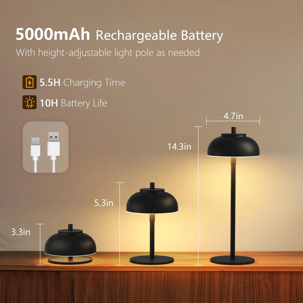 🔋Rechargable Battery Powered Table Lamp: Built-in 5000 mAh rechargeable battery, can be used for 20~42 hours, chargeable table lamp fully charged by USB C cable for 6 hours (also can be used while charging), this feature makes it a perfect LED portable desk lamp that save bills on batteries and . 🔋3 Color Stepless Dimmable: This cordless table lamp provides 3 color temperature: Warm White, Neutral White, Cool White(3000K-5000K). Light touch to switch the color temperature. Long press to adjust the brightness, stepless dimming (10%-100%). Our led table lamp allows users to freely adjust the brightness and color according to different usage scenarios. 🔋Versatile Cordless Lamp: Say goodbye to cords! This lamp is designed to be cordless and can be powered by USB, giving you the freedom to use it anywhere. Whether you're camping, having a picnic, or enjoying a meal at a restaurant, this portable lamp serves as the perfect outdoor table companion. 🔋P65 Waterproof, Outdoor Use: outdoor table lamp cordless features an IP65 waterproof design, ensuring excellent water resistance. Lightweight and portable, an ideal lamp for indoor and outdoor like camping, patio, garden , kitchen, restaurant etc. 🔋Reliable After-sales and : provides return/exchange service with 1 year . If you encounter any issues or have any questions about this rechargeable LED cordless table lamp, please feel free to us. Your satisfaction is our priority!