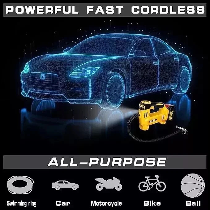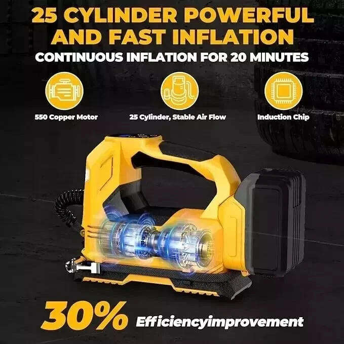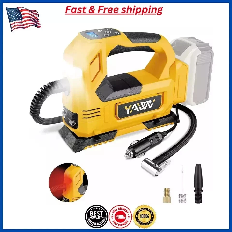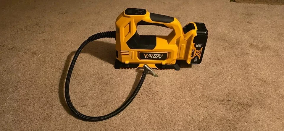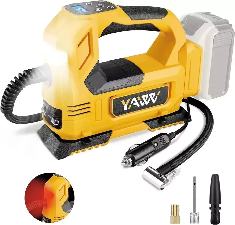 About this item Compatible with Dual Power: The YAWV portable air compressor is compatible with De-Walt 20V max Lithium Battery, powerstack battery, suitable for DCB203、DCB204、DCB206 and more. At the same time, our tire inflator comes with an 11FT long 12V car cigarette lighter plug and supports car power supply, which is perfect for use indoors and during travel. 25 Cylinder Powerful and Fast Inflation: The tire inflator is equipped with a high-performance 550 pure copper motor, which outputs strong power and has a stable air flow of 35L/MIN. It can inflate 215/55 R17 car tires from 0 to 36psi in 4 minutes, and it only takes 1 minute to quickly inflate 29-36psi. , return your tires to their best condition in a short time. Please note that after 20 minutes of continuous use, please allow the air compressor to fully rest and cool down before continuing to use it. Automatic inflation with preset tire pressure: No more manually checking tire pressure or worrying about over-inflation. Our air pump is equipped with an advanced sensing chip so that it has an intelligent preset function and can accurately monitor tire pressure with an error of less than 0.5psi. You only need to set the required tire pressure and the air pump will automatically inflate and stop to ensure that the tire pressure reaches the maximum Best level. Digital Display and LED Lighting: The portable tire inflator is equipped with a high-precision, high-brightness display to help you detect tire pressure in real time. And the air compressor pressure gauge has four display modes, which can display pressure in PSI, BAR, KPA and KG/CM². 4 bright LED lights allow you to use it easily even in the dark. Convenient Storage: The tire inflator has an integrated accessory storage compartment and is equipped with different specifications of valves, compatible with SUVs, cars, motorcycles, bicycles and other sports equipment. The pump tube storage slots designed on both sides of the base allow you to store and carry it easily and concisely. This package includes: YAWV air pump, 12V power cord, three nozzles and a user manual.