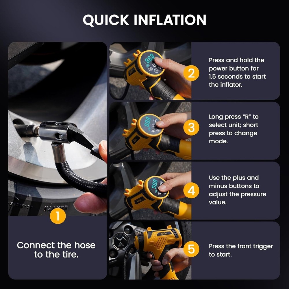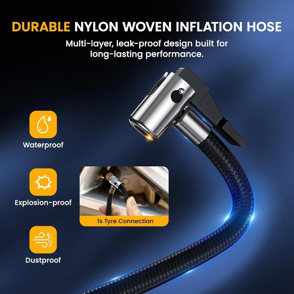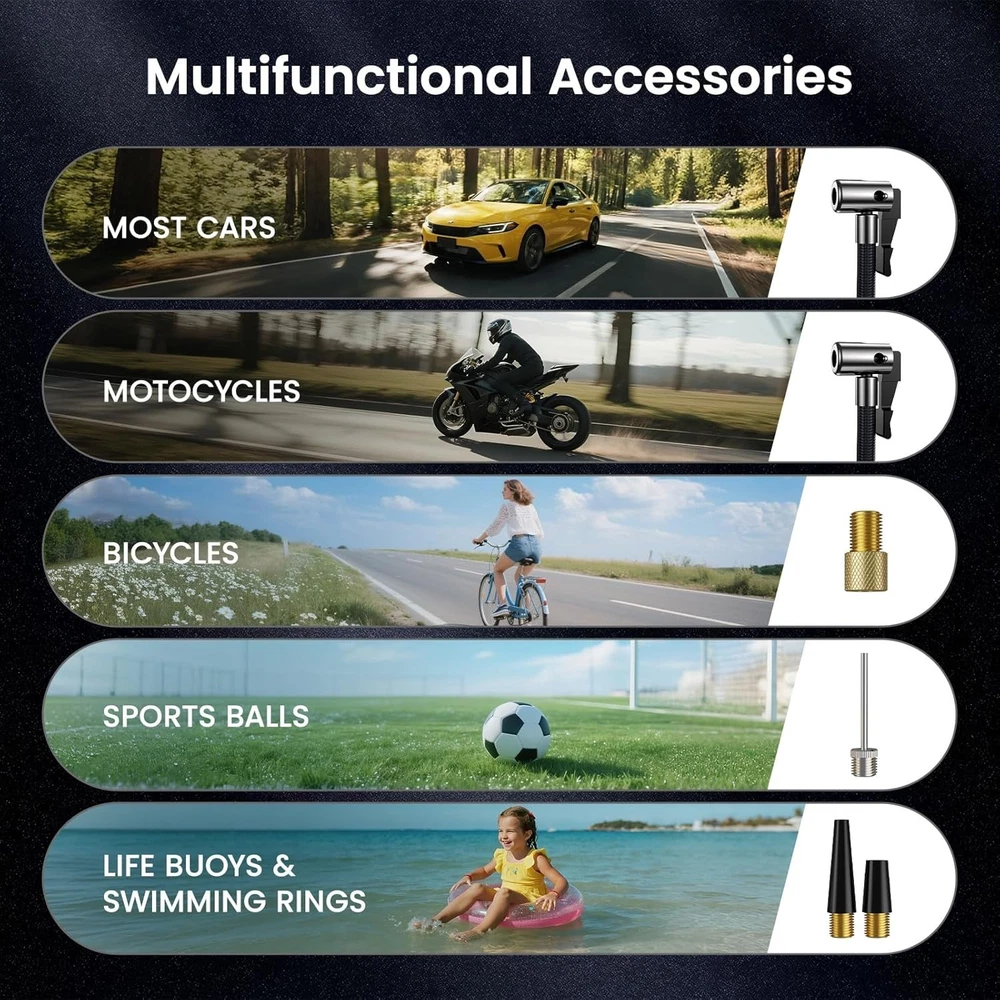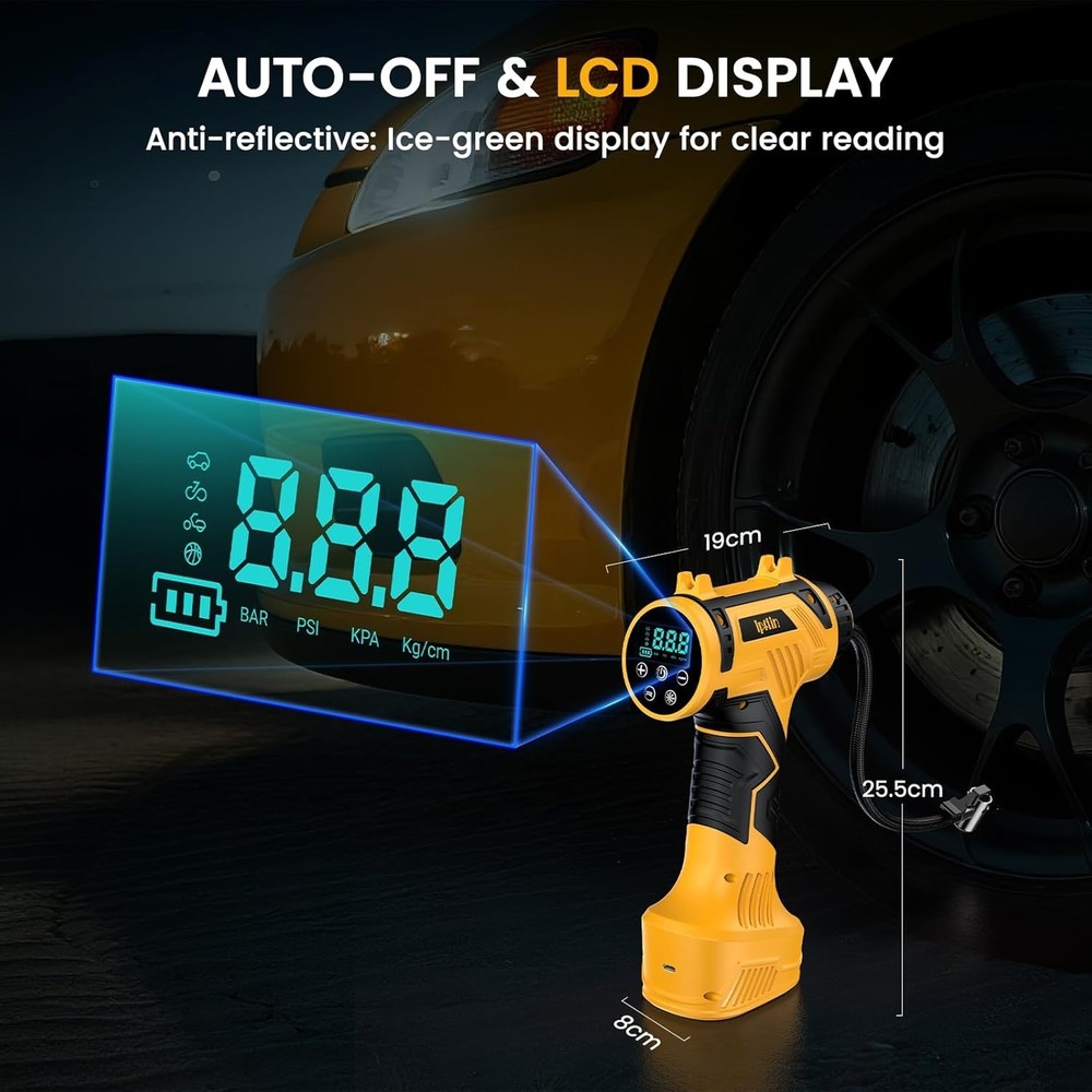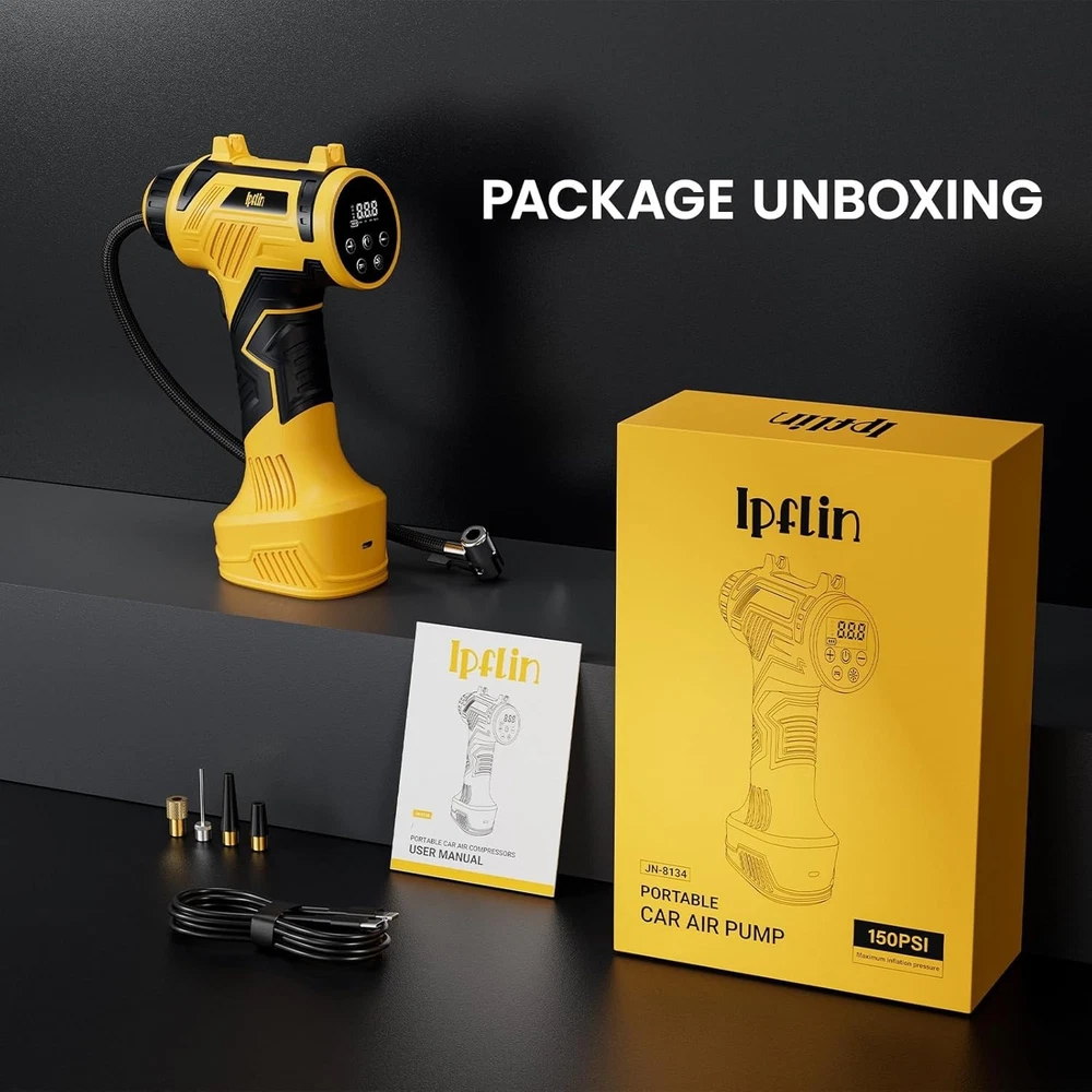 Stay prepared wherever you go with the Ipflin Cordless Digital Tyre Inflator . Compact, powerful, and easy to use, this rechargeable air compressor is ideal for cars, bikes, motorcycles, sports balls, and inflatables—perfect for home, travel, or roadside emergencies. Key Features & Benefits ✅ Cordless & Ultra-Portable Lightweight handheld design (only 600g ) allows inflation anywhere—no cables, no power outlet needed. Ideal for cars, outdoor use, and emergencies. ✅ Cool-Grip Ergonomic Design Smart battery placement and advanced heat management keep the handle cool during use. The pistol-grip design offers excellent comfort and control. ✅ Rapid Inflation – Saves Time Delivers 22L/min airflow , inflating a standard car tyre in under 3 minutes . Fully charged battery provides up to 20 minutes of continuous use . ✅ Smart Digital Pressure Control LCD display shows real-time pressure readings. Choose PSI / kPa / Bar and set your target pressure— auto shut-off prevents over-inflation . ✅ 4 Preset Inflation Modes One-touch modes for: 🚗 Cars 🚲 Bicycles & Motorcycles ⚽ Sports Balls 🏖 Pool Floats & Swimming Rings Each mode automatically sets safe pressure levels for effortless use. ✅ Built-In LED Light Bright LED light helps with night-time inflation or low-visibility roadside situations. Safety Notice ✔ Always confirm preset pressure before use ✔ Suitable for cars, bikes, motorcycles, balls & inflatables ❌ Not suitable for RVs or large trucks Package Includes Ipflin Cordless Tyre Inflator Air Compressor Air Hose Ball Needle & Inflation Nozzles USB Charging Cable User Manual Ideal For ✔ Car owners ✔ Cyclists & motorbike riders ✔ Camping & outdoor activities ✔ Emergency car accessories ✔ Gifts for drivers