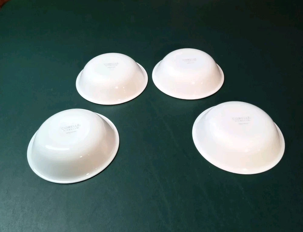 Enhance your dining experience with this set of four Corelle Garden Get Away fruit/dessert bowls. The round glass bowls feature a shiny finish and black trim, making them perfect for all occasions. Measuring 5-1/4 inches in diameter, these bowls are ideal for serving fruits, desserts, and other dishes. Crafted in the United States, these original Corelle bowls are made of high-quality glass Vitrelle material that ensures long durability. The set includes four bowls, making it perfect for family dinners or large gatherings. These bowls are in good used condition with no chips or cracks. See photos.
