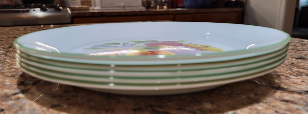 Elevate your dining experience with the timeless elegance of Corelle's Summer Blush luncheon plates. Each plate in this set of five showcases a delicate array of multicolor pastel florals and pansies, bringing a touch of nature's beauty to your table. Crafted from durable glass, these plates are not only decorative but also highly functional, designed to withstand the rigors of daily use. With a generous 9-inch diameter, they provide ample space for your favorite salads and lunch dishes. Their glossy finish and fused glass production style ensure a sleek, seamless appearance. These plates are stackable for easy storage, microwave and dishwasher safe, and can be gently machine washed at up to 140°F to maintain their charm. Whether for everyday use or special occasions, these Corelle plates are a testament to classic American craftsmanship. Excellent condition set of plates! Add them to your kitchen. Great for replacements, daily use or display!