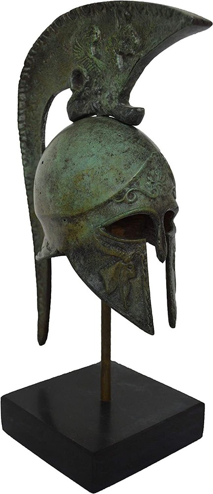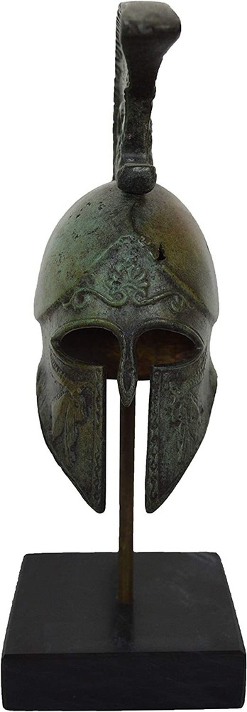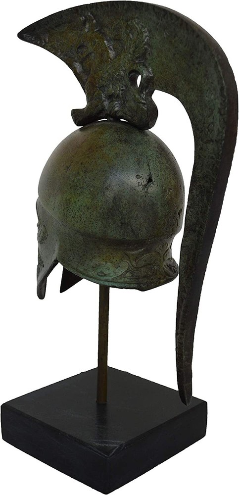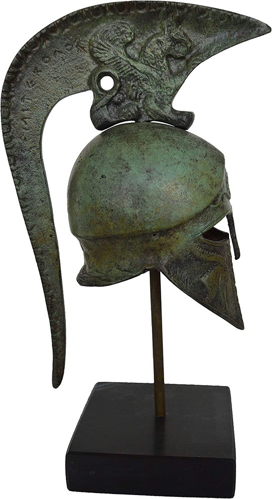 CORINTHIAN PURE BRONZE MINI HELMET This is a smaller size replica of an ancient Corinthian style helmet made with bronze material like the originals. The Corinthian helmet type is one of the most immediately recognizable types of helmet, romantically associated with the great heroes of Ancient Greece, even by the Ancient Greeks themselves who rapidly moved to helmet types with better visibility, but still depicted their heroes in these helmets. It was a helmet made of bronze which in its later styles covered the entire head and neck, with slits for the eyes and mouth. A large curved projection protected the nape of the neck. Out of combat, a Greek hoplite would wear the helmet tipped upward for comfort. Originals of these can be seen in museums across the world, but the prototypes are in the Olympia museum in Greece. The griffin is a legendary creature with the body, tail, and back legs of a lion, the head and wings of an eagle and an eagle's talons as its front feet. As the lion was traditionally considered the king of the beasts and the eagle was the king of the birds, the griffin was thought to be an especially powerful and majestic creature. The griffin was also thought of as king of the creatures. Griffins are known for guarding treasure and priceless possessions. In Greek religion and mythology, Aigis- Goat is the "Sigil" of Pan god of the wild, shepherds and flocks, nature of mountain wilds, hunting and rustic music, and companion of the nymphs. A hoplite was the most common type of heavily armed foot-soldier in ancient Greece from the 7th to 4th centuries BCE, and most ordinary citizens of Greek city-states with sufficient means were expected to equip and make themselves available for the role when necessary. Hoplites were instrumental in Greek warfare and the victories of Greek armies over Persia at the battle of Marathon (490 BCE) and the battle of Plataea (479 BCE) during the Greco-Persian Wars. All our bronze items, are cast in Greece, using the traditional 'lost wax' method. As nothing is mass-produced, there will inevitably be slight variations in patination and colouring. Each piece is, therefore, unique.(28-572-B) Details: Condition: New, Handmade in Greece Material: Pure Bronze Height on marble base: 21 cm(8.2 inches) Width : 5.5 cm(2.1 inches) Weight : 850 g