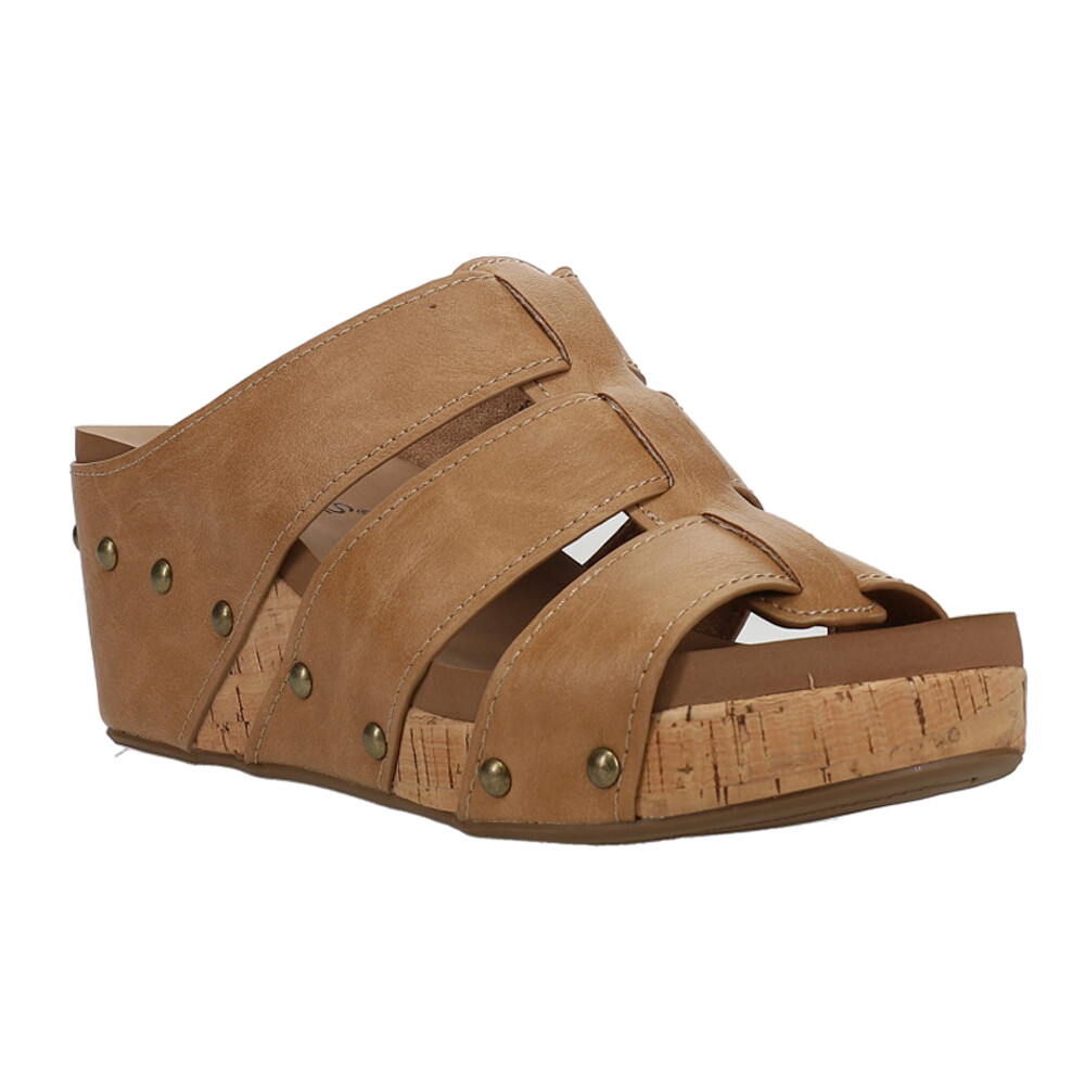Catch of the Day Studded Wedge Sandals Product Details Faux leather upper Slip on Padded insole for extra comfort Rubber outsole These are the sandals we have been waiting for! These Catch of the Day are going to be perfect for a night out and give your outfit that extra bling! Additional Details Color: Brown Occasion: Casual Gender: Womens Age: Adult Brand: Corkys