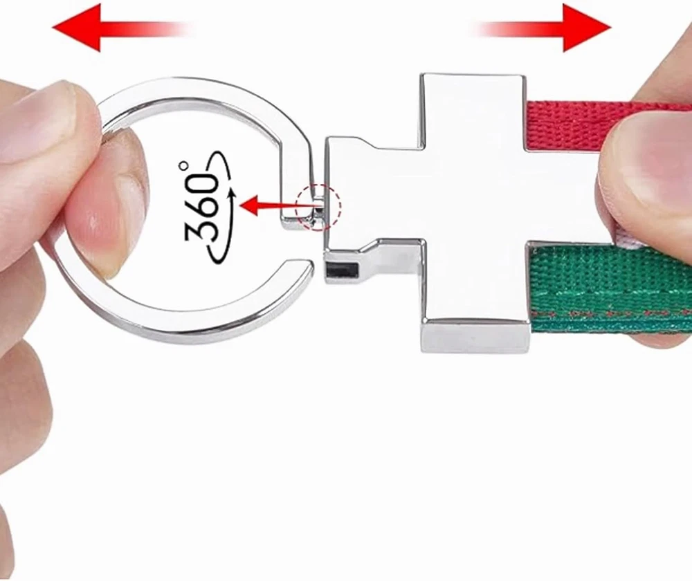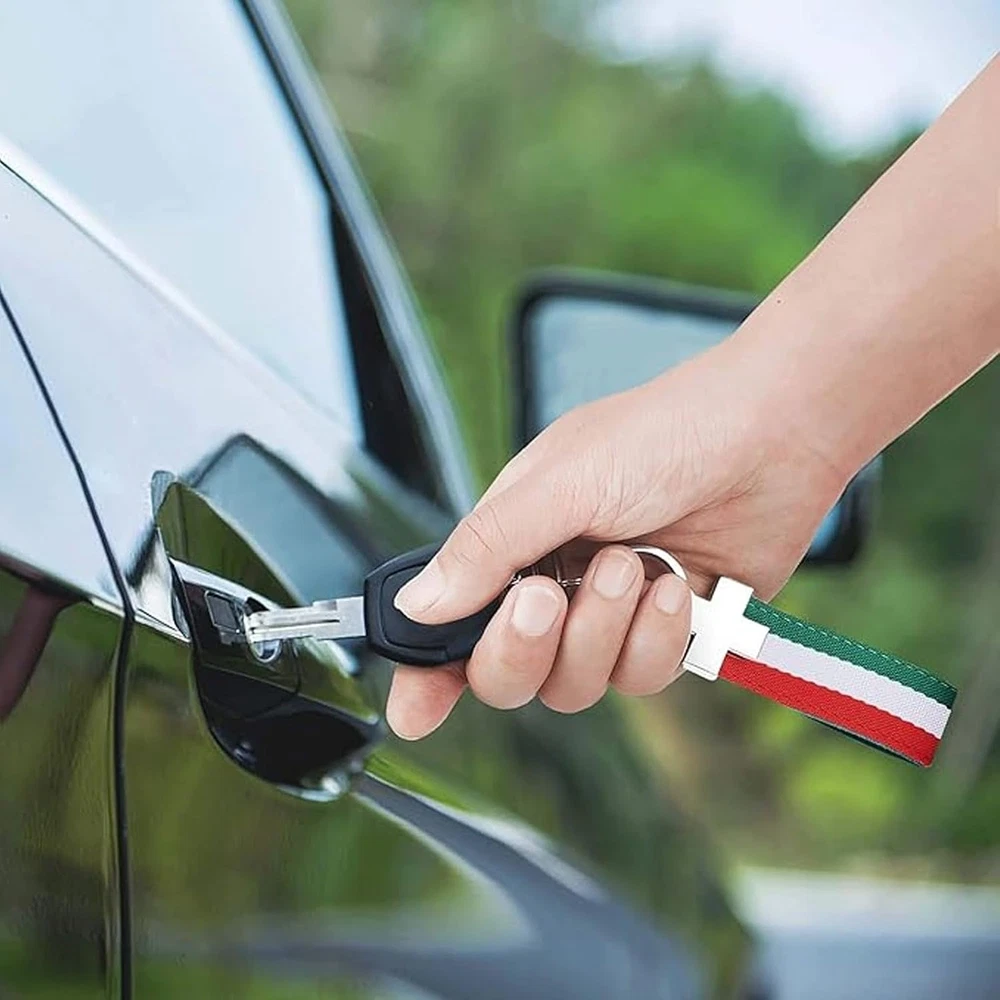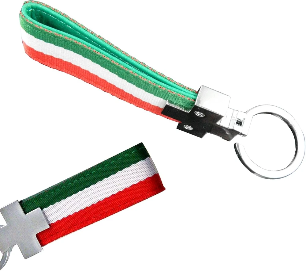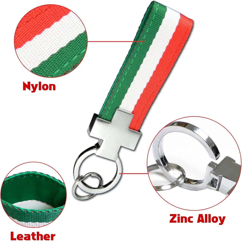 Product Description Xotic Tech 1 piece of high quality Italian Flag color stripe keychain. This coated canvas keychain is all about the Italian heritage, with finely crafted leather and nylon combo on top of chrome plated hardware. This Italian Flag color stripe keychain is a perfect complement for your Italian made vehicles and extremely durable for everyday wear and tear, making it the must-have personal accessory. Style: Italian Flag 3 color stripe Size: 4.75" x 1.25" The metal part is made with high quality chrome finish alloy metal. The band is made with nylon with leather inner surface. Note: Key and accessories are not included.