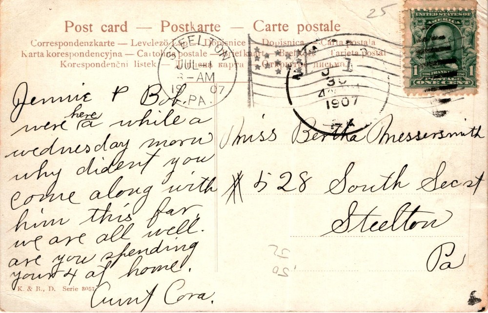 The postcard is a Correspondenzkarte (German for correspondence card) with translations in several languages. It mentions the location nice which could refer to the city of Nice in France. The postcard also includes a date of 1907 and references to individuals named Jennic, BuPA, and Messersmith.
