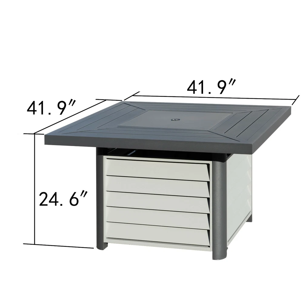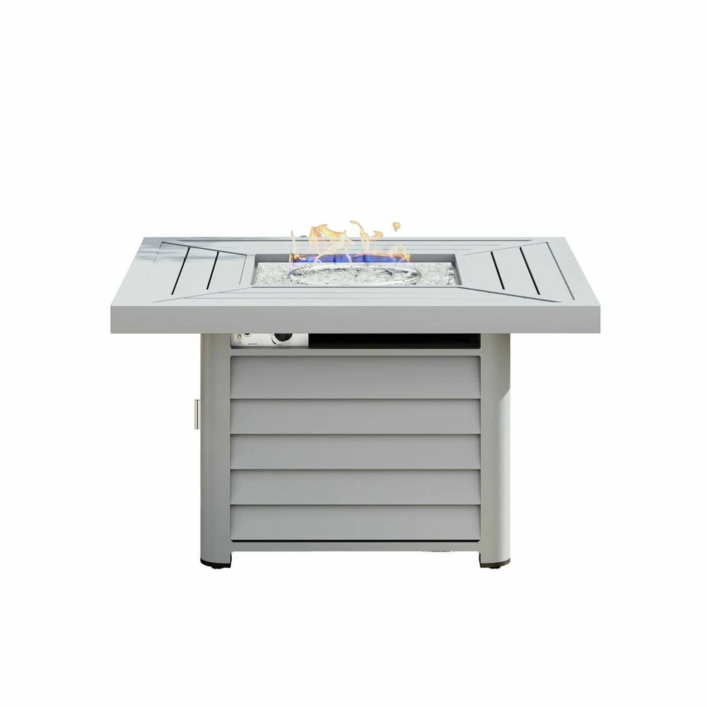 Corvus Abruzzo 42 Inch Square Aluminum Propane Fire Pit Table Product Description: Add your outdoor warmth with Abruzzo square aluminum propane fire pit table by Corvus. Linear design of fire pit table top endow your outdoor space with a warm addition on chilly weather. Made of aluminum slat, table top and table base is light weight in construction which is corrosion-resistant in inclement weather. Stainless steel fire bowl with lid included makes it stable in outdoor space for all seasons, of which provides 50,000 heating capacity for warmth. The propane tank can be placed and concealed under the table with easy access through a door. Features All powder coated aluminum frame Stainless steel Fire bowl 17.6 lbs of fire glass included Glass window is not included 50,000 BTU LPG regulator and hose included Fuel type Propane or natural gas CSA certified for safety and ease of use Propane tank door for easy access 17lb. transparent glass breads are included Recommended use with 20 lb. liquid propane tank (not included) Dimensions: Fire pit table41.97 inches wide , 41.97 inches deep , 24.61 inches high Bowl size13.7 inches x 13.7 inches Weight 42.9 pounds 82-4E