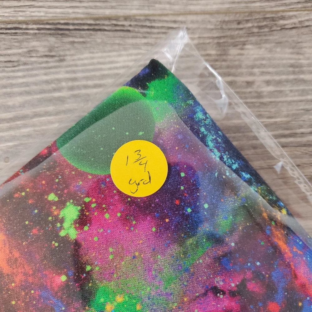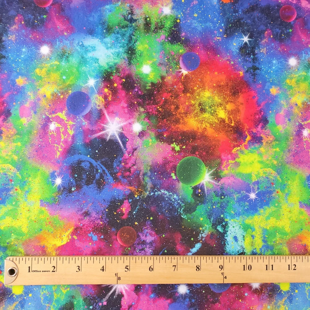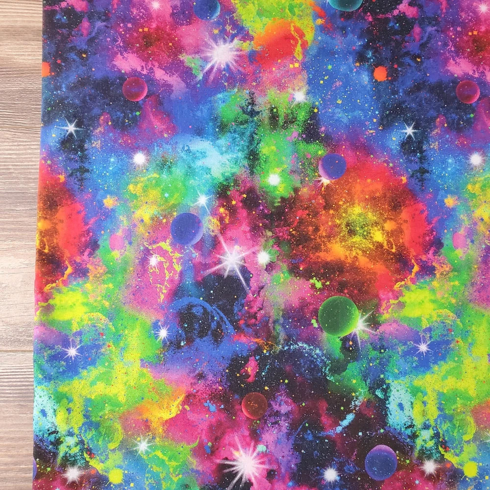 Cosmic Celestial Space 1 3/4 yards (63") Space Planet Celestial Rainbow Cotton Quilt Fabric Single Piece measures 63" or 1 3/4 yards Fabric has been washed without detergent and dried and cut. It is unused and in excellent condition. Selling off my large collection of fabric. All fabrics were purchased new and prewashed upon receiving FABRIC has been pre-washed Width is standard for the print 40" or wider Contents: 100% Cotton Care: Machine Wash/Tumble Dry Low