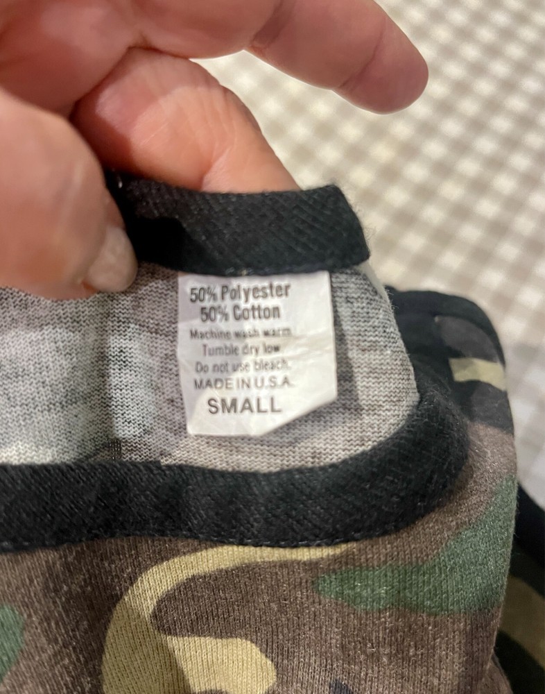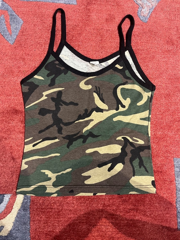Slim and sexy fitting 50% cotton/50% polyester blend fabric in a tasteful camouflage print. This is not a knitted top, so it has no give and will only fit a slim torso. The straps and neck are a tight black knit. The front has a deep scoop and is slightly lower than the back. The top can be machine washed and tumble dried - low heat and is made in the USA. This top is from the 80's so it's vintage and won't be found in stores today. It's a cool piece of clothing to add to someone's summer wardrobe. Measurements: Top of straps to hem = 19" Arm pit to armpit = 14" with very little stretch Front scoop to hem = 13 (cropped style) Back to hem = 15"