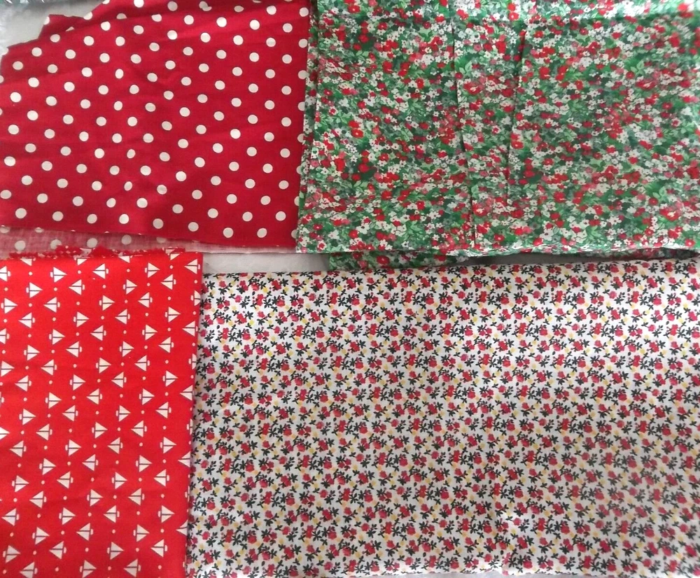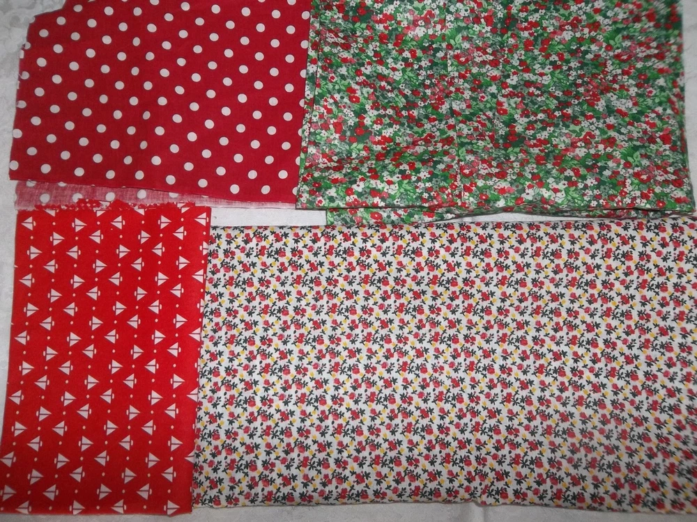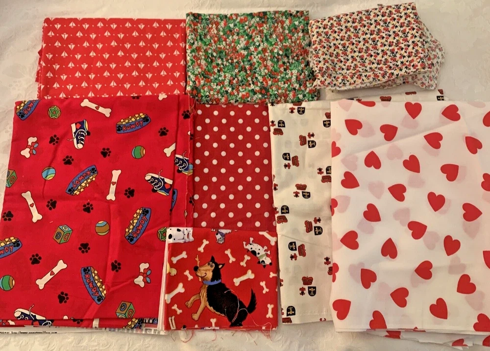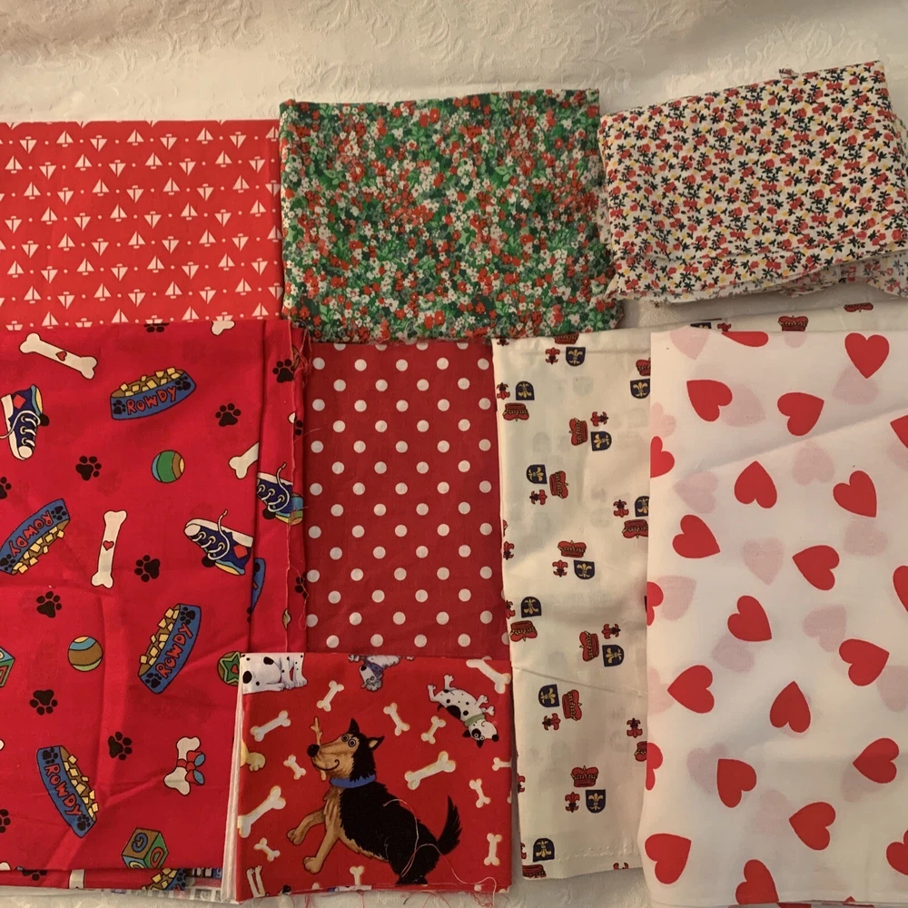 Fabric: Lot of 8 Fabrics all red prints Timeless Treasures red dogs print 9 x 44" Red Dog theme toss print Dream Spinners 2 yards x 44" white with red hearts irregular shape pc. less than a yard Fleur de lis print red on white 1 yard x 44" red white polka dot 2 pieces 19 x 8" red with white sailboats 19 x 32" red and green mini floral 24 x 25" plus odd extensions red floral on white 2 pieces 22 x 17" plus 7 varying size usable scrap A STASH BUILDER! Good amount for the price. Attractive prints. Pre-owned, but new - never used, from an estate stash. Will combine ship with other fabric lots. .