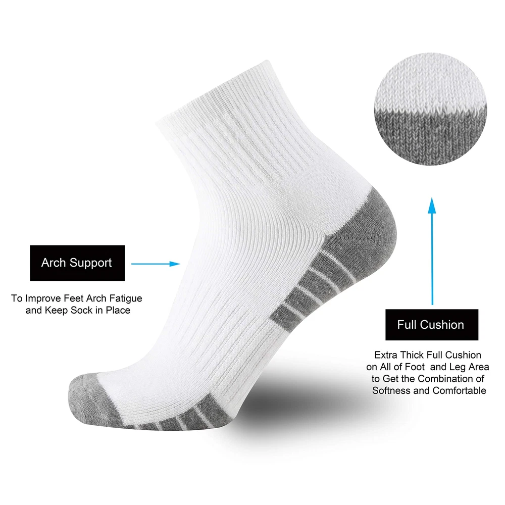 cushion low cut socks made with the premium cotton and polyester blend.The fibers is lightweight that provide superior Moisture Wicking properties and Mesh Construction design,The fabrics can transport moisture away from your feet and create airflow within the fabrics, which keeps your skin breathable and your feet cool and dry ,it provides a breathable Comfy and Cozy feeling. The toe and heel of the socks are reinforced for both durability and relaxation,It provides ultimate comfort and durability for a tough job, extreme outdoor adventure or athletic sports.It helps you avoid blisters during your daily work or outdoor activities. These Socks are Great for: • GYM • Hiking • Tennis • Running • Cycling • Trekking • trainning • Camping • Climbing • Athletics • Outworkers • Backpacking • Everyday Use • Steel Toe Boots • Mountain Biking • Work Boots Socks • Heavy Duty Socks • Aerobic Exercises • Outdoor Activities etc Wash Instruction: • Suggest machine & hand wash. • Tumble dry or air dry. • Don't iron. • Don't bleach. • Don't soak socks in hot water or suds for a long time. Why Choose Brand Socks? brand owner has more than 15 years experience in sock design and manufacturing,Since we started in 2003,we keep an eye on the higher quality. We have listened to customer feedback to give you value-added sox!It's our way of ensuring you get your money is worth every time you buy from us. Money Back Guarantee: We stand behind our cushioned socks with a money back guarantee. If you have any questions please feel free to contact us,we will solve your problem as soon as possible until you satisfaction. Premium Materials: Superior cotton and polyester blend, Use a spandex and nylon knitting to deliver a snug fit and retain shape even after repeated washings Soft Comfy:Full cushioning for ultimate support in any work boot or shoe. It helps you avoid blisters during your heavy duty work or daily activities Moisture Control: The advanced technical fibers wick away sweat and moisture. Moisture wicking properties to keep smell fresh and feet dry and breathable Durability: Nylon blend knitting provide added durability in high stress areas, it avoids holes dramatically, more protection in most extremely environment Performance: Deep heel and elastic top ensure the sock fits the contours of the foot so perfectly, super stretchable and boost blood circulation easily